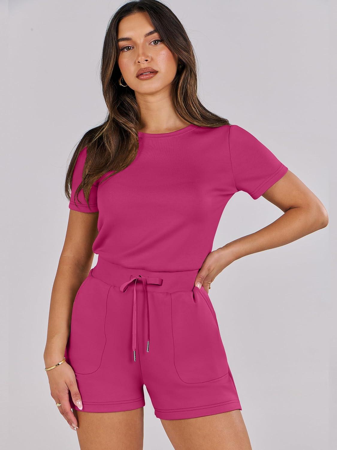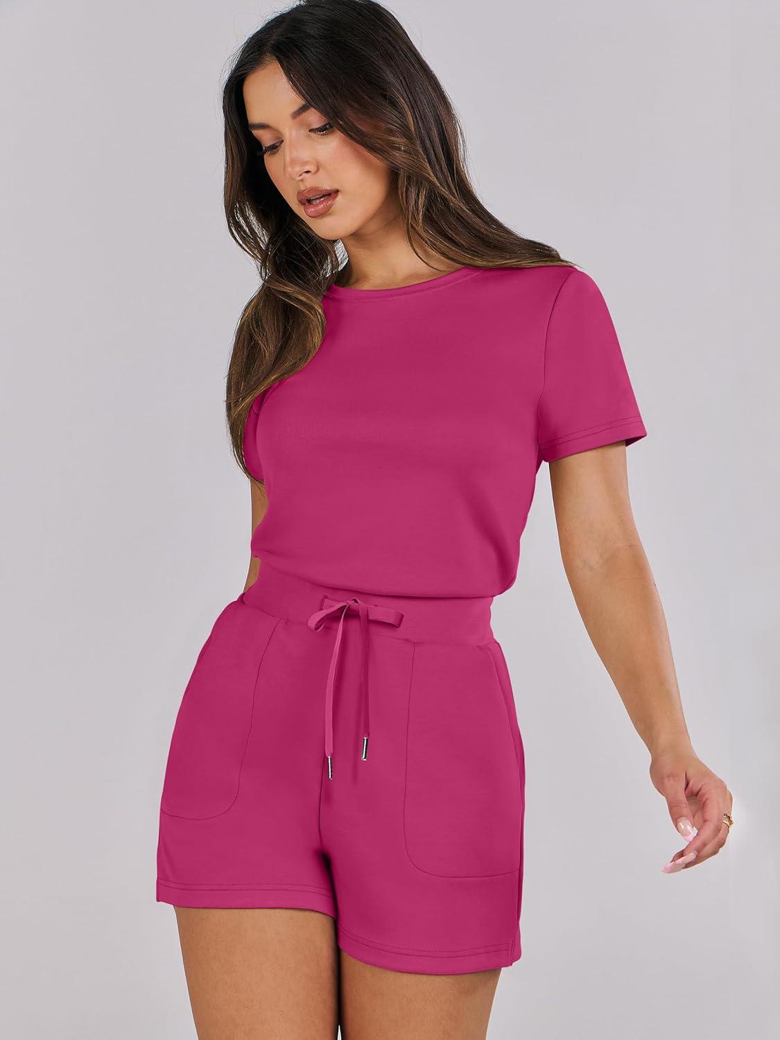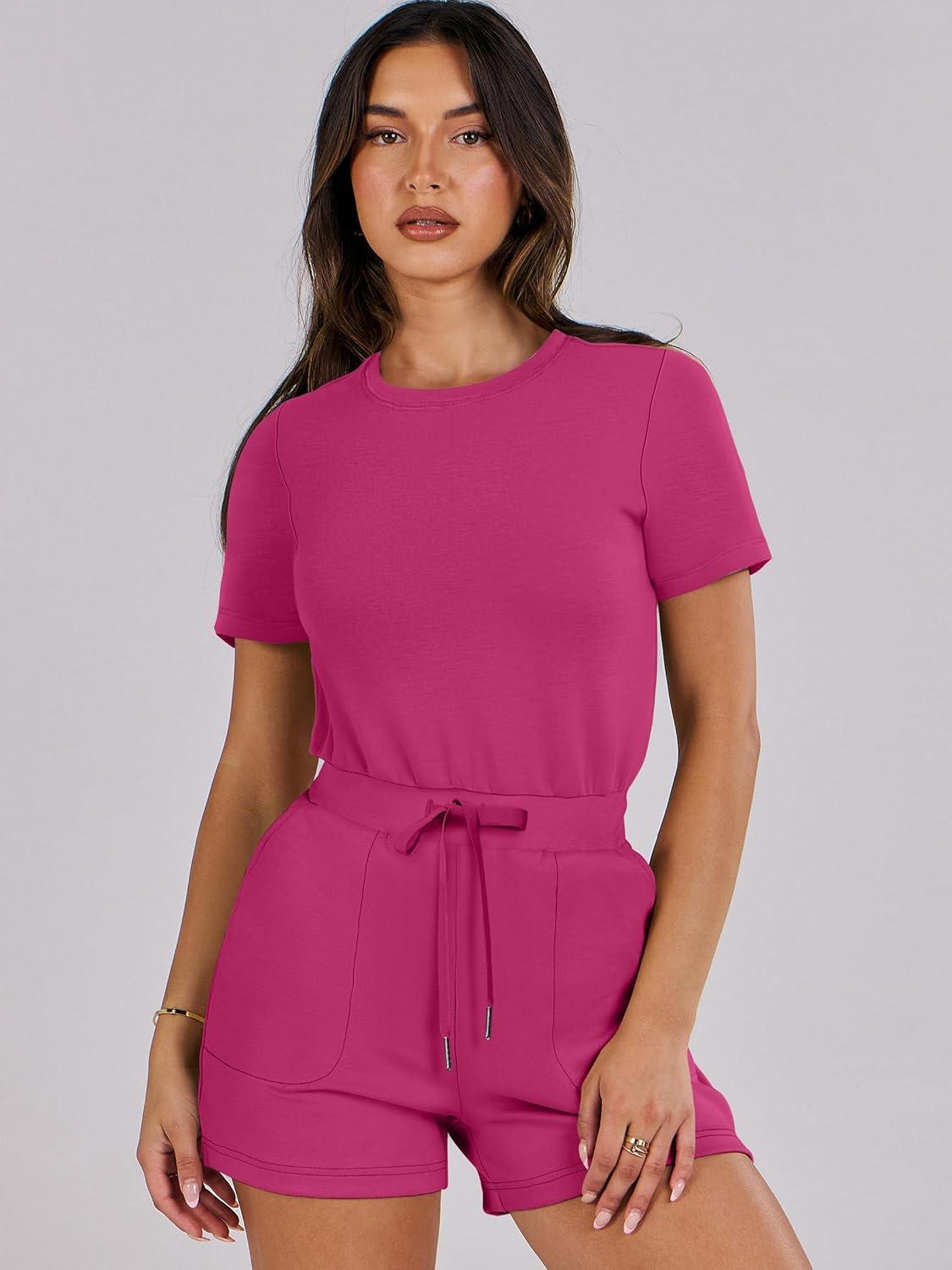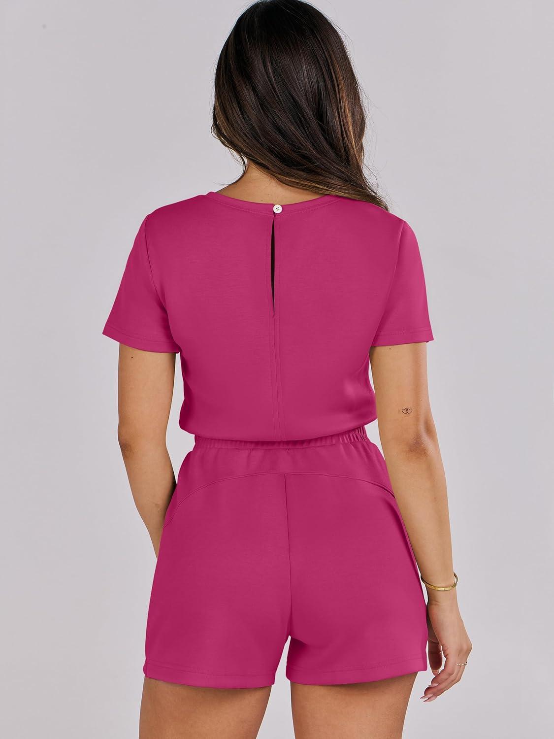 ANRABESS Romper for Women Short Sleeve Summer Tshirt One Piece Jumpsuit Beach Vacation Travel Outfits 2025 Dressy Clothes(Hot Pink)