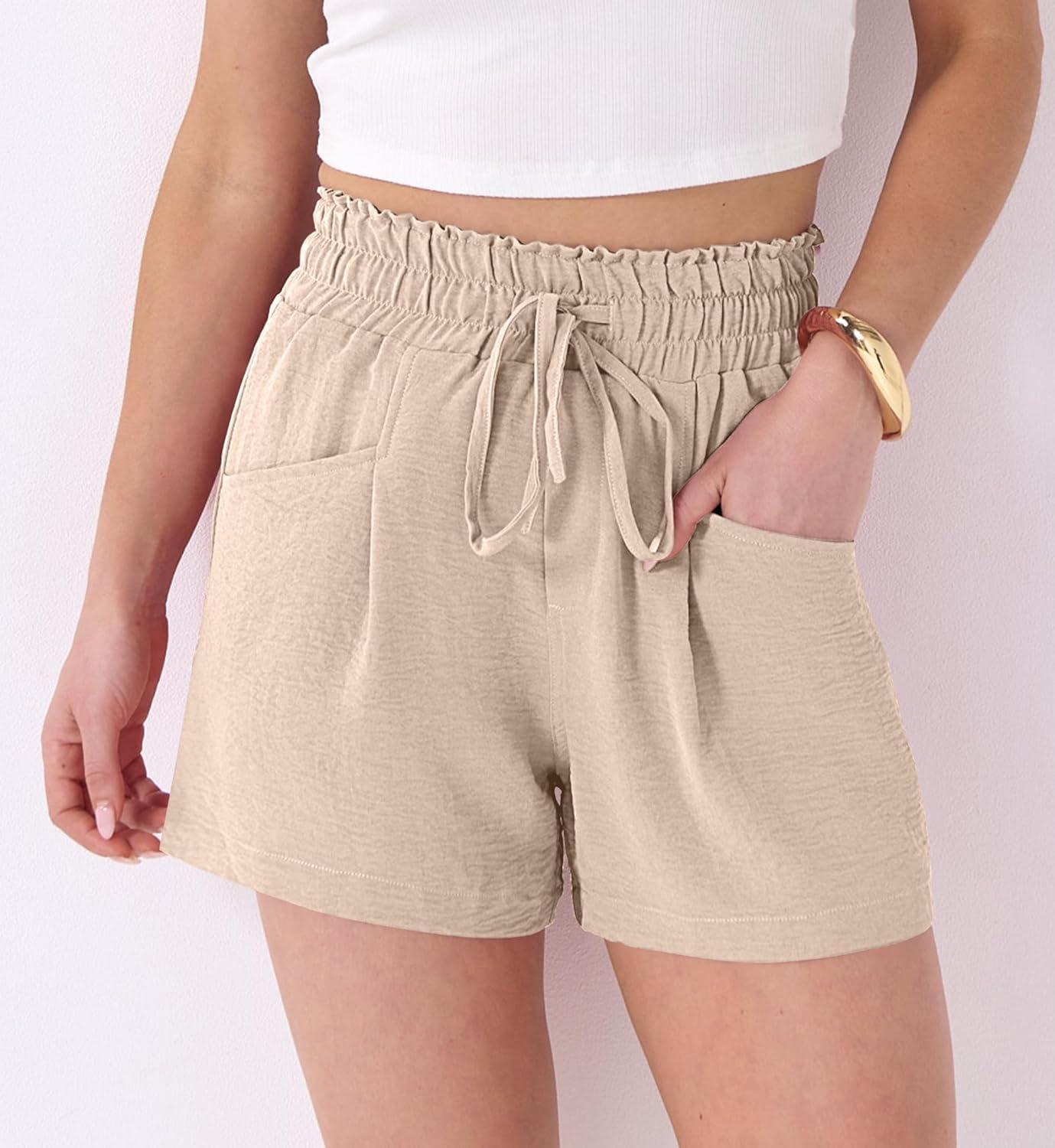 This high waisted women's summer shorts feature an elastic waistband, drawstring, wide leg, and pockets design. It is suitable for summer, beach, vacations, walks, outdoor activities, and daily wear.