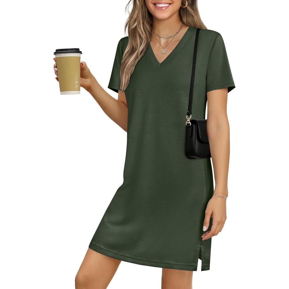 ANRABESS Summer Dress for Women 2026 Beach Vacation Clothes Short Sleeve V Neck Casual T Shirt Sundresses Travel Holiday(Army Green)