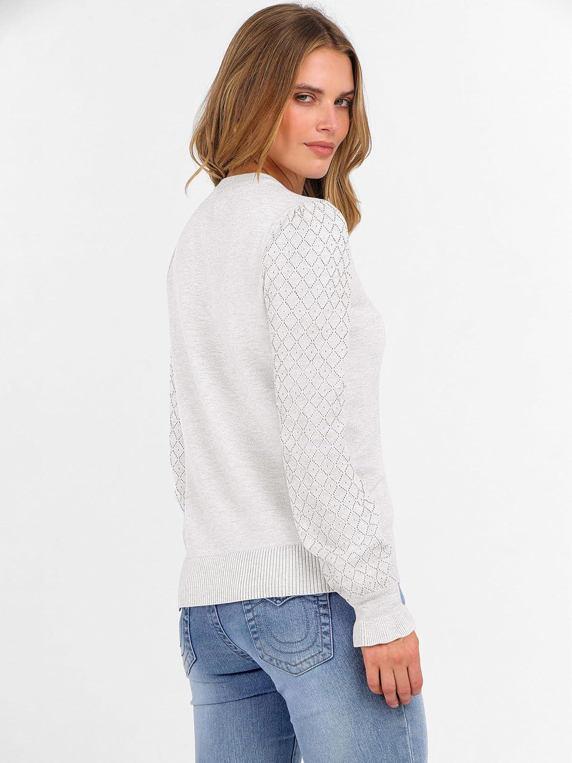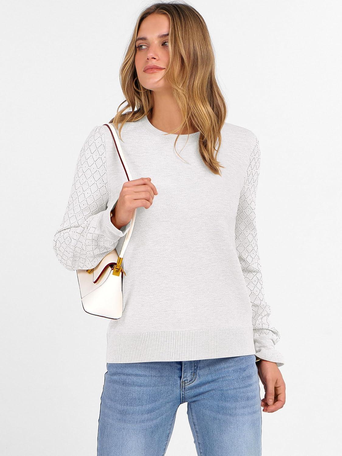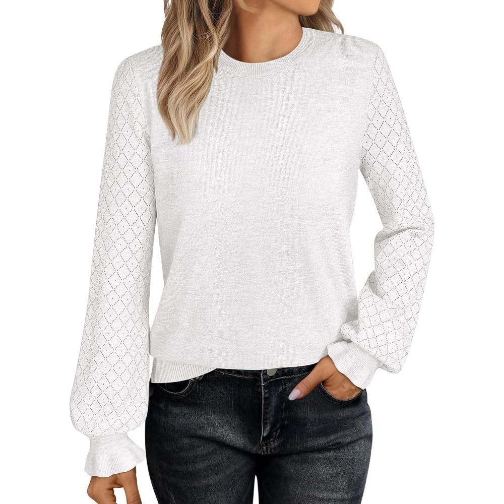 ANRABESS Sweaters for Women Lace Long Sleeve Tops 2025 Fall Dressy Casual Business Knitted Pullover Shirts Puff Cuffs Outfits(White)