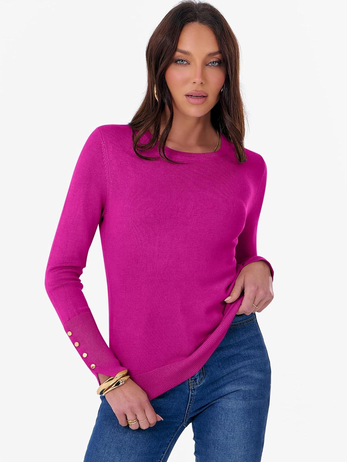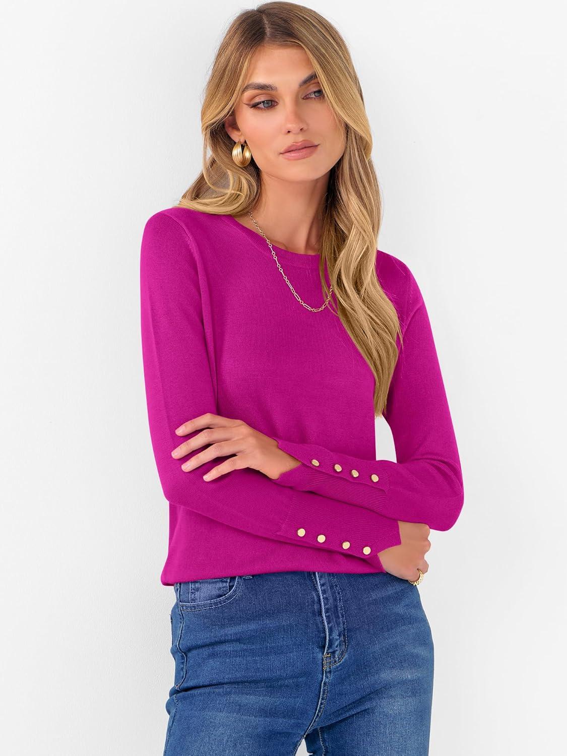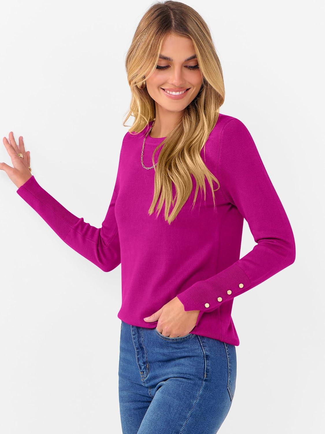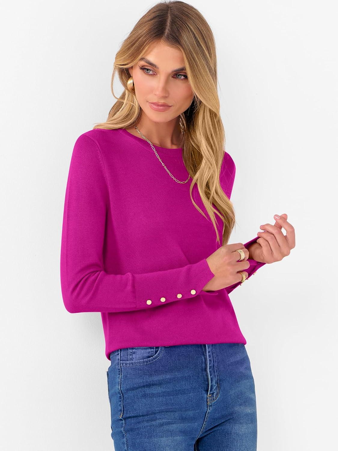 ANRABESS Sweaters for Women Long Sleeve Crewneck Fitted Business Casual Pullover Tops 2025 Fall Outfits with Button Cuff(Bright Plum Red)