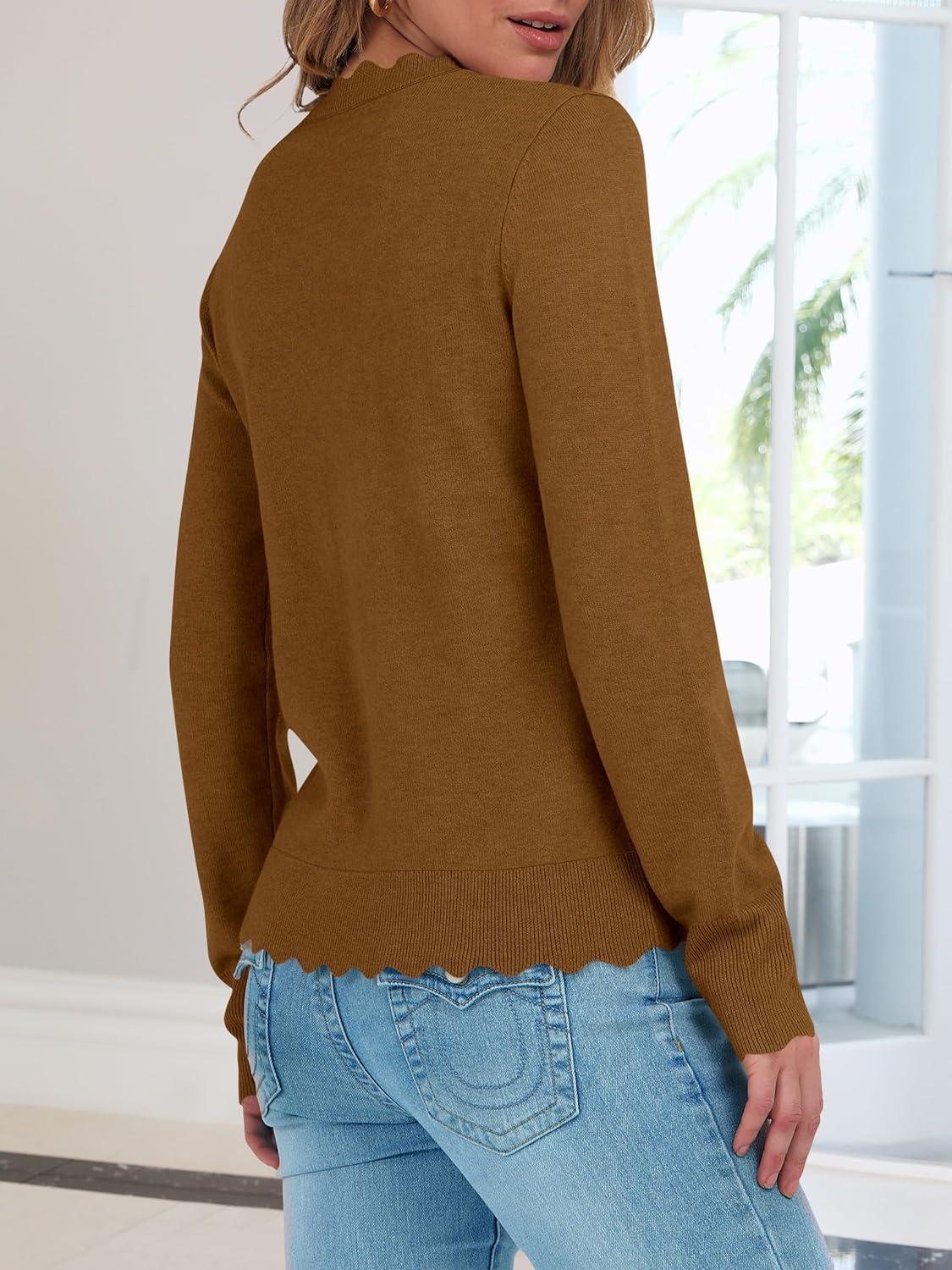 ANRABESS Sweaters for Women Loose Fit Lightweight Soft Dressy Scalloped Long Sleeve Pullover Tops 2025 Fall Casual Outfits(Brown)