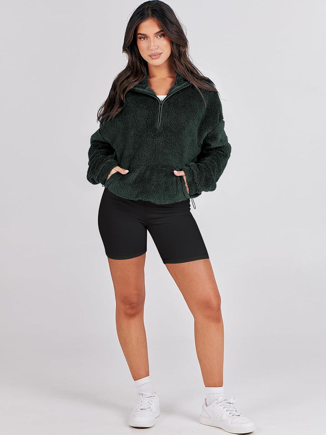 ANRABESS Sweatshirt for Women Zip Up Hoodies Cropped Pullover Fleece Hooded Sherpa Sweaters Tops 2025 Fall Winter Clothes(Dark Green)
