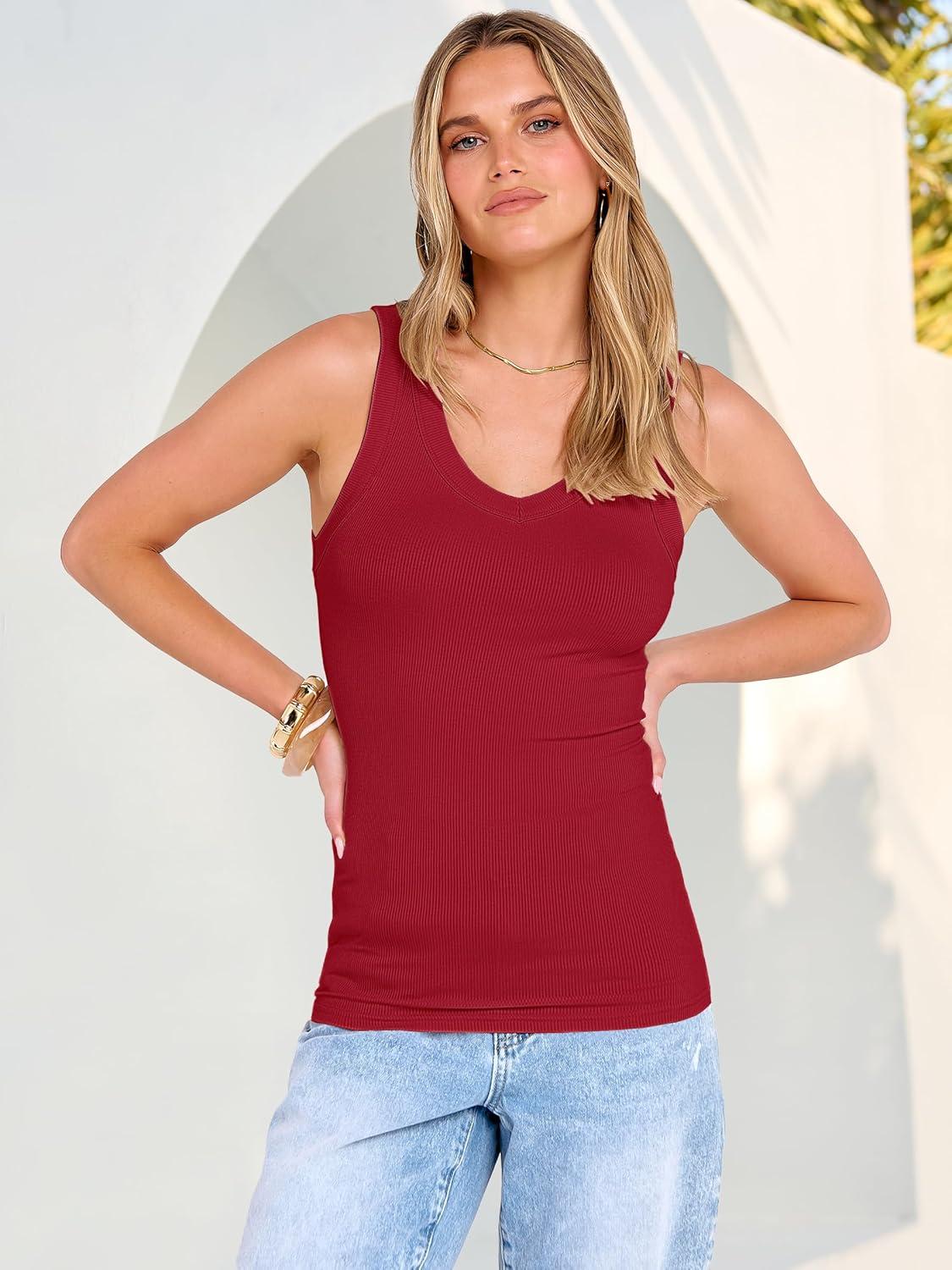ANRABESS Tank Tops for Women V Neck Ribbed Knit Slim Fitted Sleeveless Basic Tee Tanks Casual Summer Clothes 2026(Red)