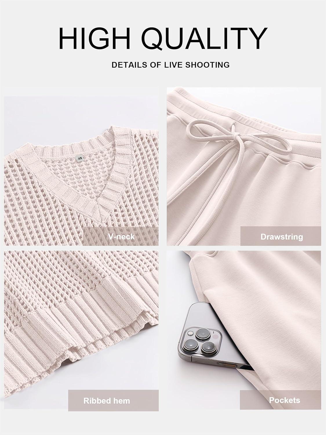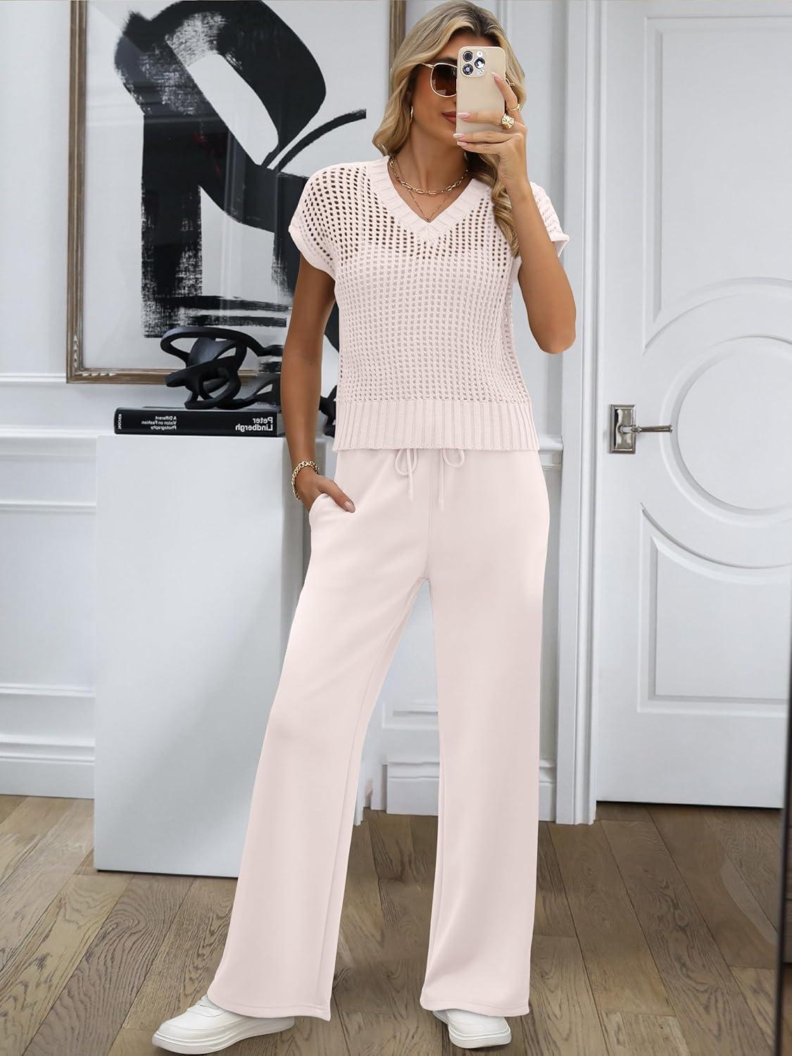 ANRABESS Women 2 Piece Lounge Sets Crochet Knit Sweater Vest Wide Leg Pants Summer Casual Travel Matching Outfits Clothes(Beige)