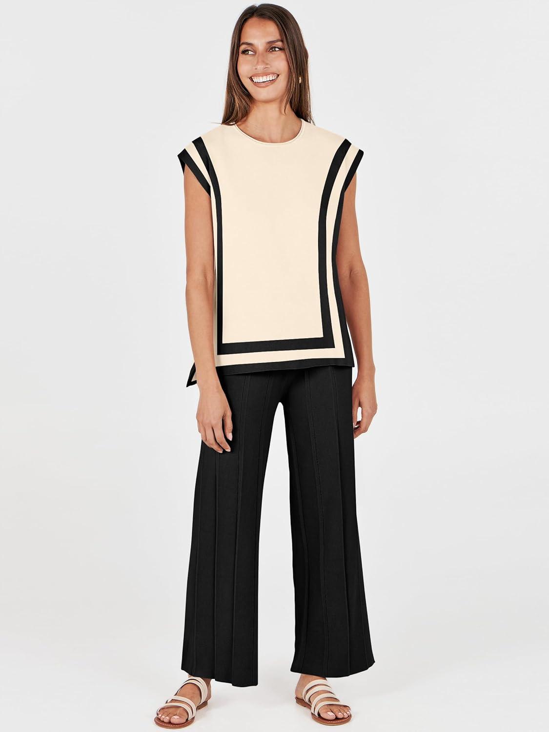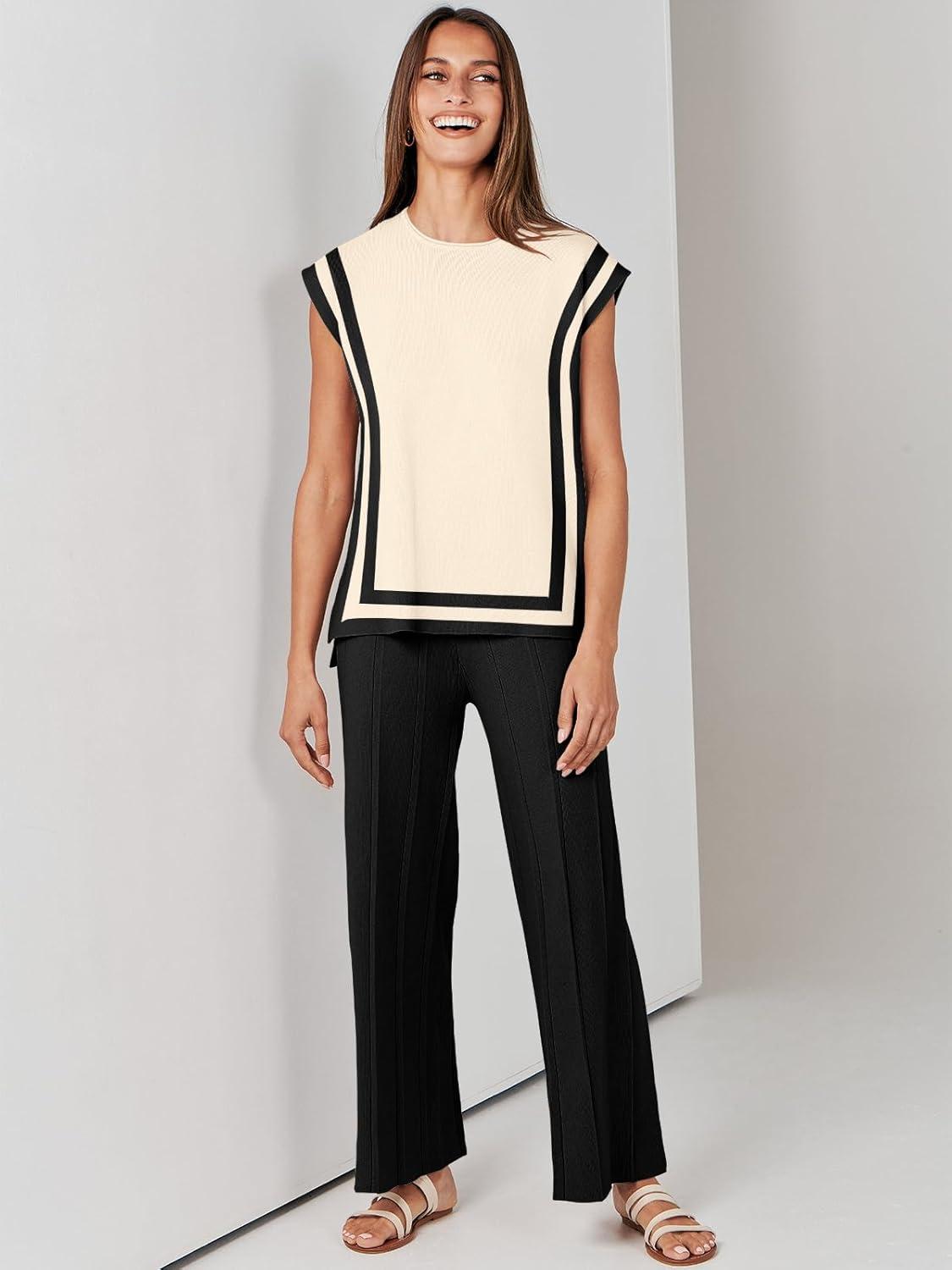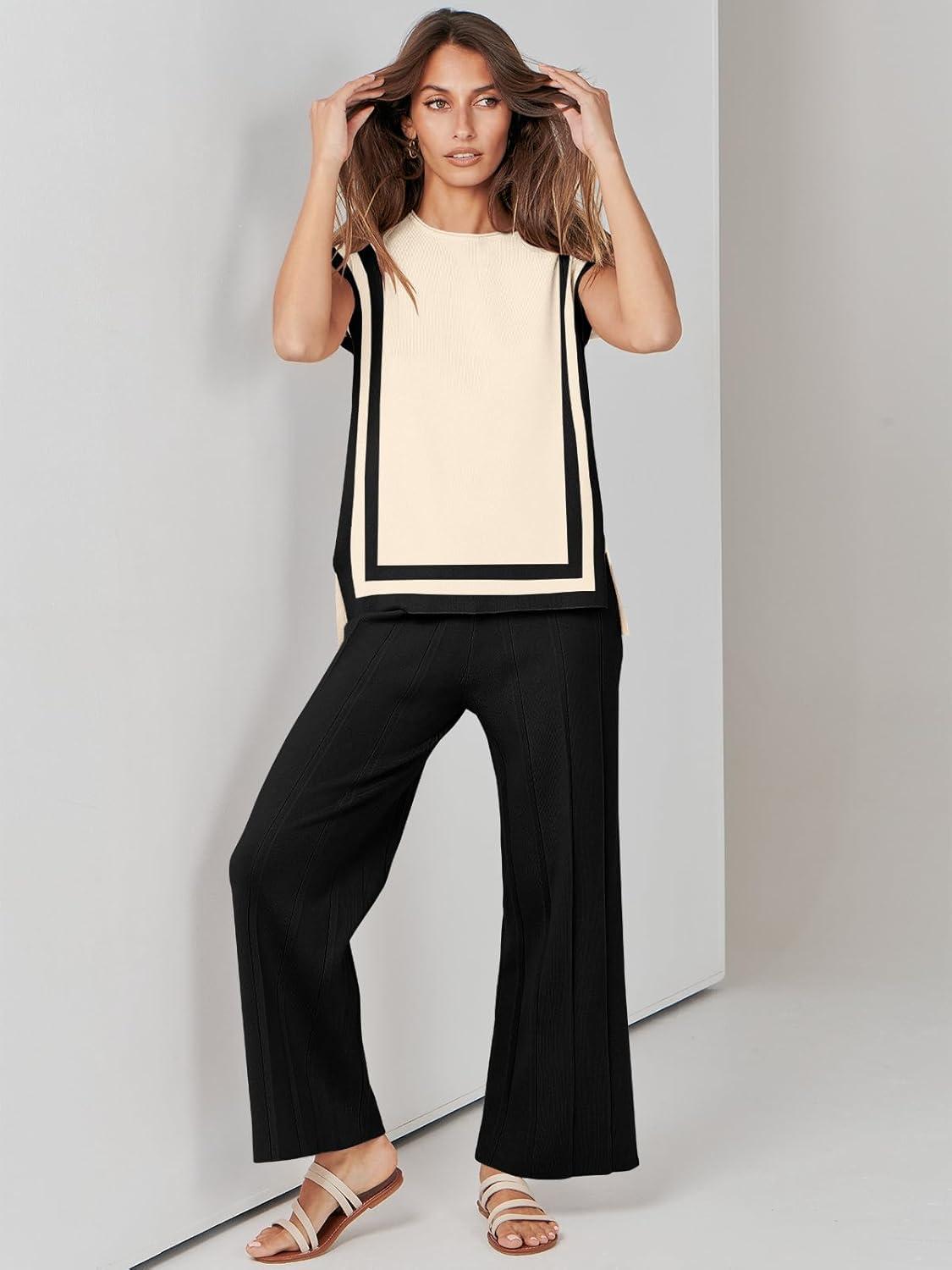 ANRABESS Women 2 Piece Lounge Sets Summer Casual Knit Sweater Vest Pant Set Beach Vacation Airport Clothes 2025 Fall Outfits(Apricot-black)