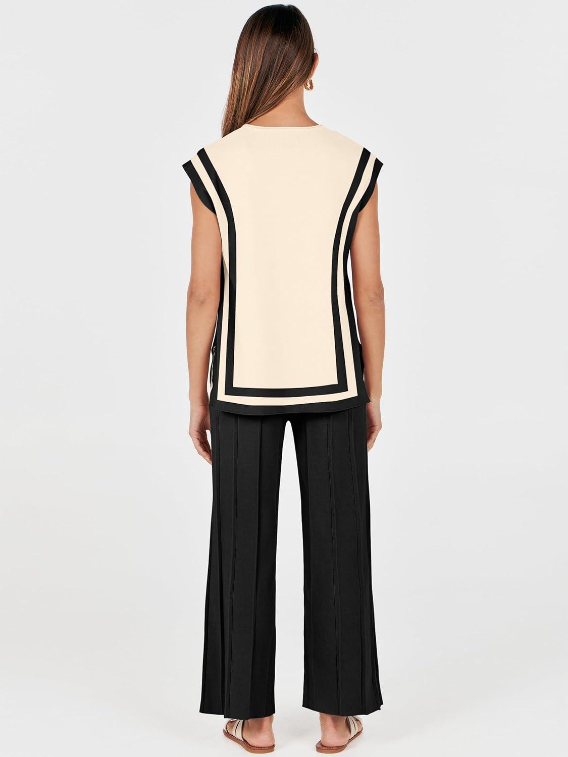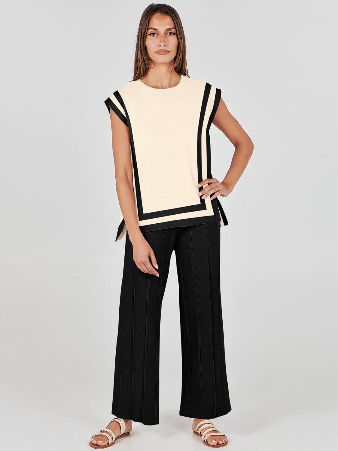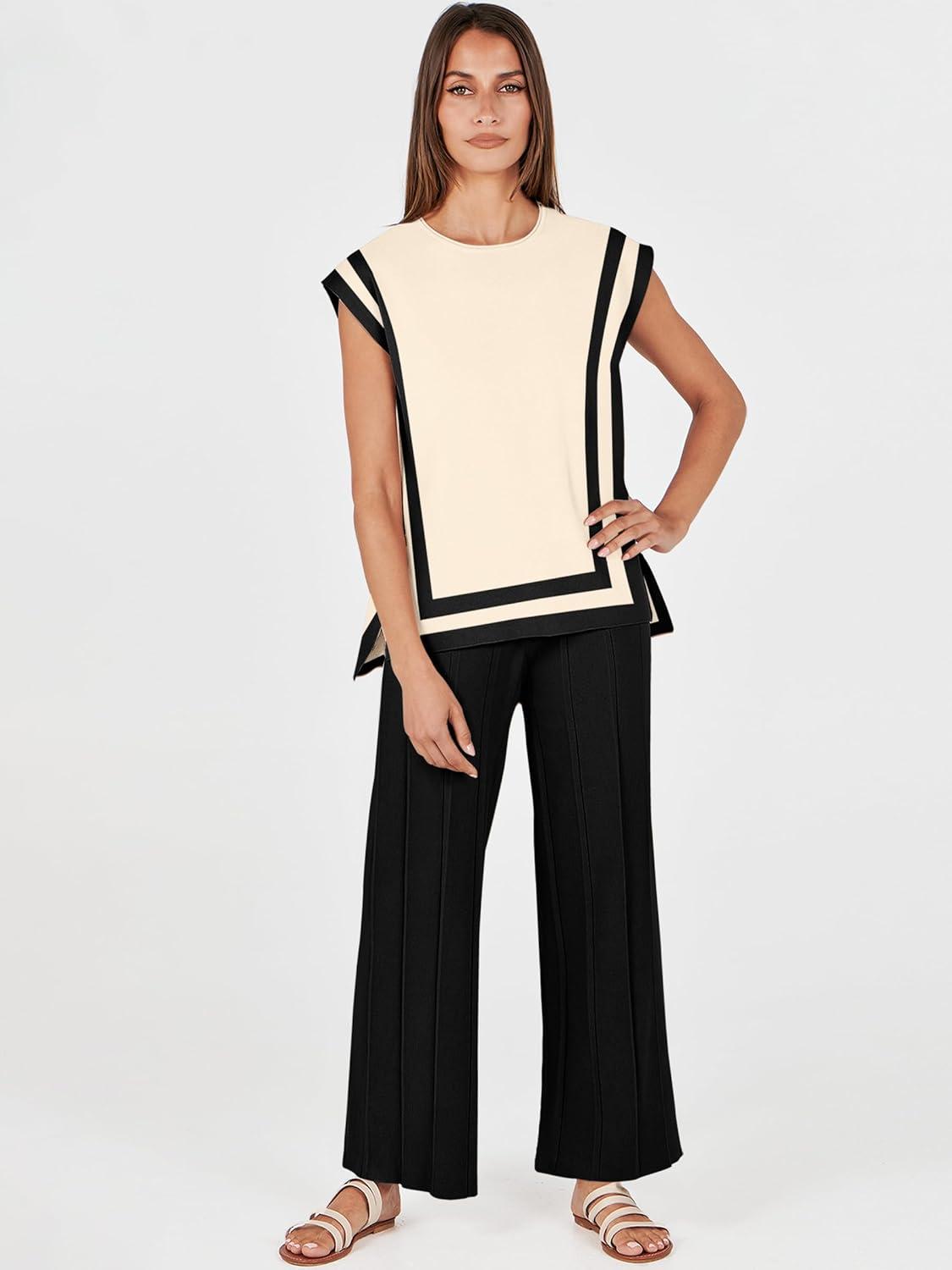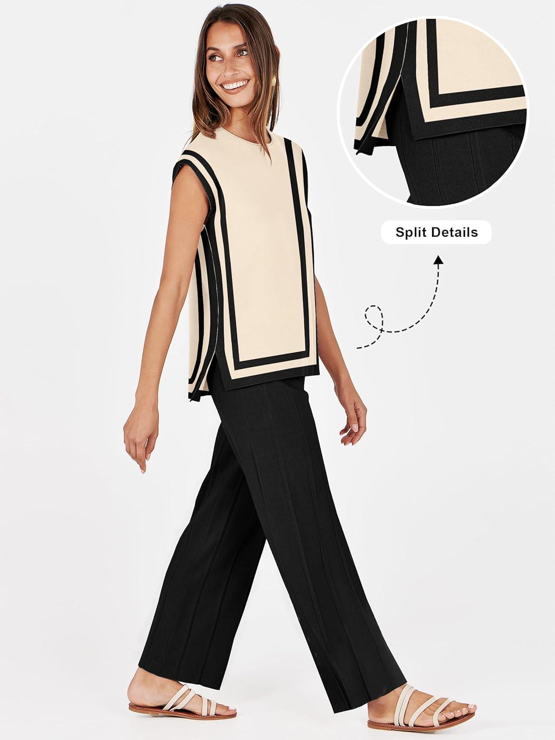 ANRABESS Women 2 Piece Lounge Sets Summer Casual Knit Sweater Vest Pant Set Beach Vacation Airport Clothes 2025 Fall Outfits(Apricot-black)