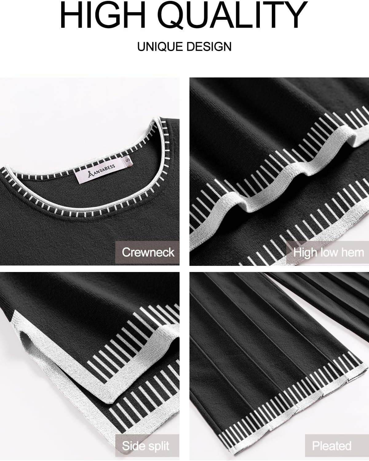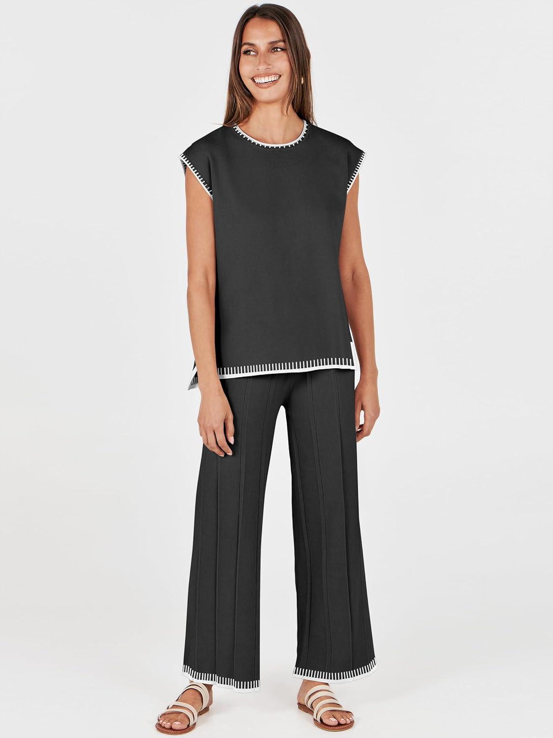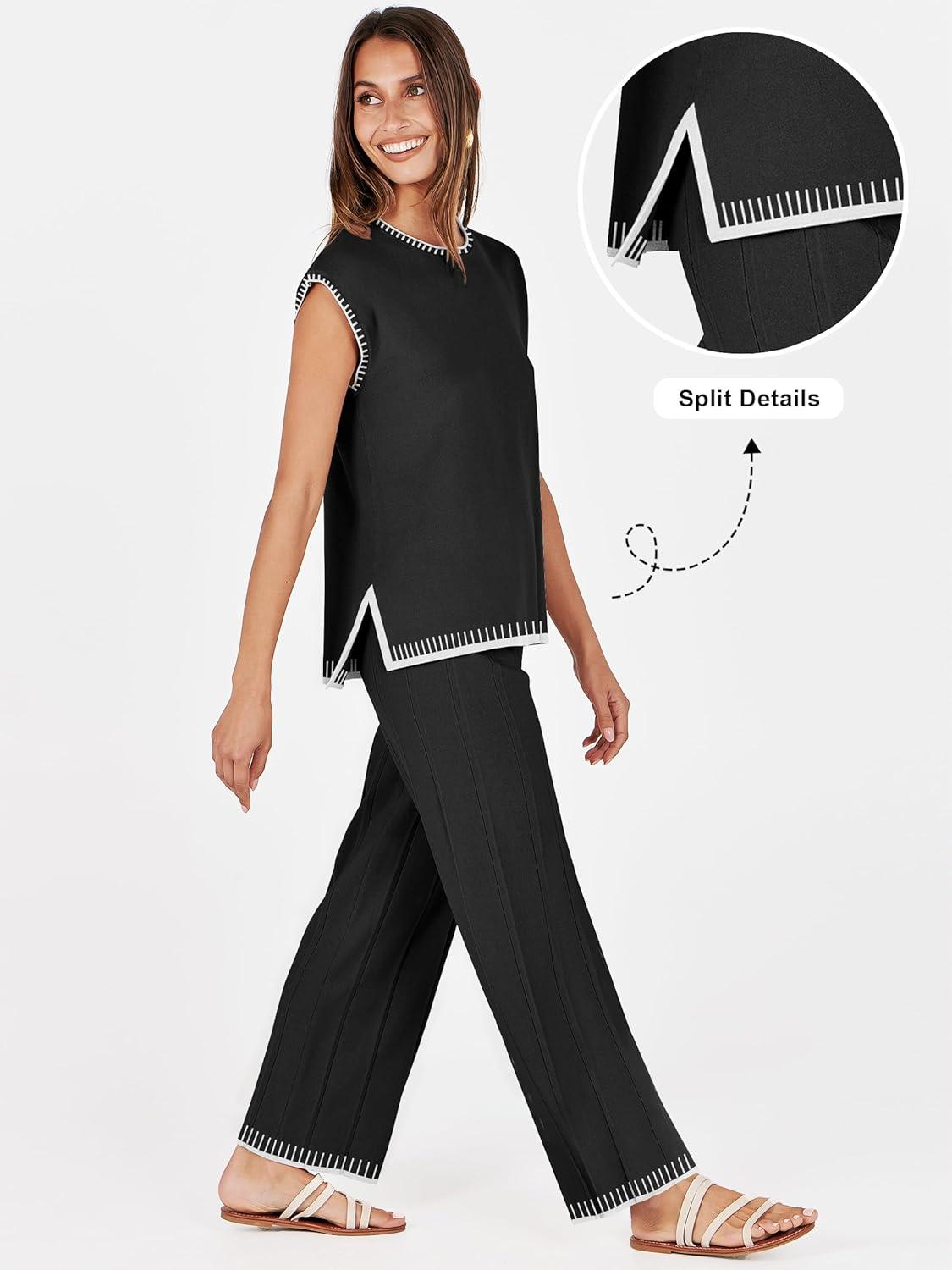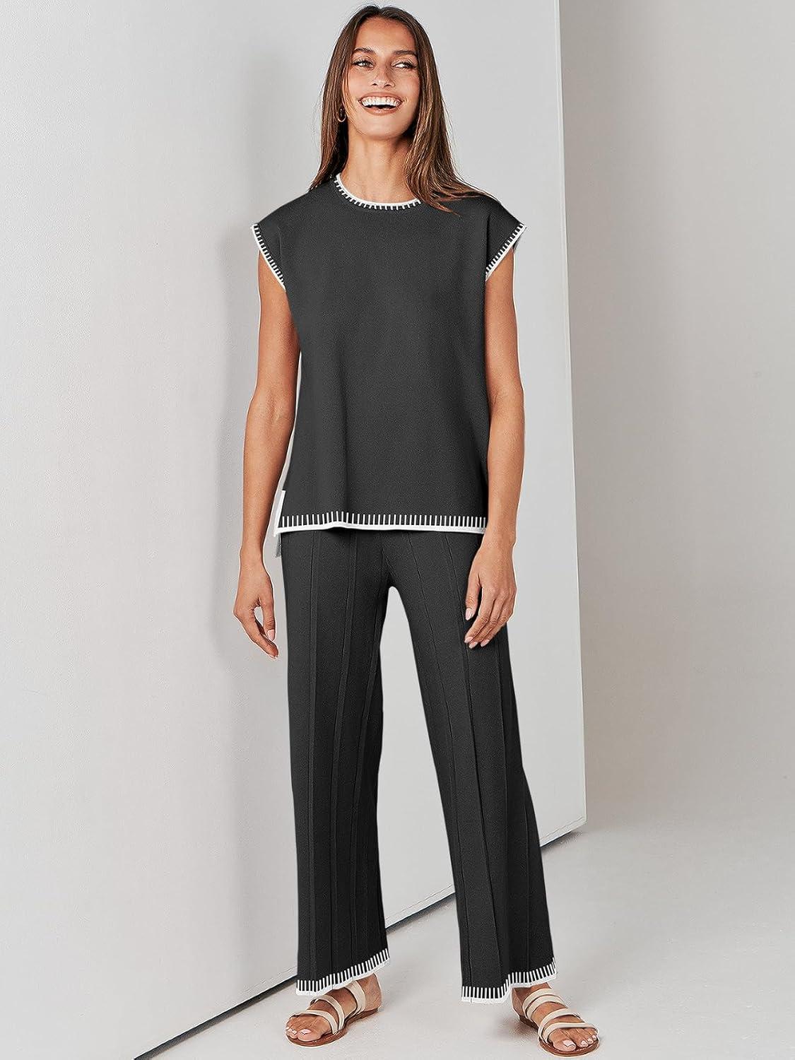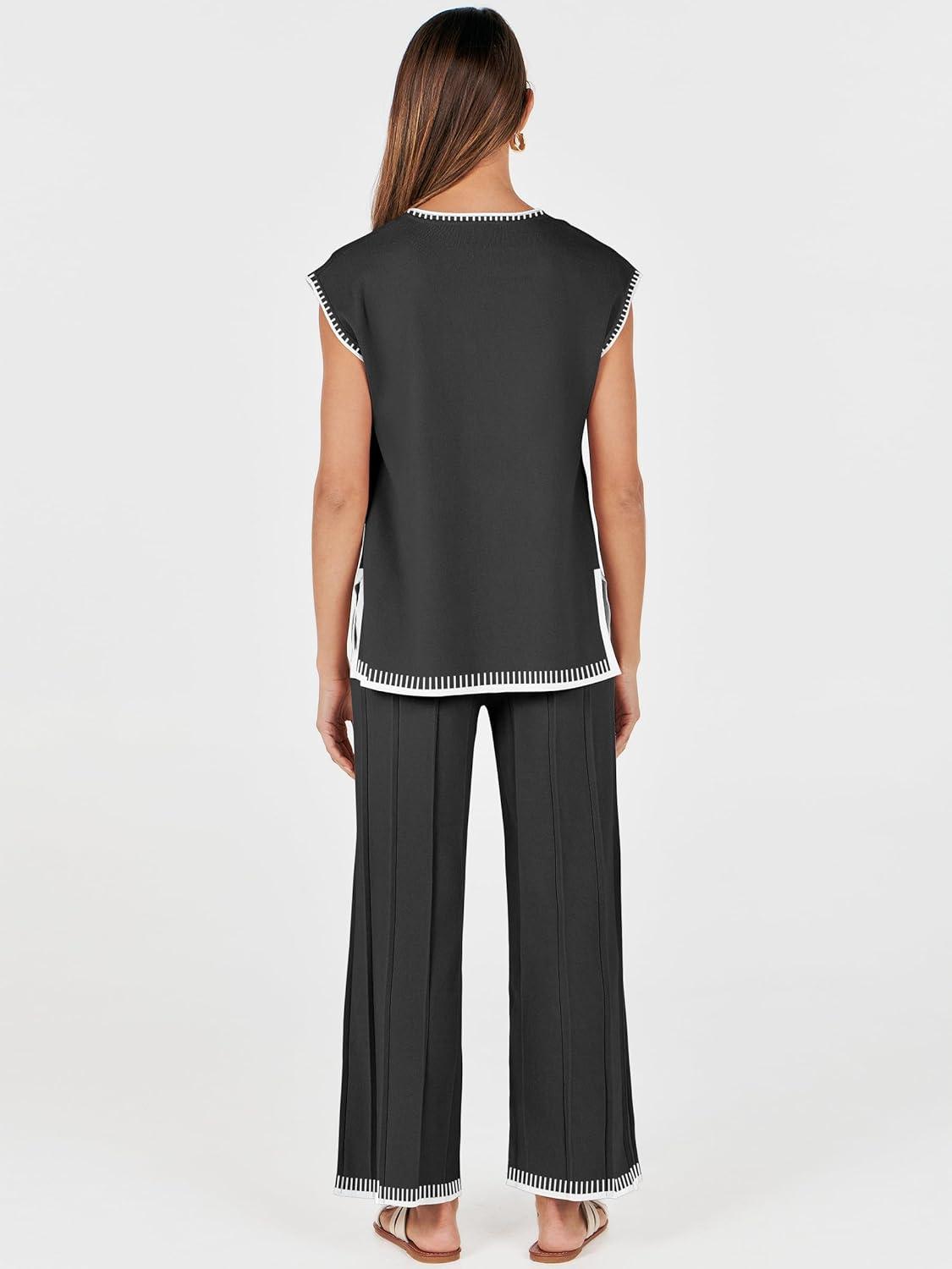 ANRABESS Women 2 Piece Lounge Sets Summer Casual Knit Sweater Vest Pant Set Beach Vacation Airport Clothes 2025 Fall Outfits(Black-white 02)
