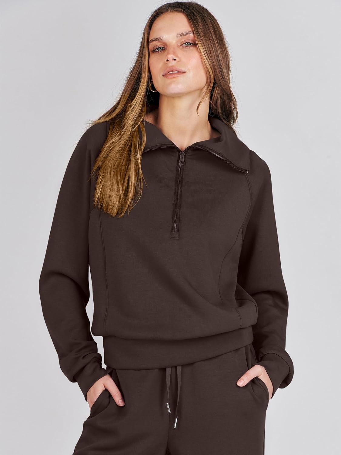 imageANRABESS Women 2 Piece Outfits 2025 Fall Fashion Airport Wide Leg Pants Lounge Set Leisure Travel Vacation Clothes SweatsuitsBurnt Brown