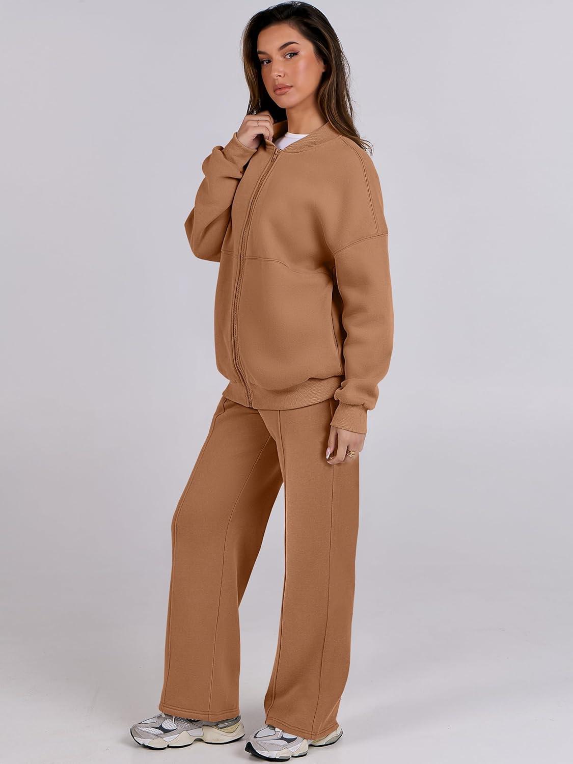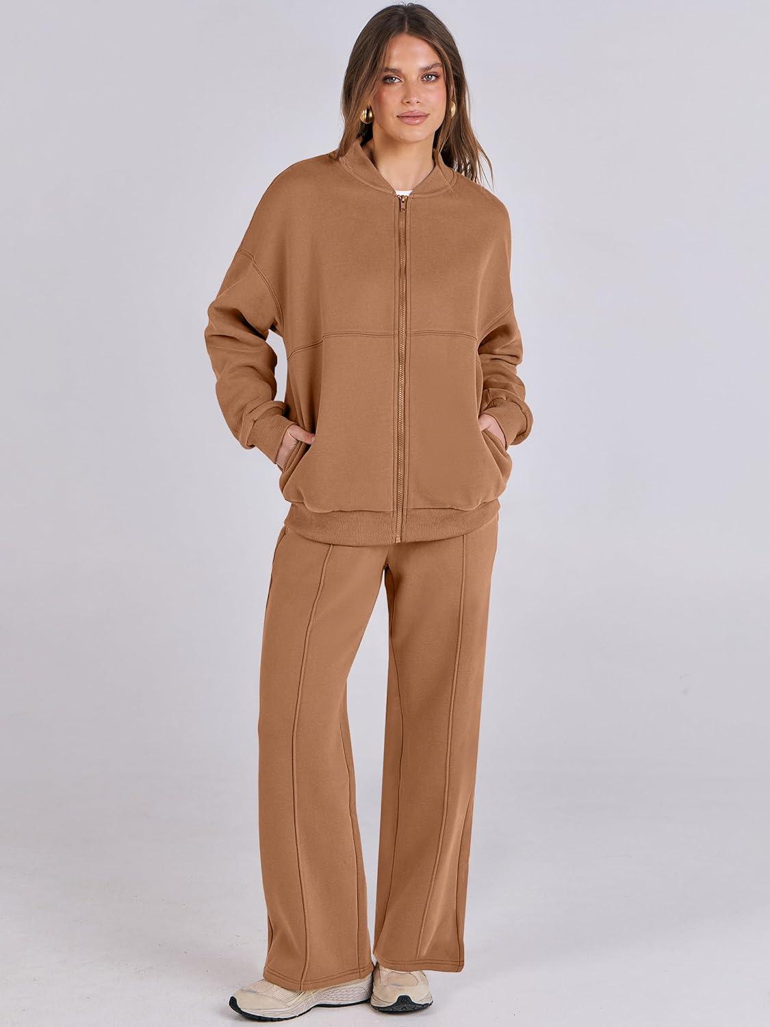 ANRABESS Women 2 Piece Outfits Lounge Set Oversized Zip Up Sweatshirt Jacket Sweatpant Matching Sweat Sets Winter Sweatsuits(Brown)