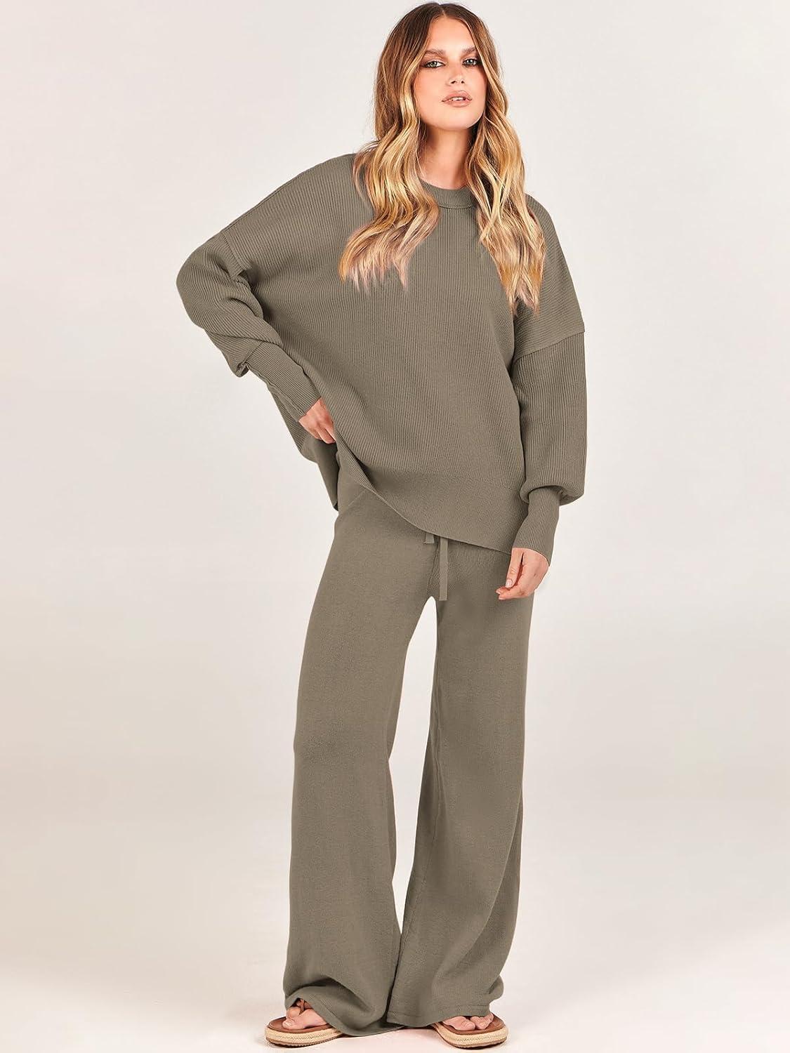imageANRABESS Women 2 Piece Outfits Oversized Chunky Knit Sweater Top Wide Leg Pants 2024 Fall Lounge Set Trendy Cozy ClothesGray