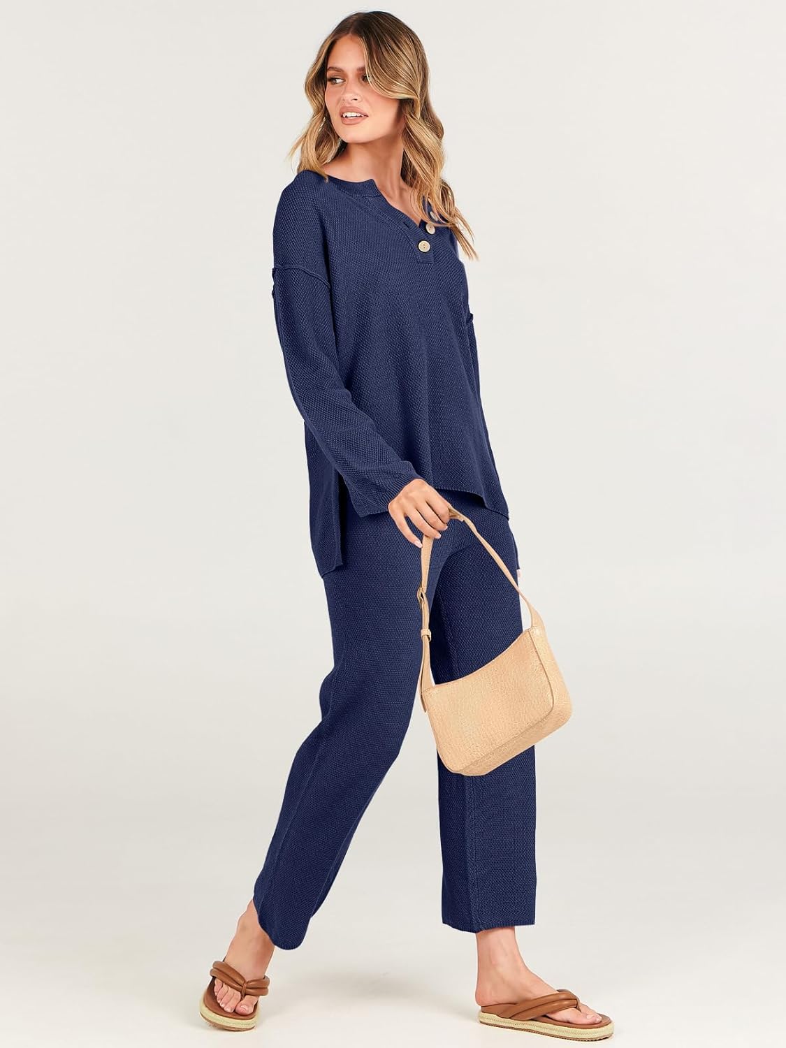 Design -Top: crew neck, button design, oversized loose, side slit, dropped raglan sleeves; Pants: Elastic waistband, high-rise design, pull-on style. Worn as a set or separately to run errands or wear boots and wear it to dinner, it is so versatile you can wear it anyway you want.