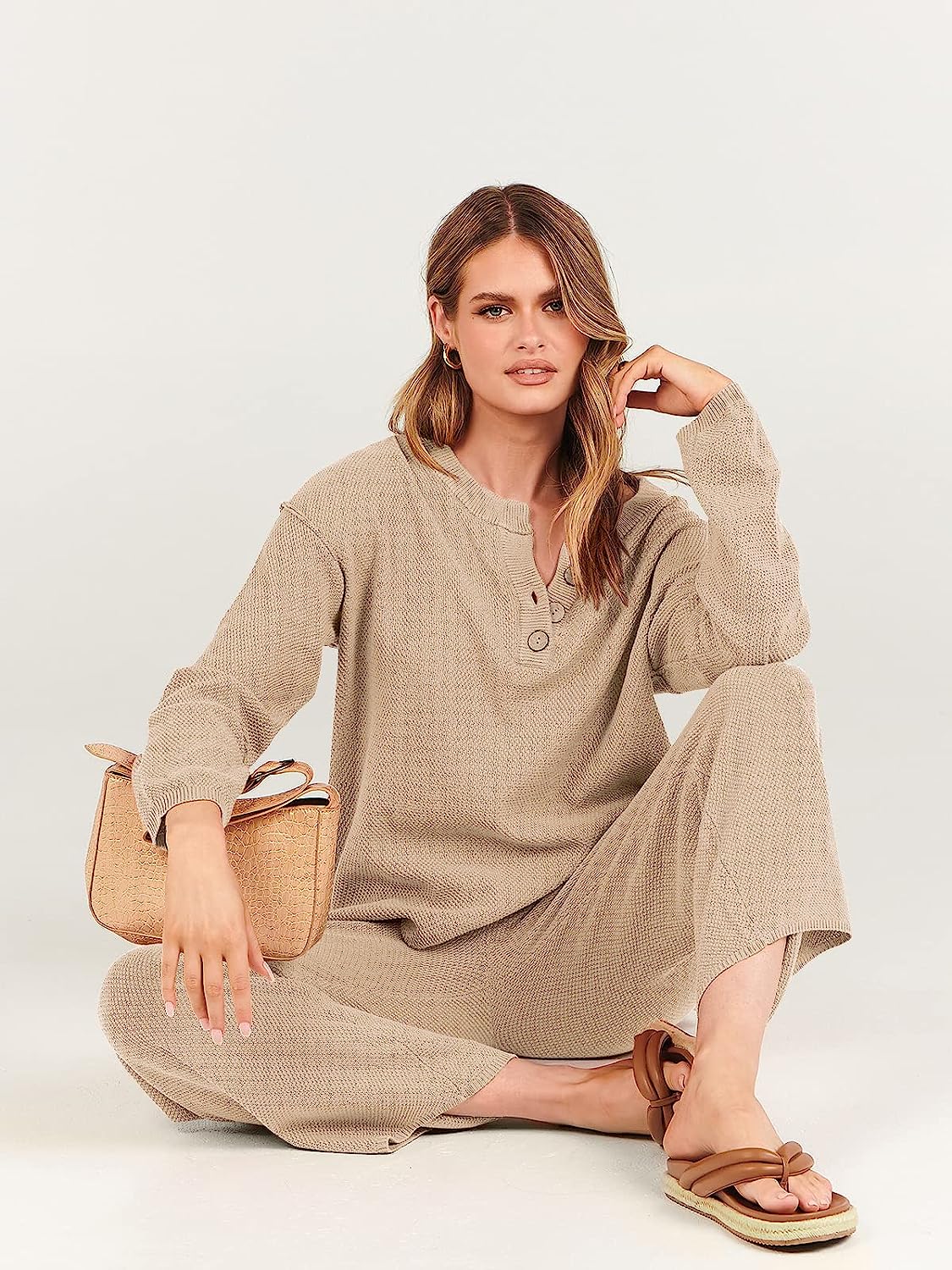 Design -Top: crew neck, button design, oversized loose, side slit, dropped raglan sleeves; Pants: Elastic waistband, high-rise design, pull-on style. Worn as a set or separately to run errands or wear boots and wear it to dinner, it is so versatile you can wear it anyway you want.