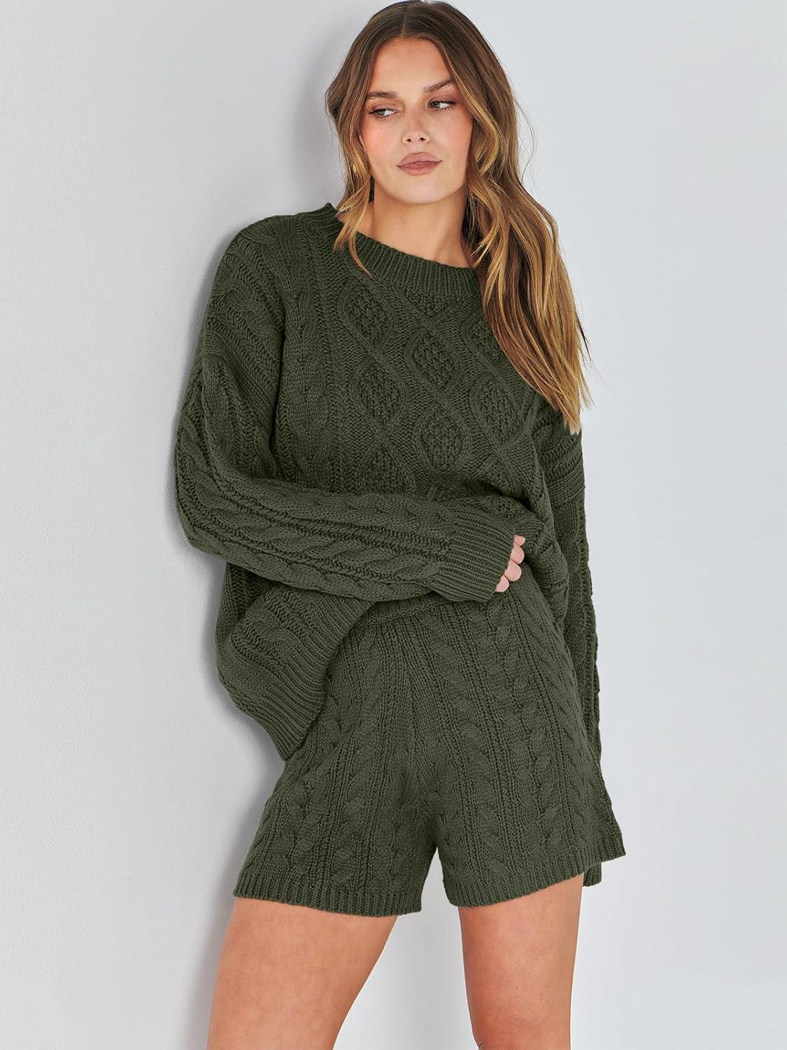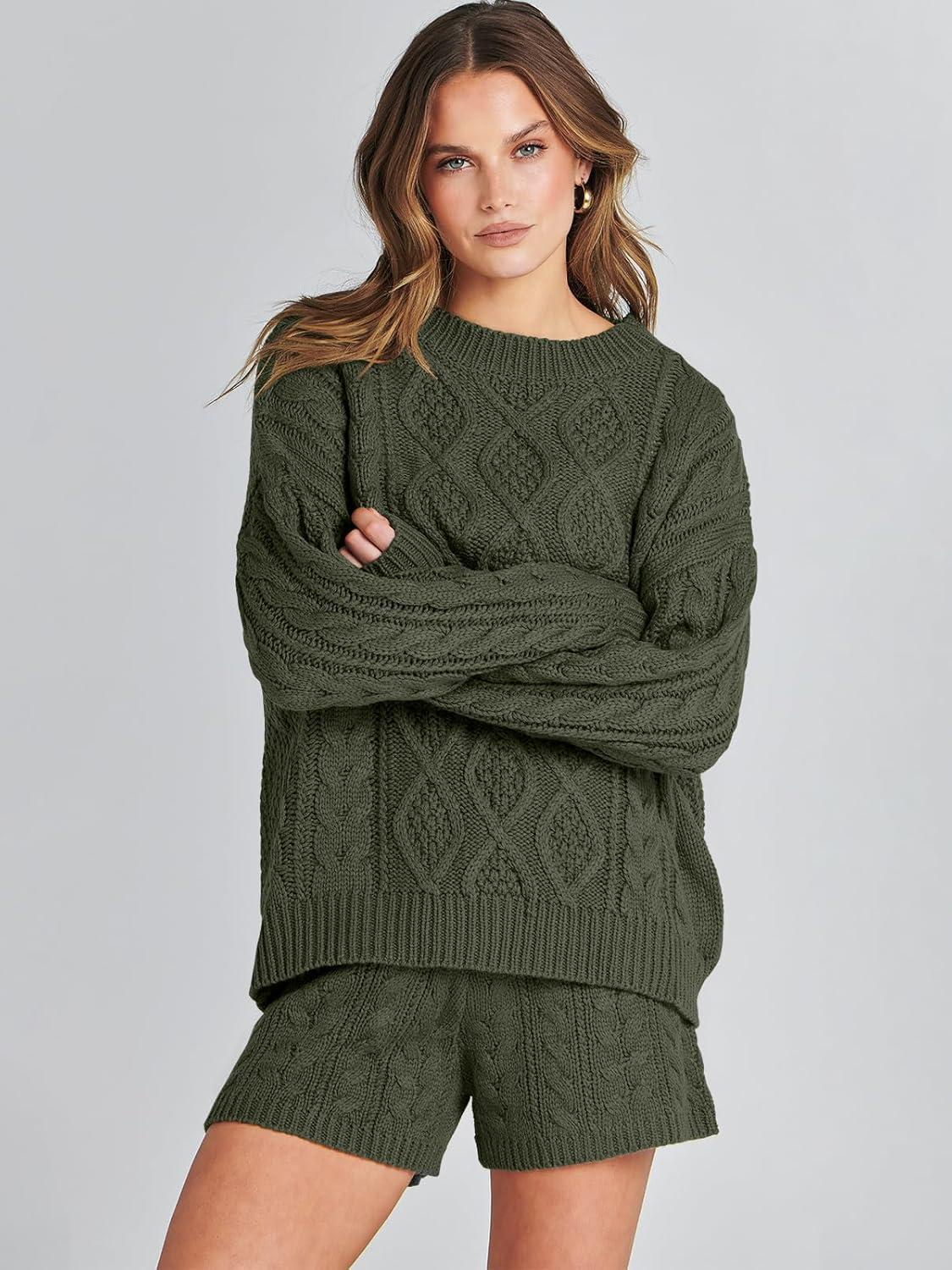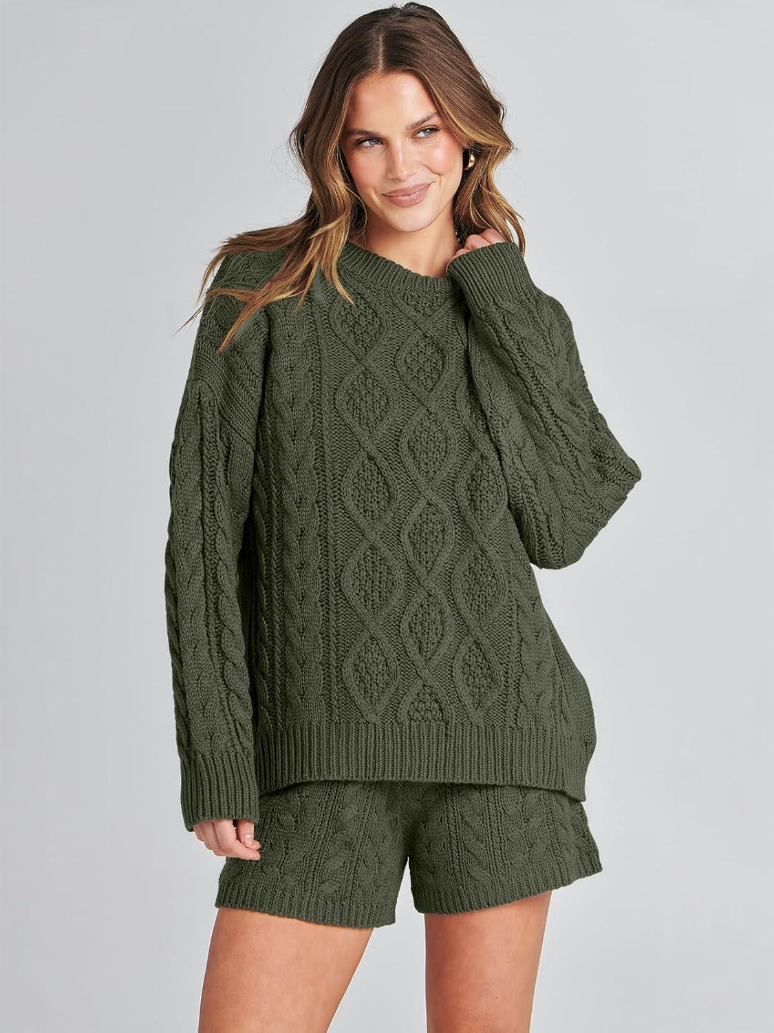 ANRABESS Women 2 Piece Outfits Sweater Lounge Loungewear Sets 2025 Winter Cable Knit Oversized Sweaters Shorts Matching Sets(Army Green)
