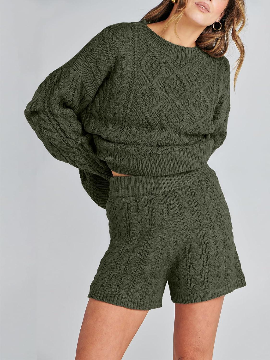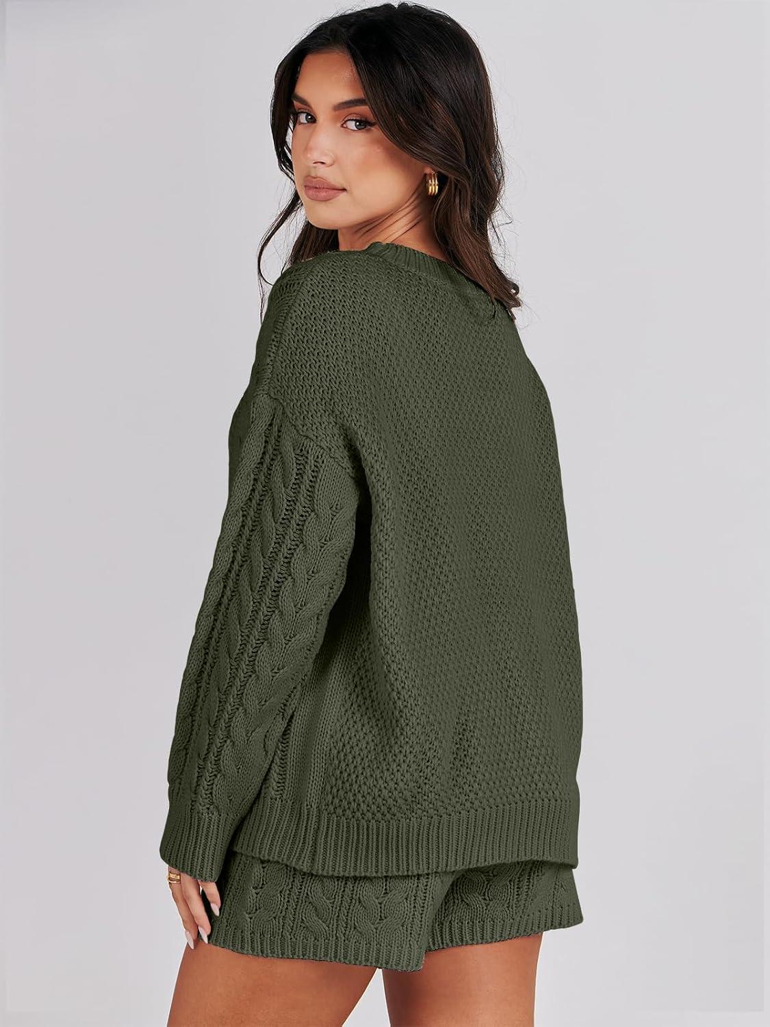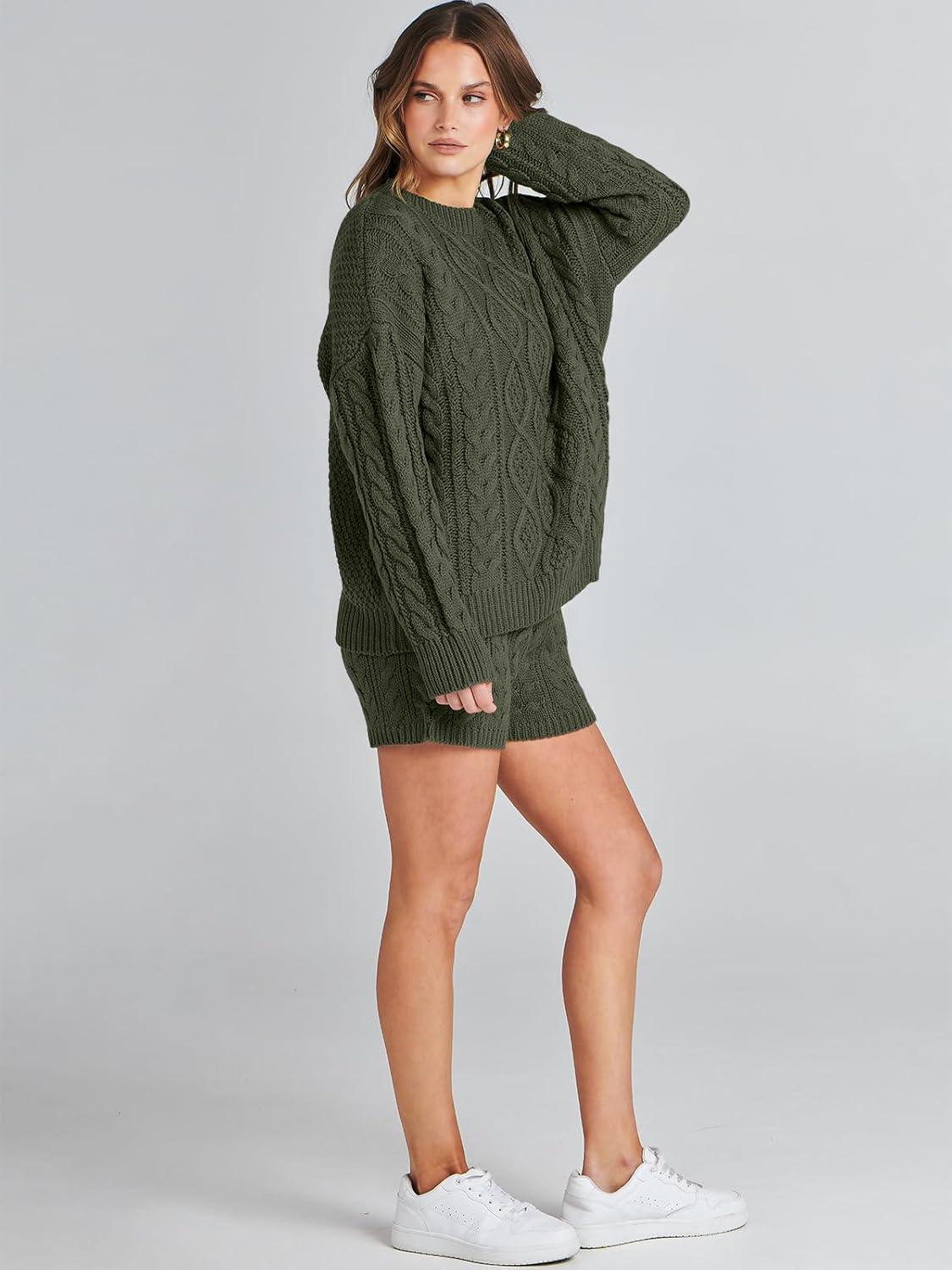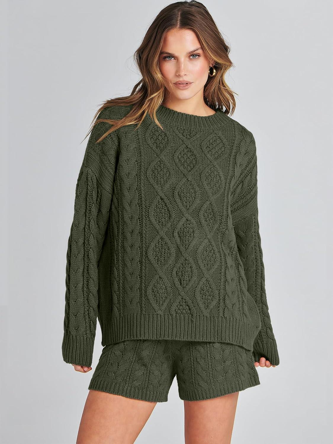 ANRABESS Women 2 Piece Outfits Sweater Lounge Loungewear Sets 2025 Winter Cable Knit Oversized Sweaters Shorts Matching Sets(Army Green)
