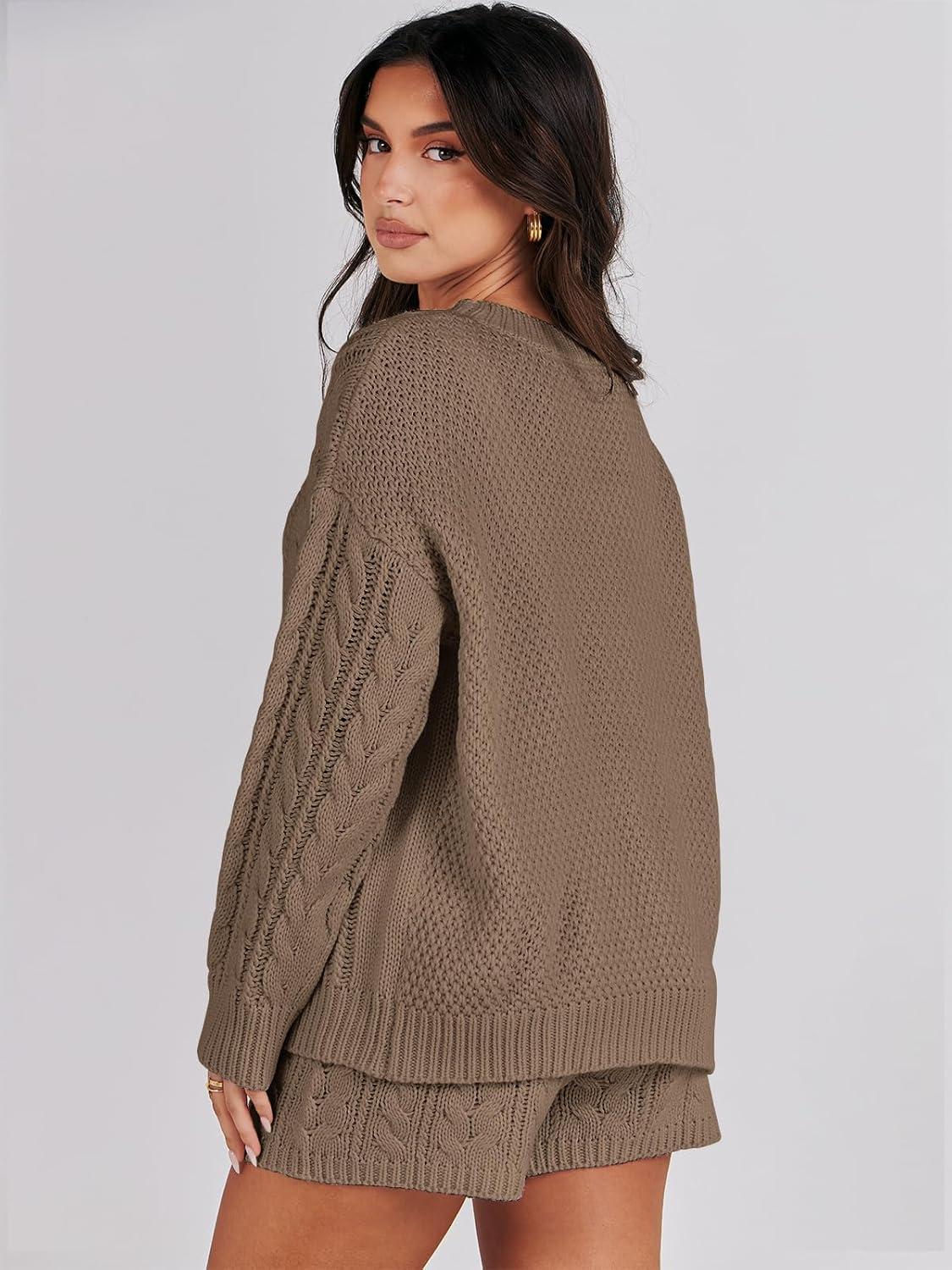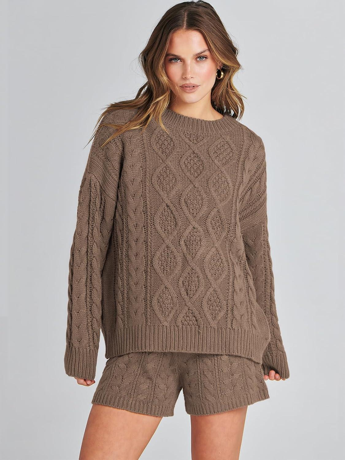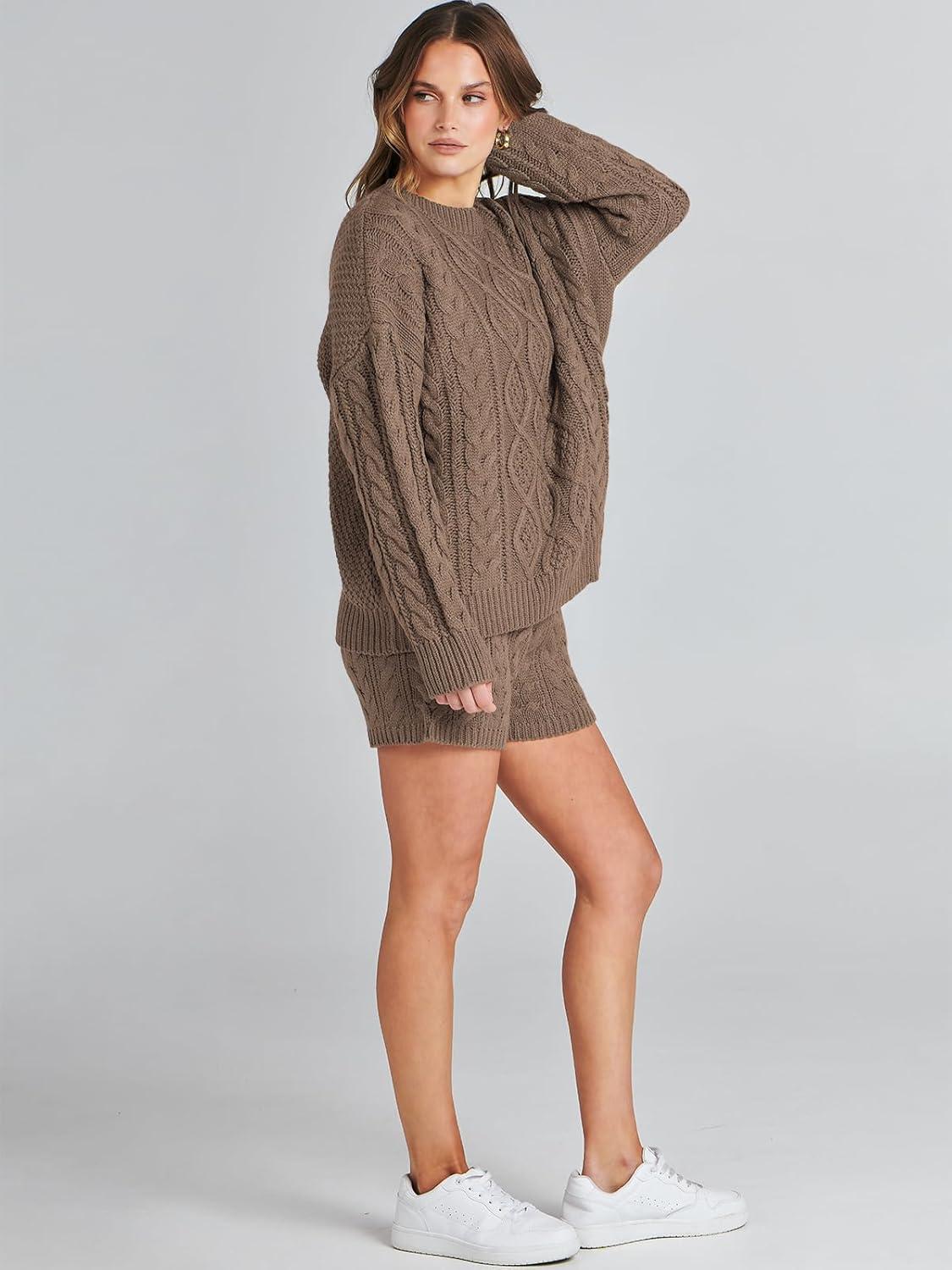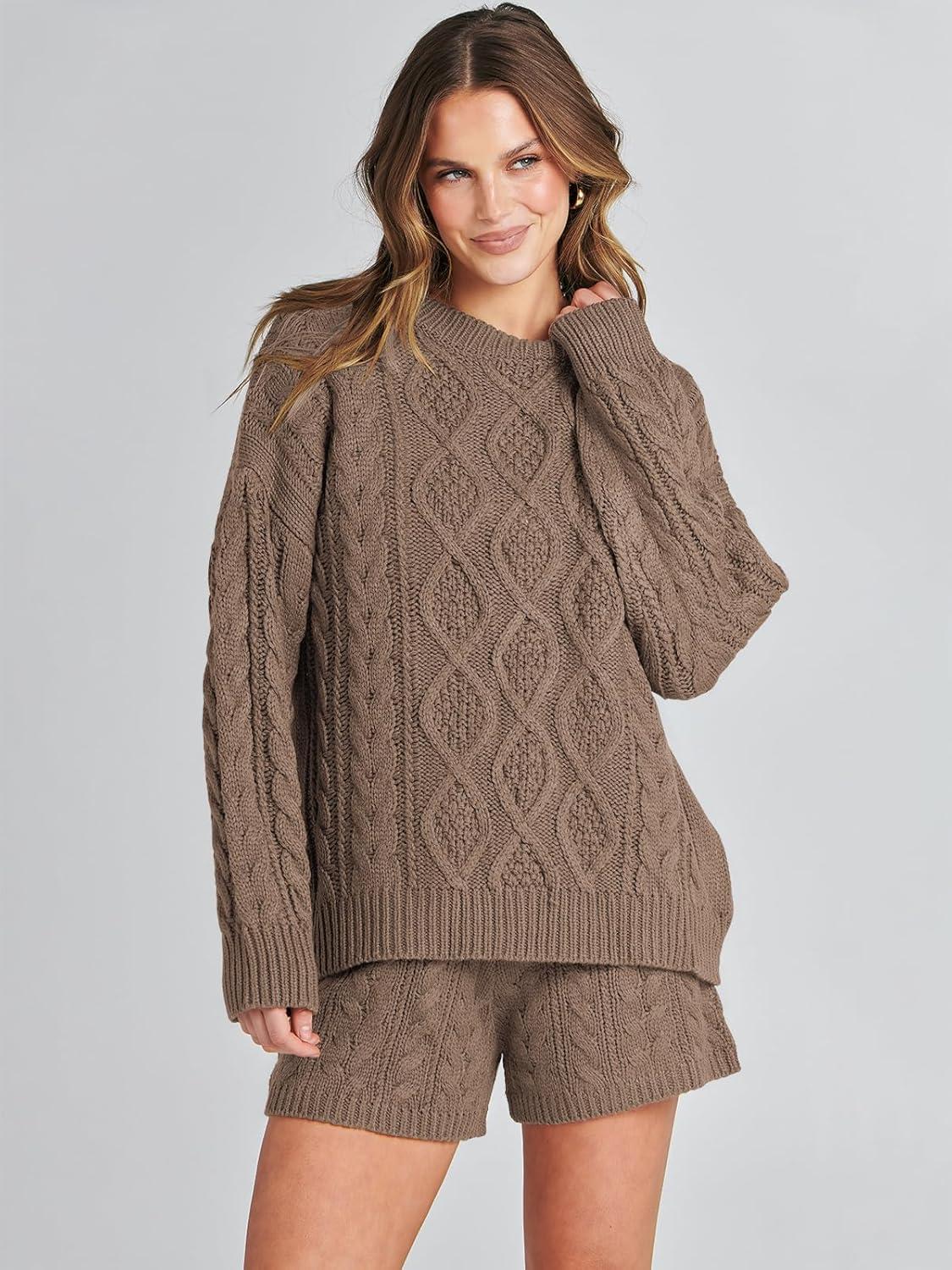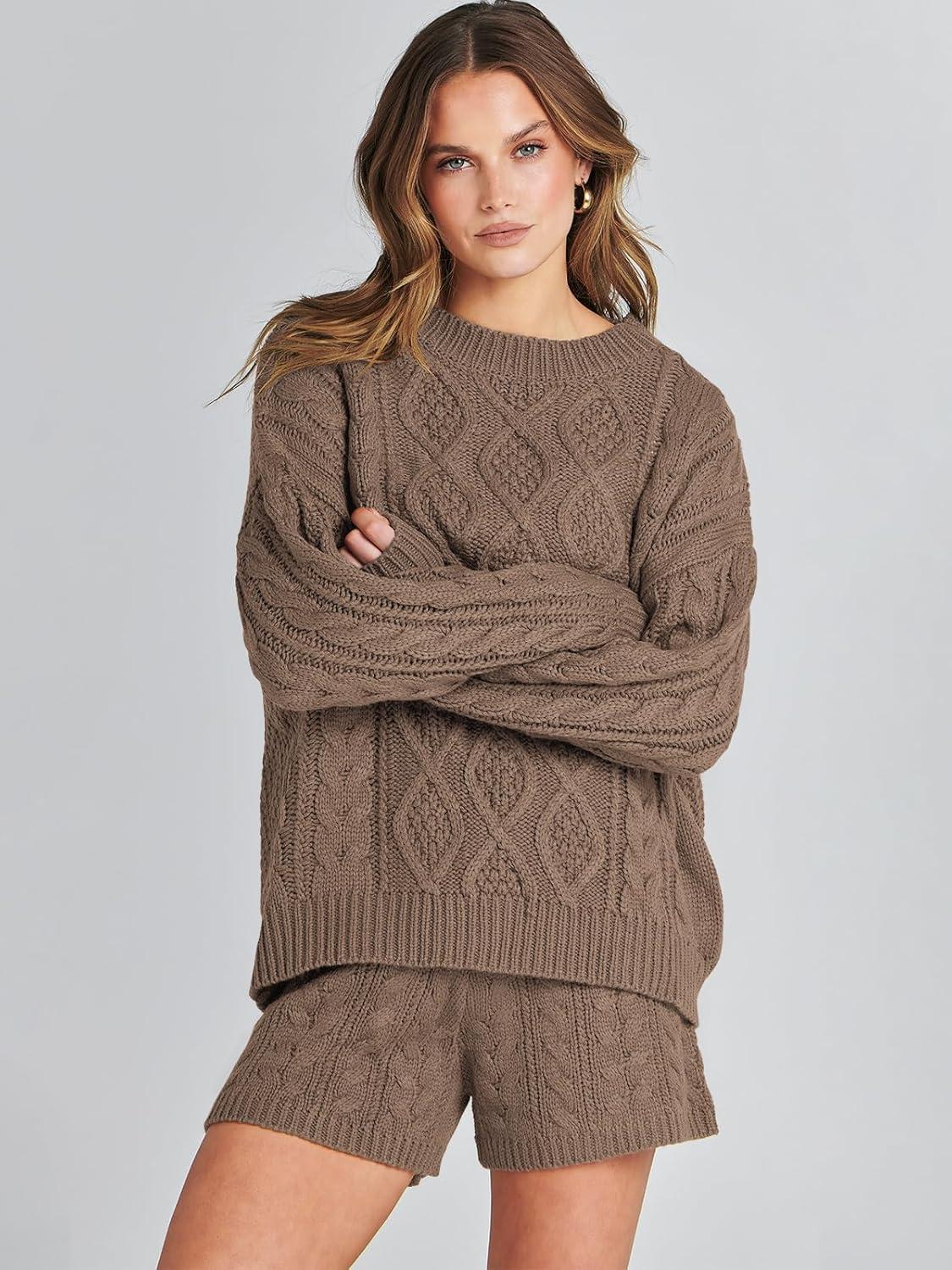 ANRABESS Women 2 Piece Outfits Sweater Lounge Loungewear Sets 2025 Winter Cable Knit Oversized Sweaters Shorts Matching Sets(Brown)