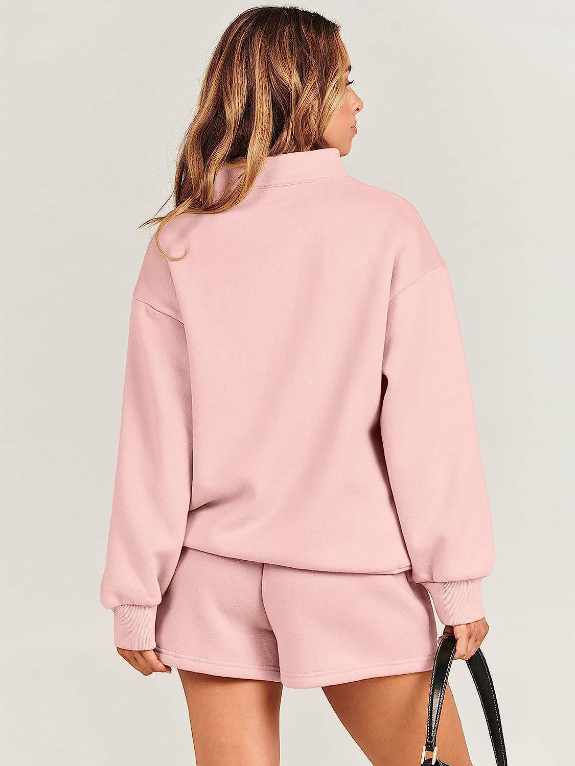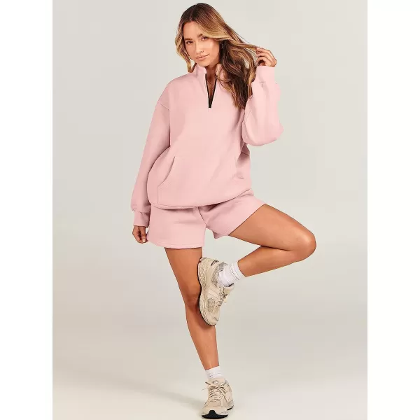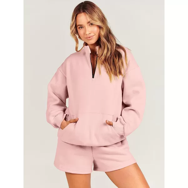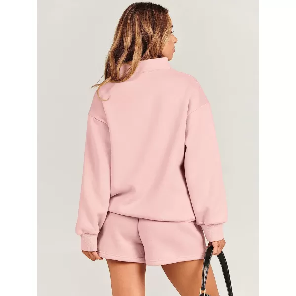 ANRABESS Women 2 Piece Outfits Sweatsuit Oversized Half Zip Collared Sweatshirt & Short Set Lounge Wear Tacksuit Set(Pink)
