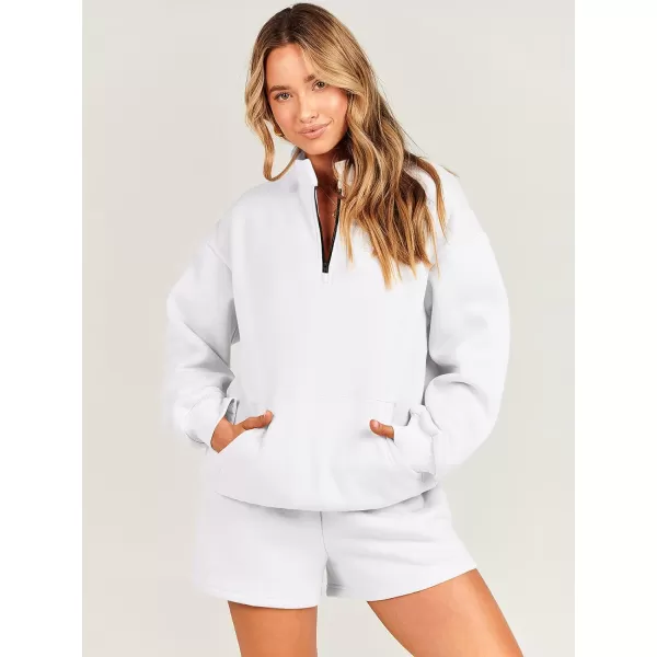 ANRABESS Women 2 Piece Outfits Sweatsuit Oversized Half Zip Collared Sweatshirt & Short Set Lounge Wear Tracksuit Set(White)