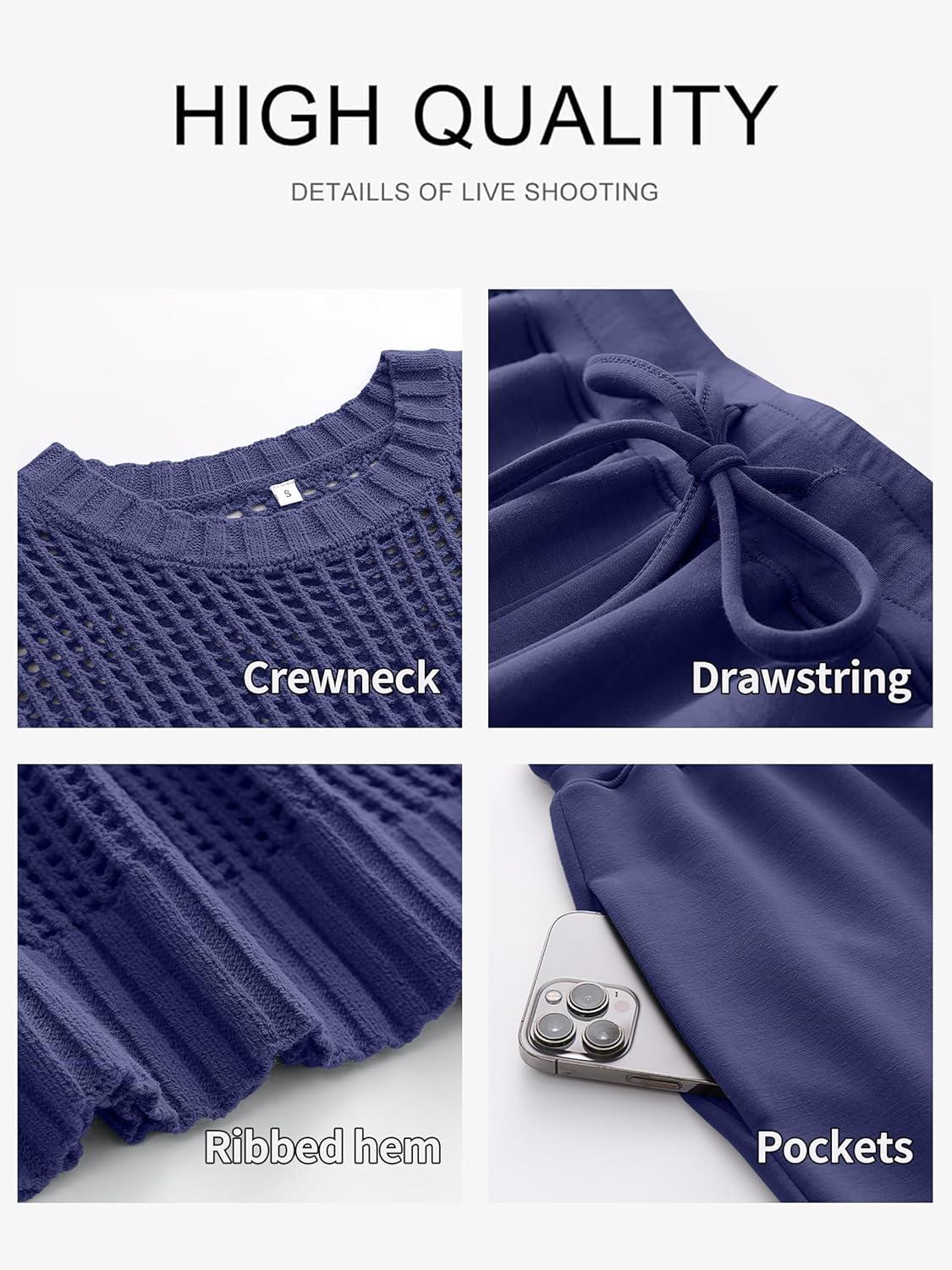 imageANRABESS Women 2 Piece Summer Outfits 2025 Crochet Sweater Vest Wide Leg Pants Lounge Matching Sets Travel Vacation ClothesNavy Blue