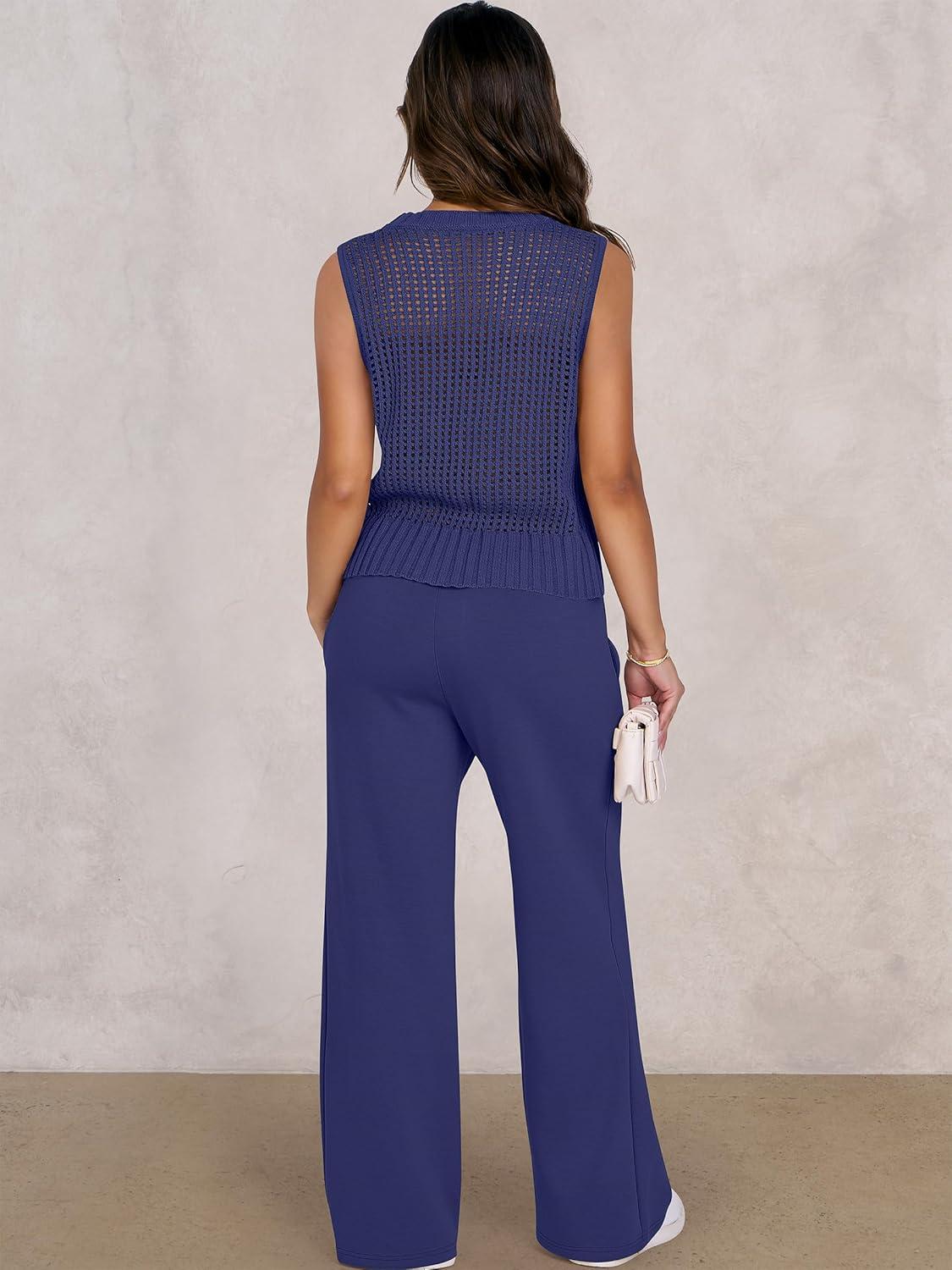 ANRABESS Women 2 Piece Summer Outfits 2025 Crochet Sweater Vest Wide Leg Pants Lounge Matching Sets Travel Vacation Clothes(Navy Blue)