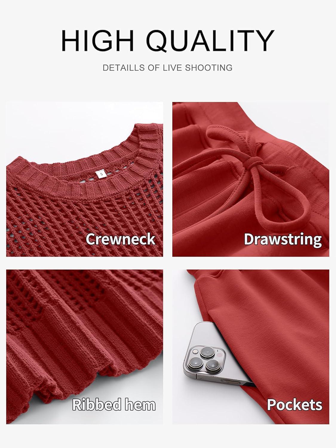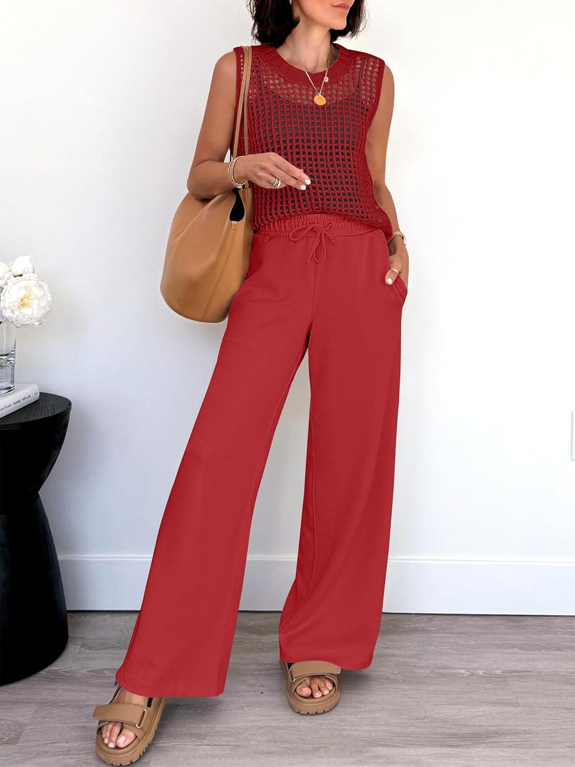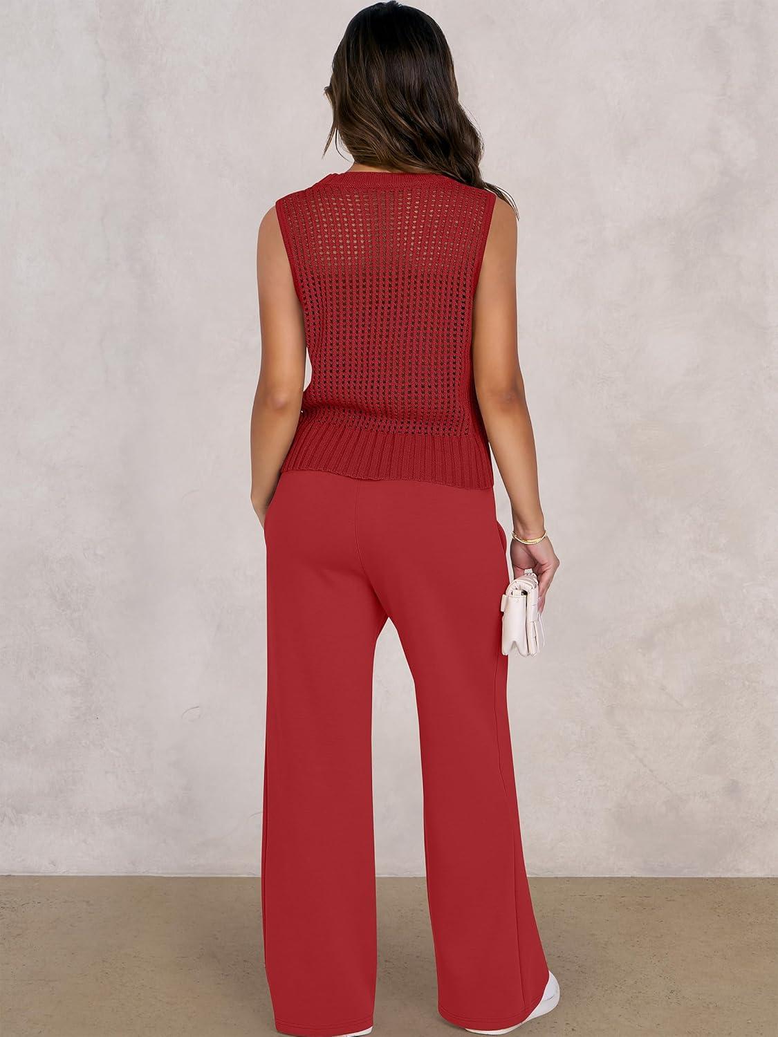 ANRABESS Women 2 Piece Summer Outfits 2025 Crochet Sweater Vest Wide Leg Pants Lounge Matching Sets Travel Vacation Clothes(Red)