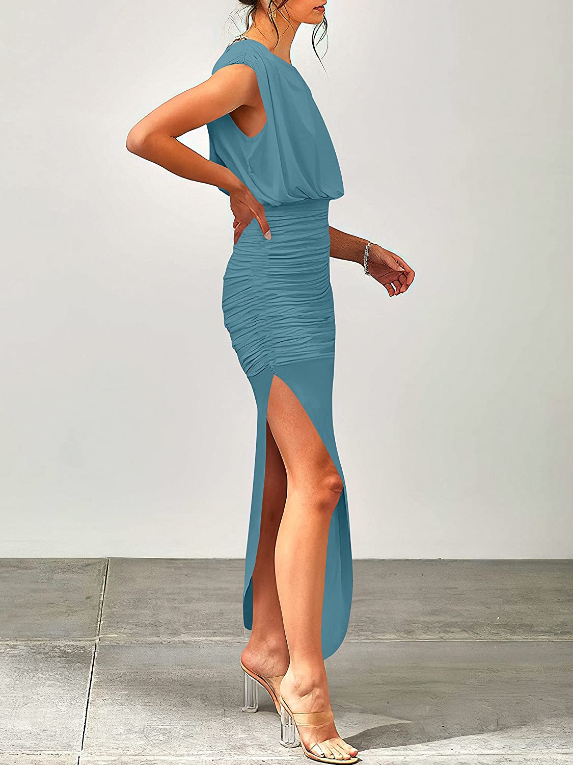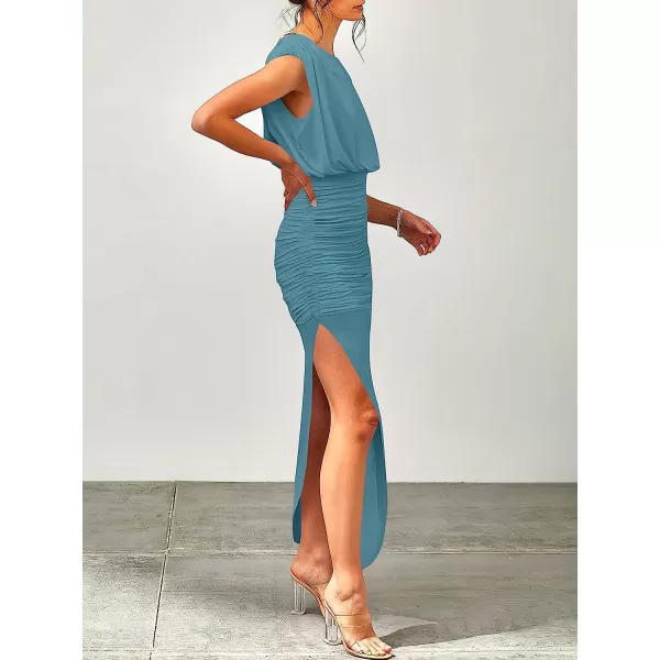 ANRABESS Women 2023 Summer Sleeveless Ruch Bodycon High Waist Asymmetric Slit Cocktail Maxi Dress(Cyan Blue)