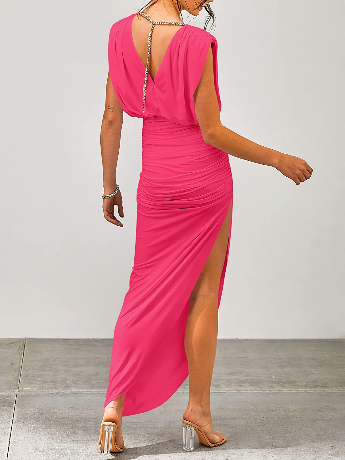 Features – this party dress designed ruched shoulder,crewneck, v back with golden chain,sleeveless,high waist,asymmetric hem with slit side,maxi dress,ruched bodycon cocktail dress.