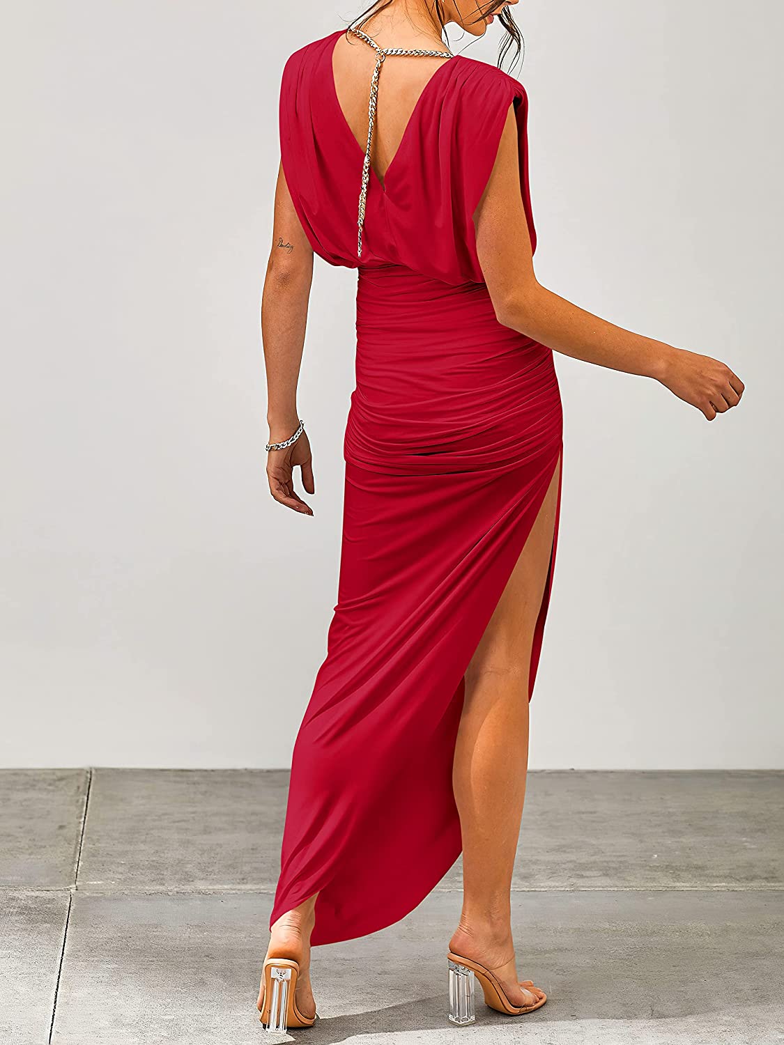 Features – this party dress designed ruched shoulder,crewneck, v back with golden chain,sleeveless,high waist,asymmetric hem with slit side,maxi dress,ruched bodycon cocktail dress.
