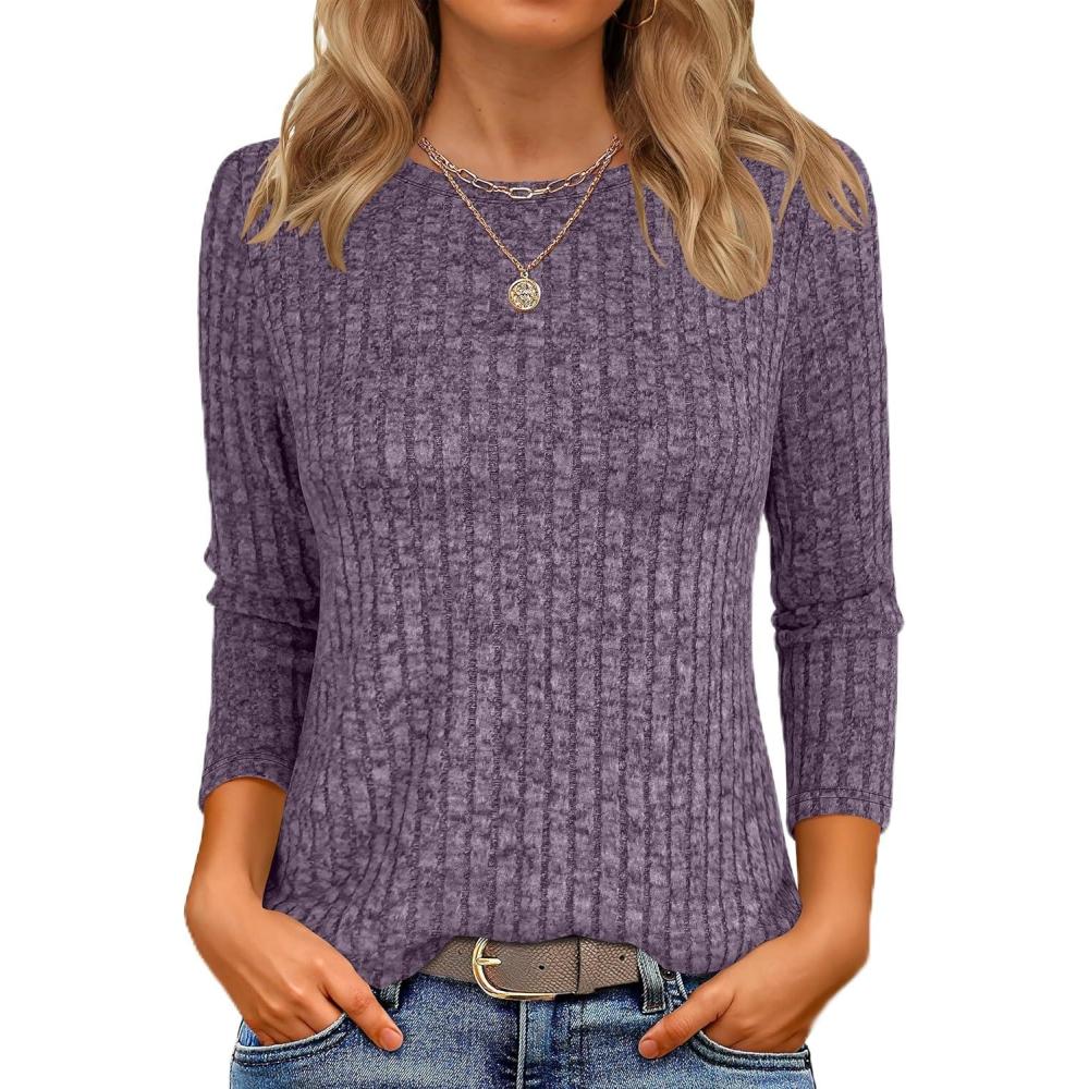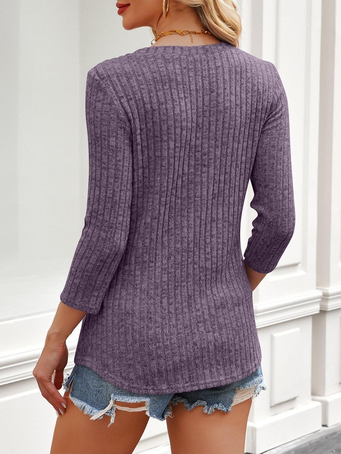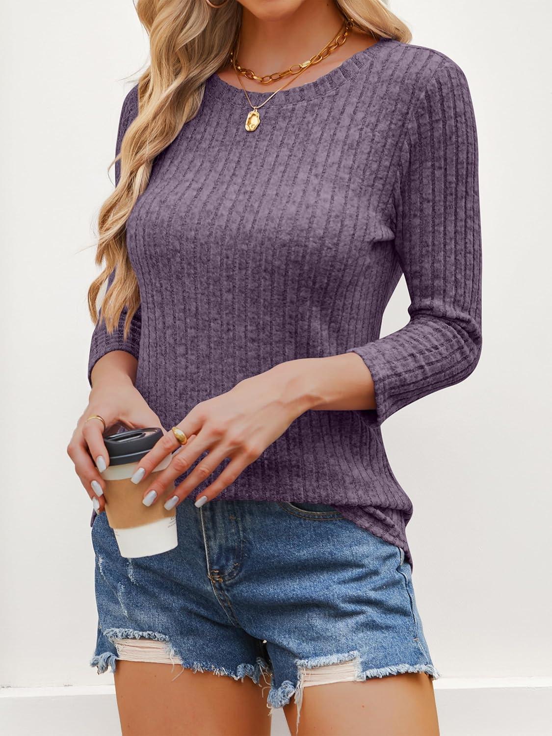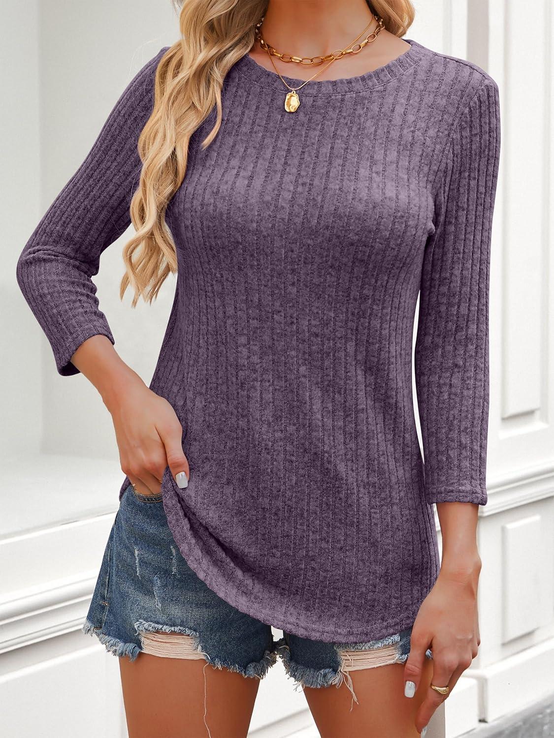 ANRABESS Women 3/4 Sleeve Length Shirts 2025 Fall Lightweight Sweaters Loose Fit Ribbed Knit Casual Soft Layering Tops(Purple)