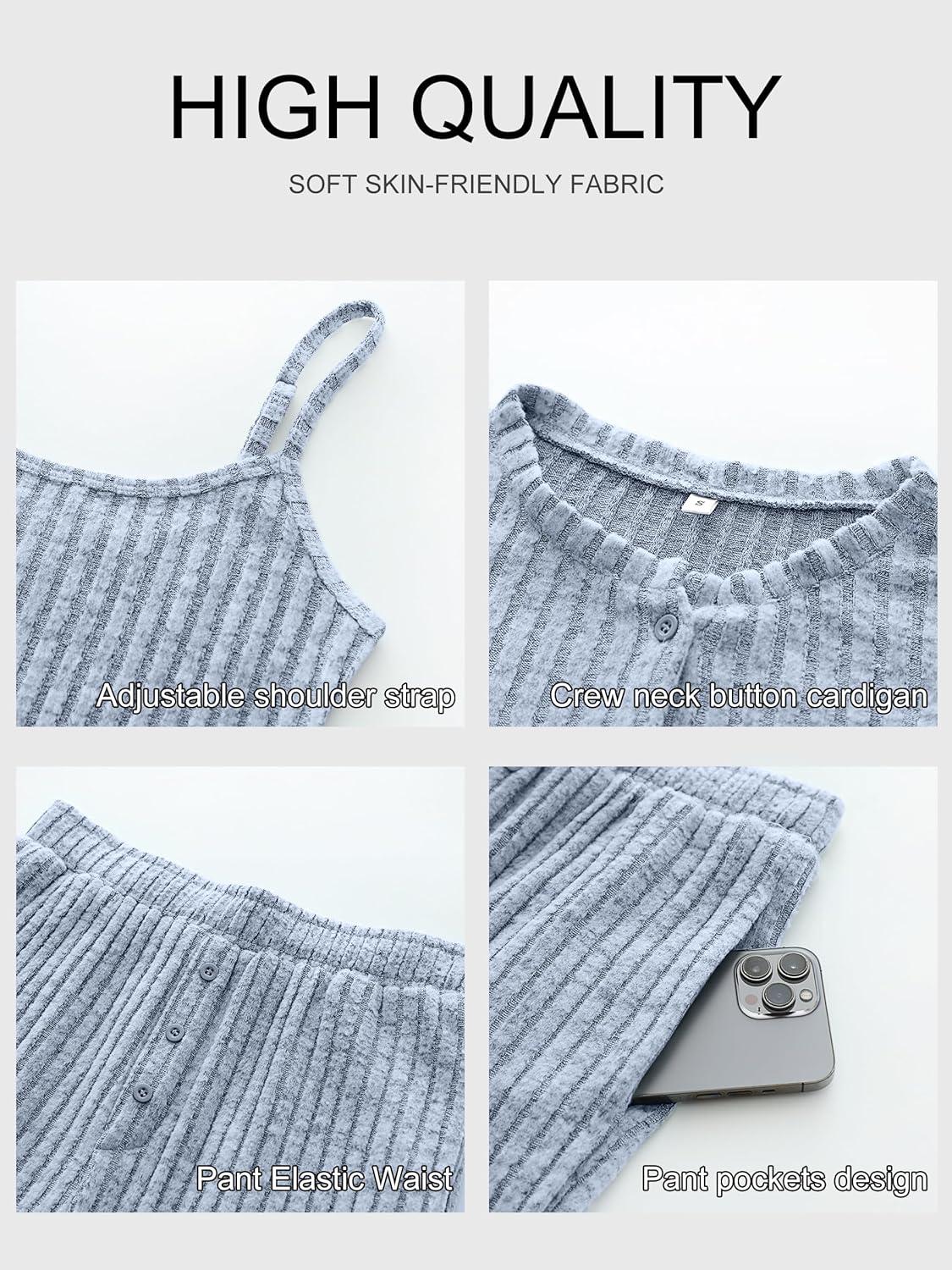 ANRABESS Women 3 Piece Lounge Pajama Sets Knit Crop Cardigan Cami Top Wide Leg Pants 2025 Fall Outfits Comfy Matching Clothes(Blue)