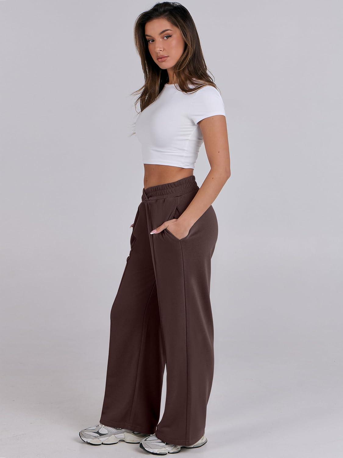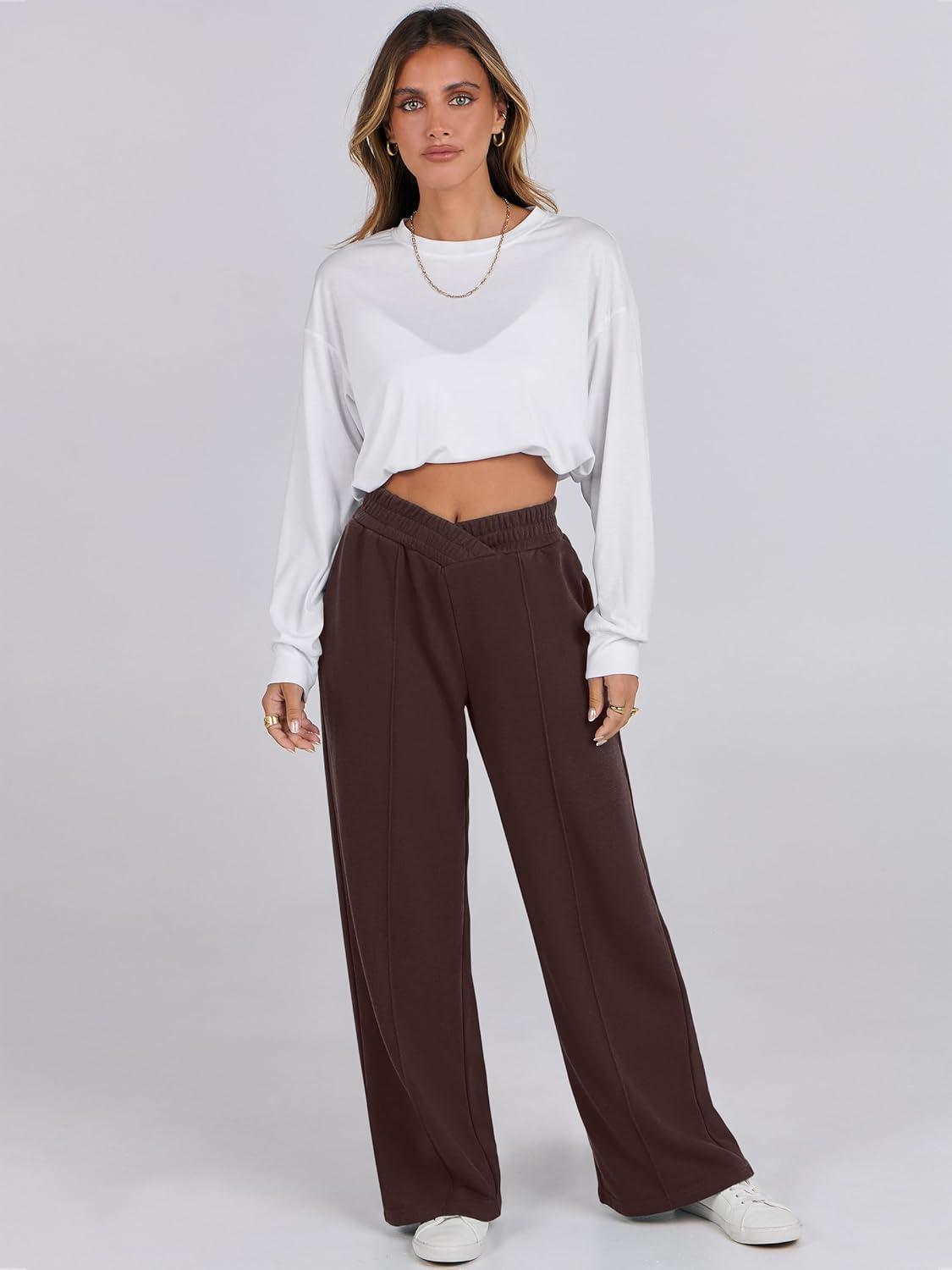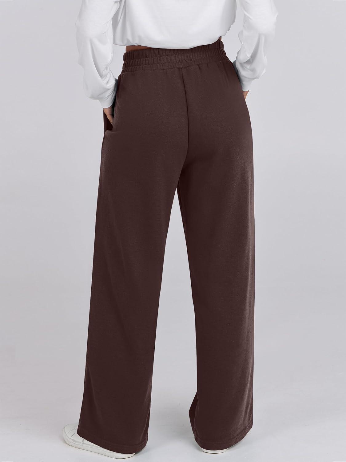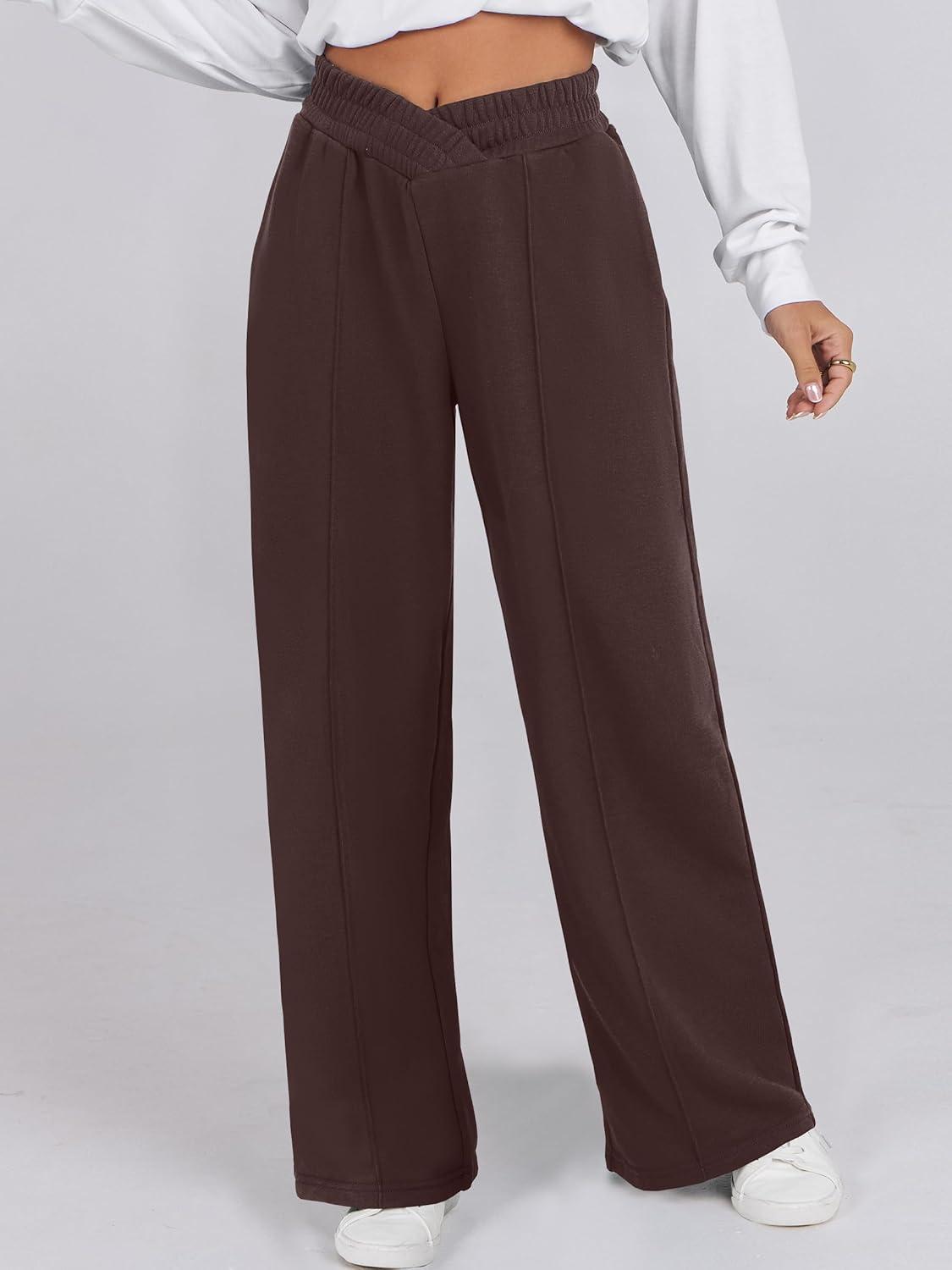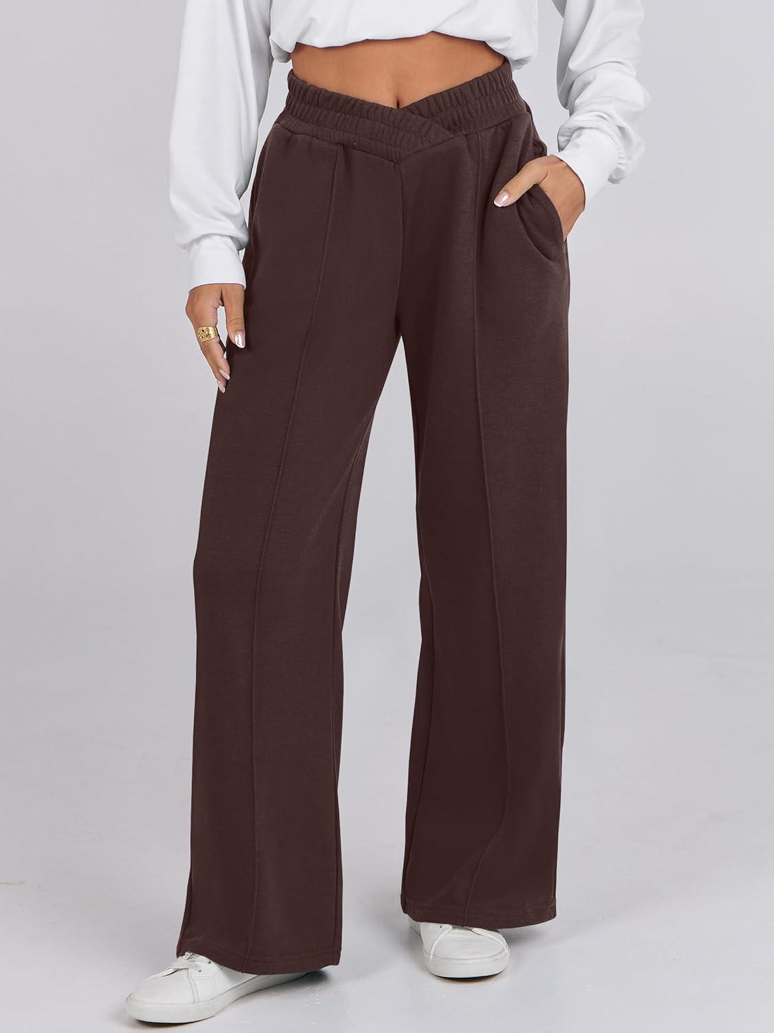 ANRABESS Women Asymmetric High Waist Wide Straight Leg Sweatpants with Pockets 2024 Fall Trendy Sweat Jogger Pants(Coffee)