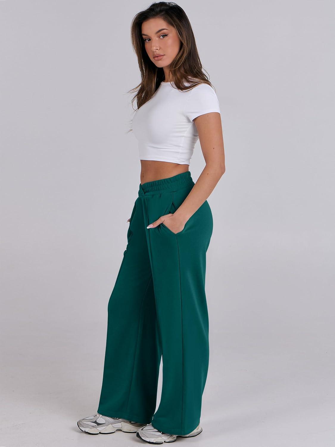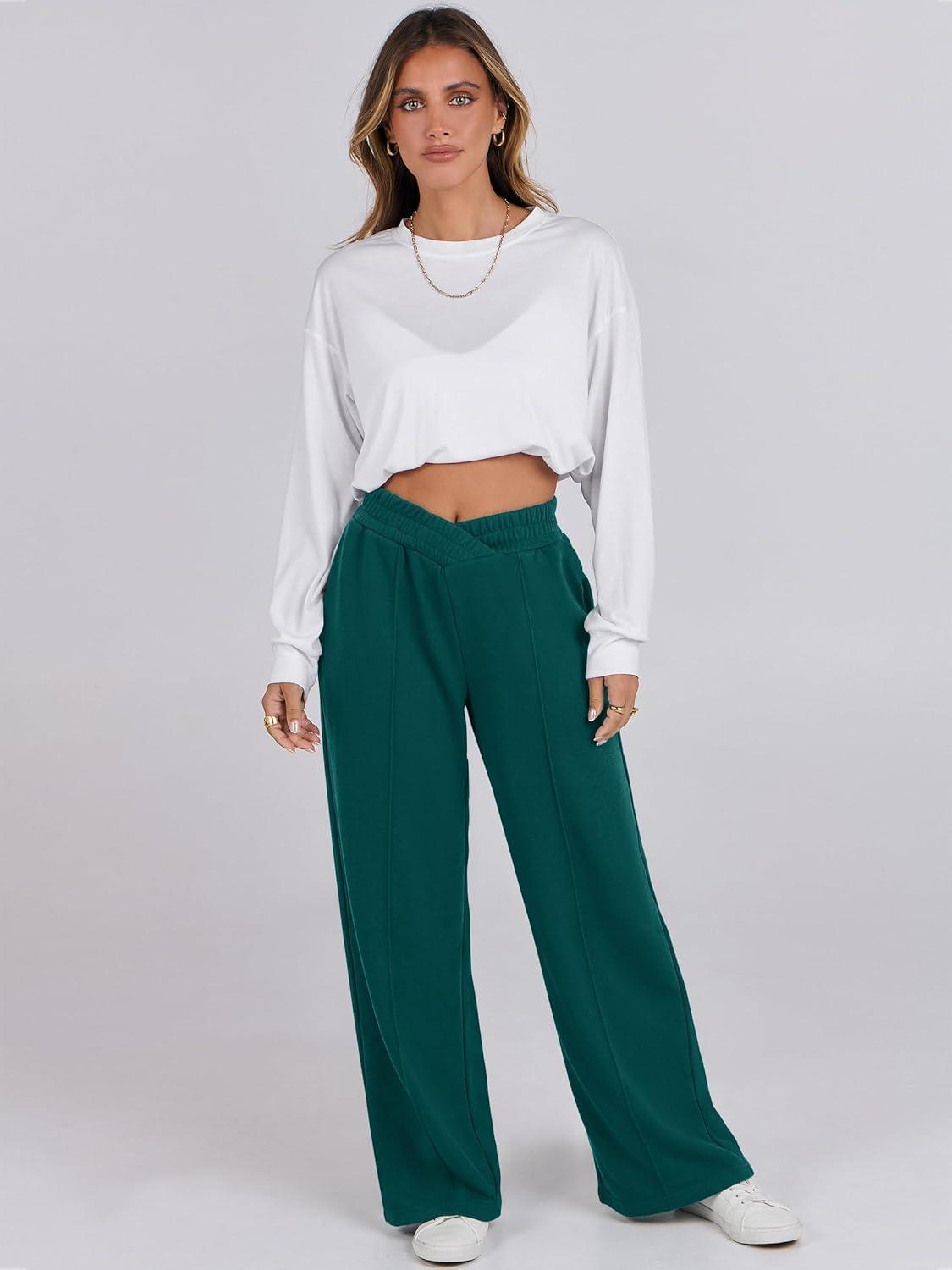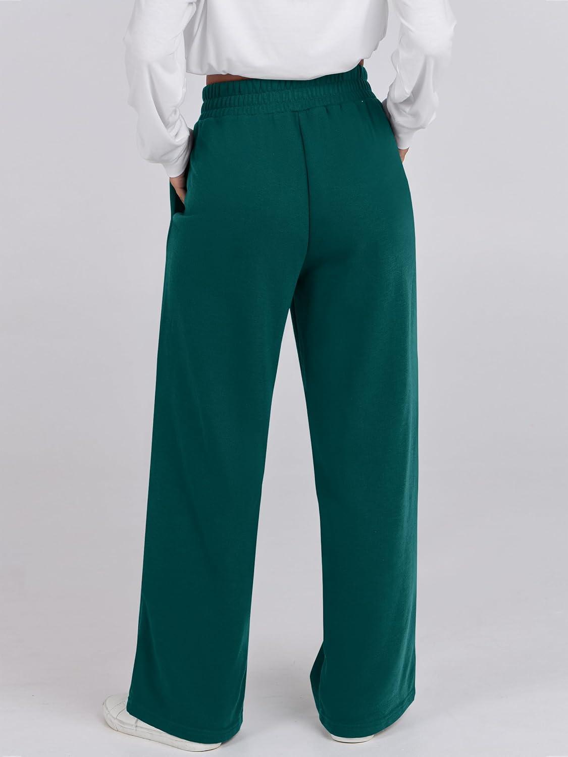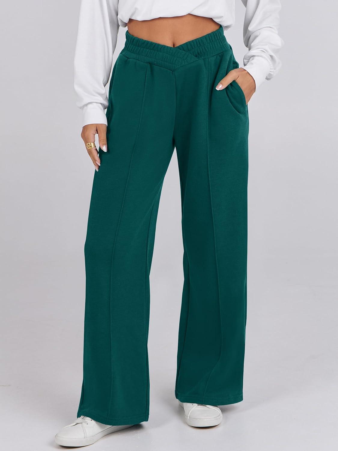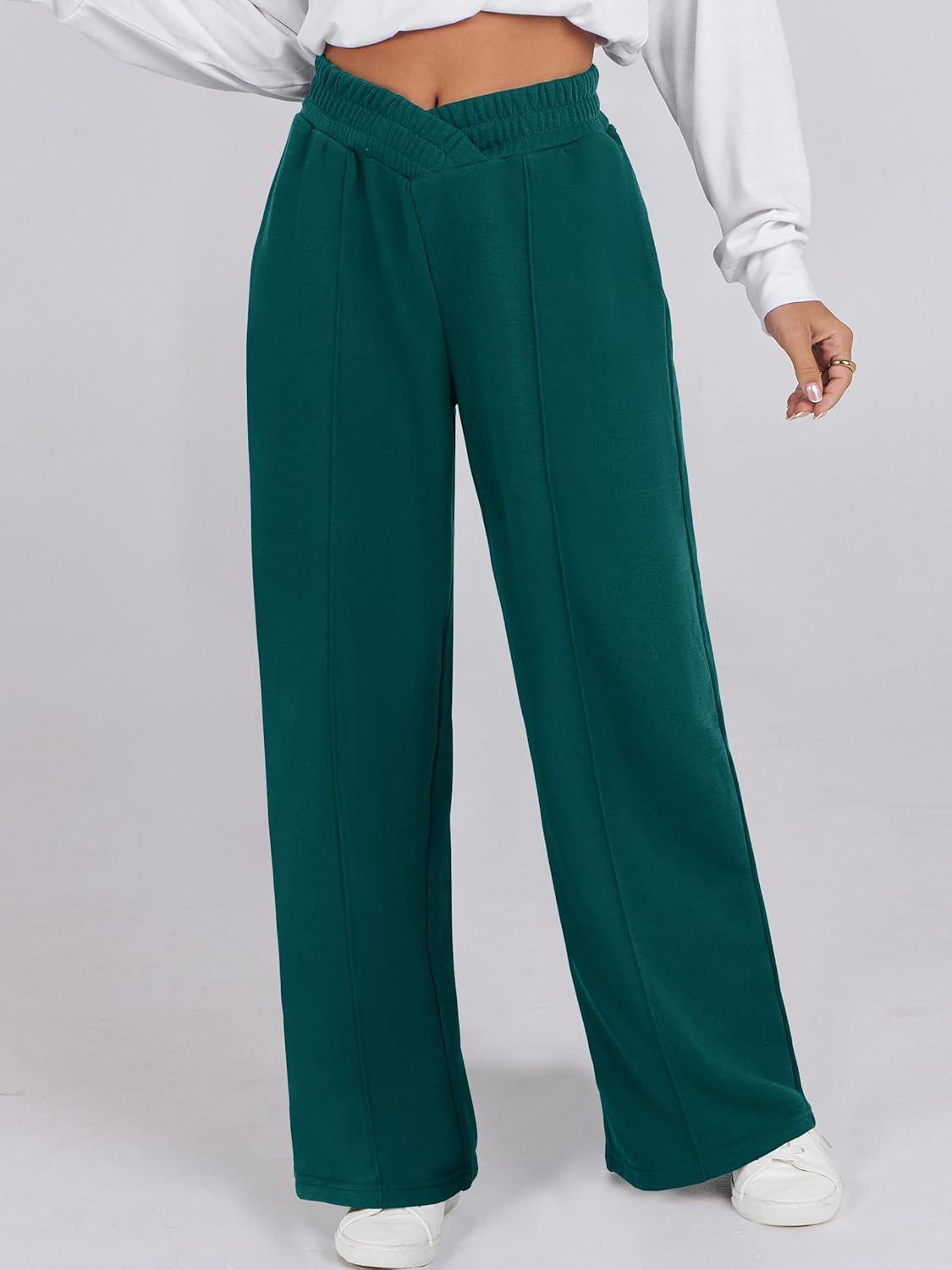 ANRABESS Women Asymmetric High Waist Wide Straight Leg Sweatpants with Pockets 2024 Fall Trendy Sweat Jogger Pants(Green)
