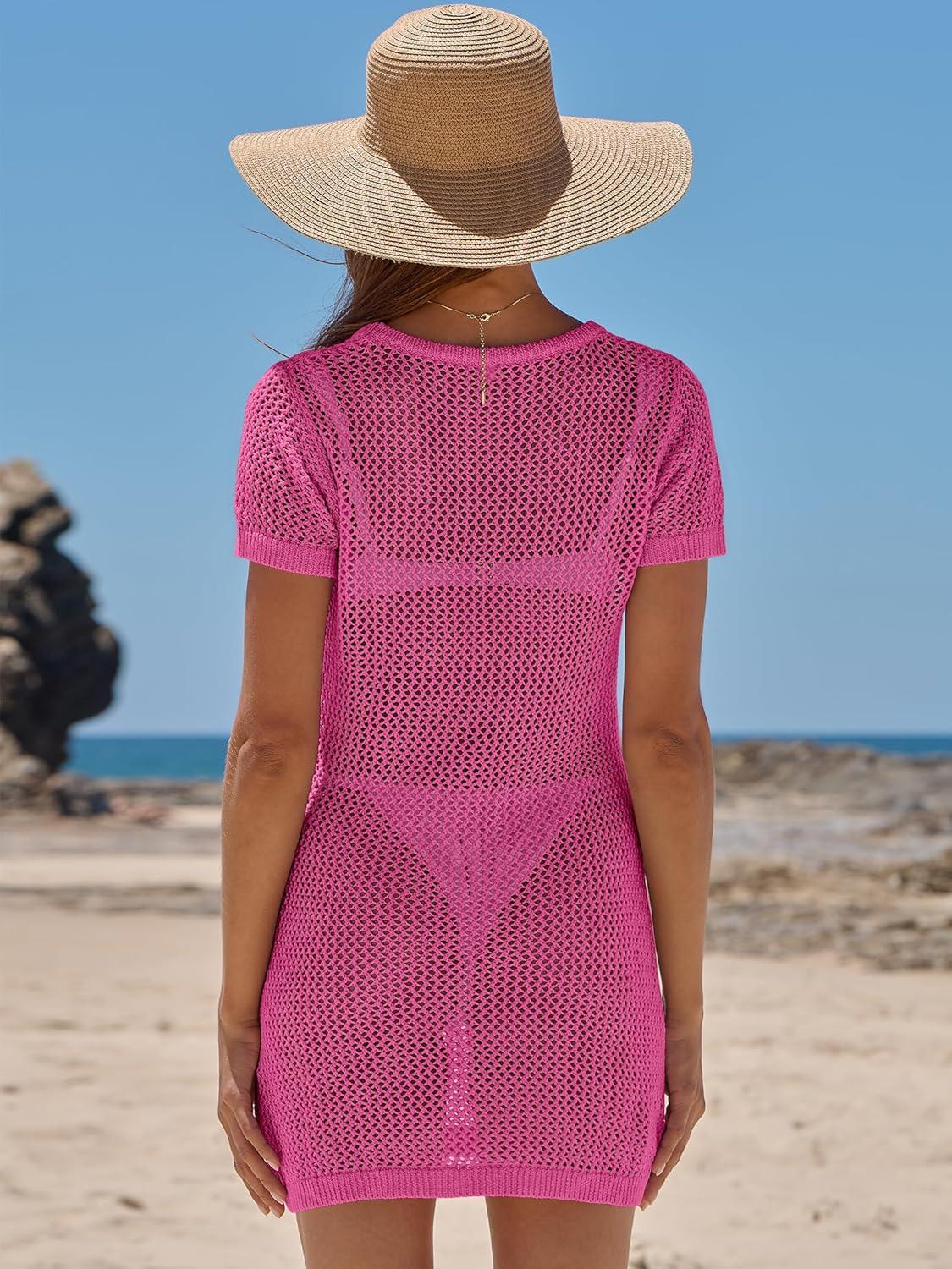 ANRABESS Women Beach Crochet Cover Ups Summer Knit Swimwear Short Sleeve Mesh Dress 2025 Vacation Bathing Suit Swimsuits(Hot Pink)