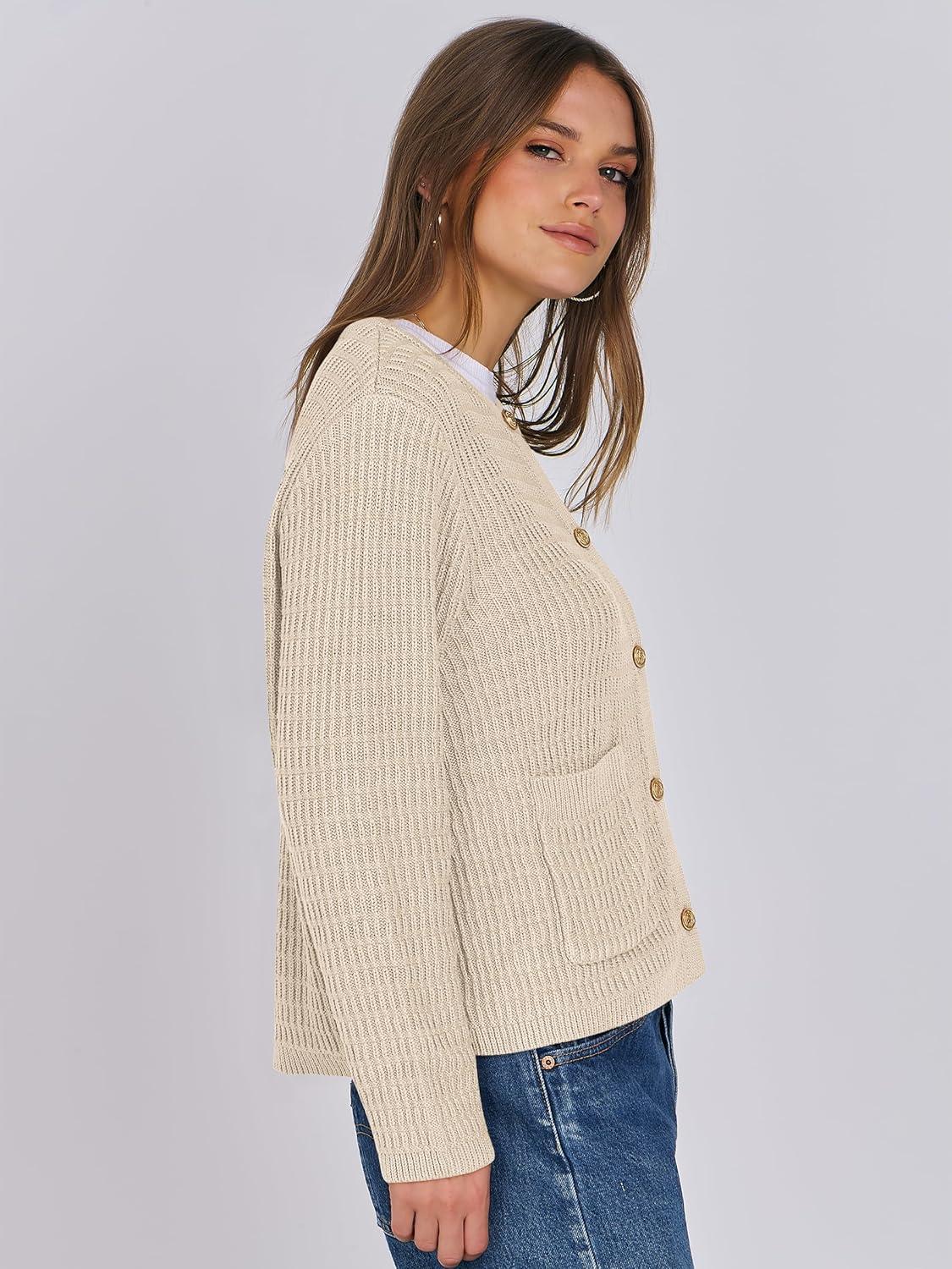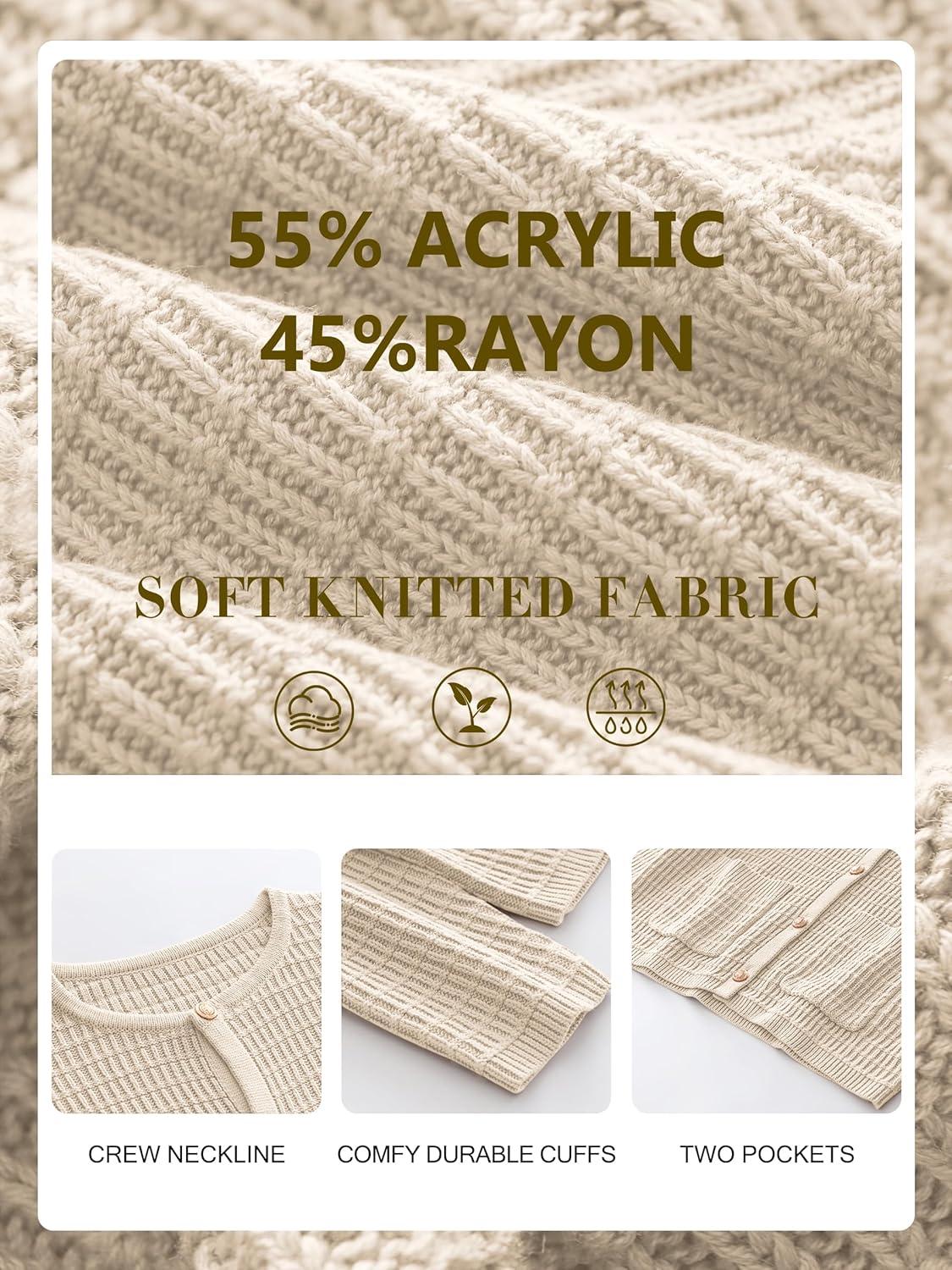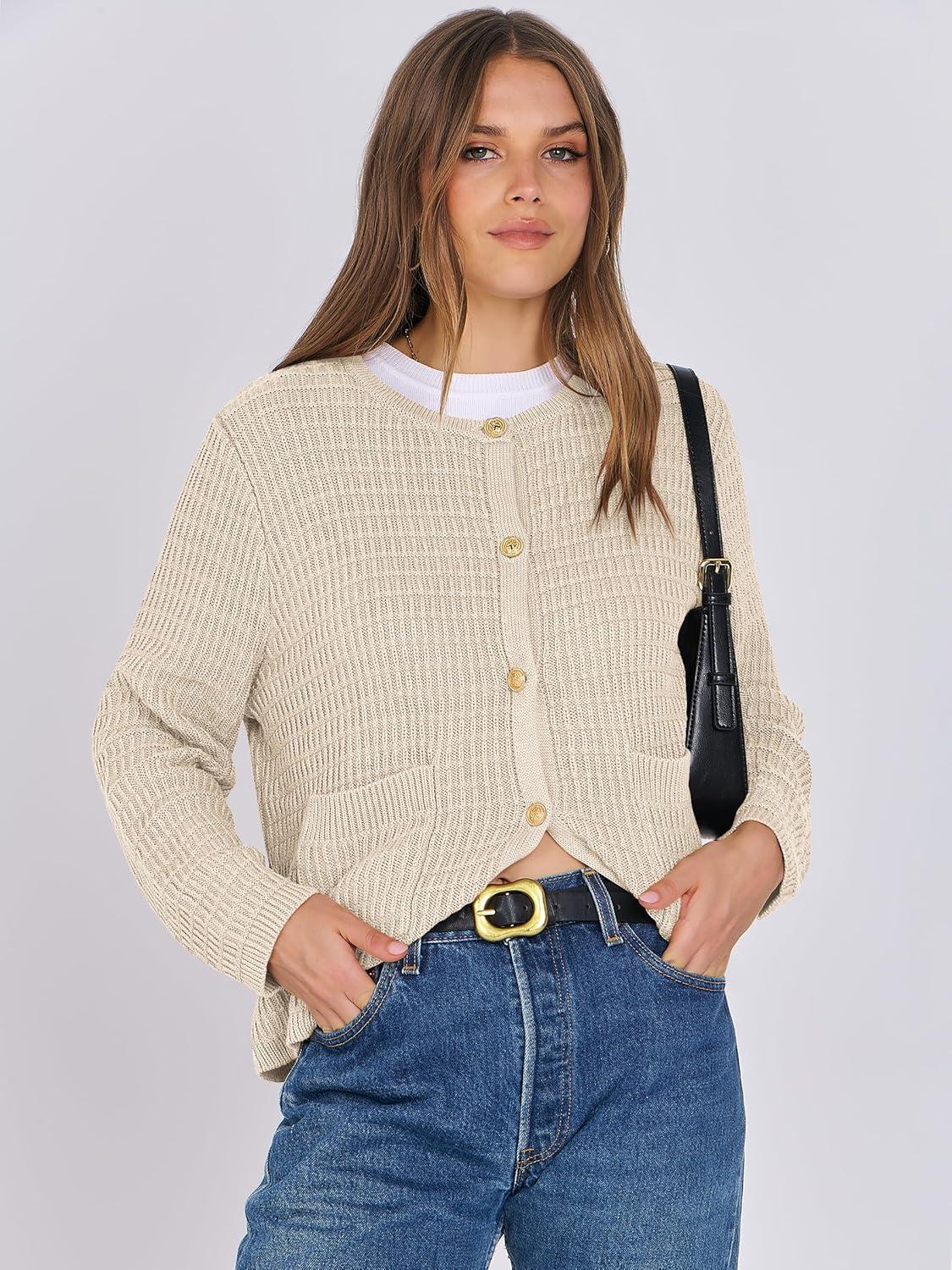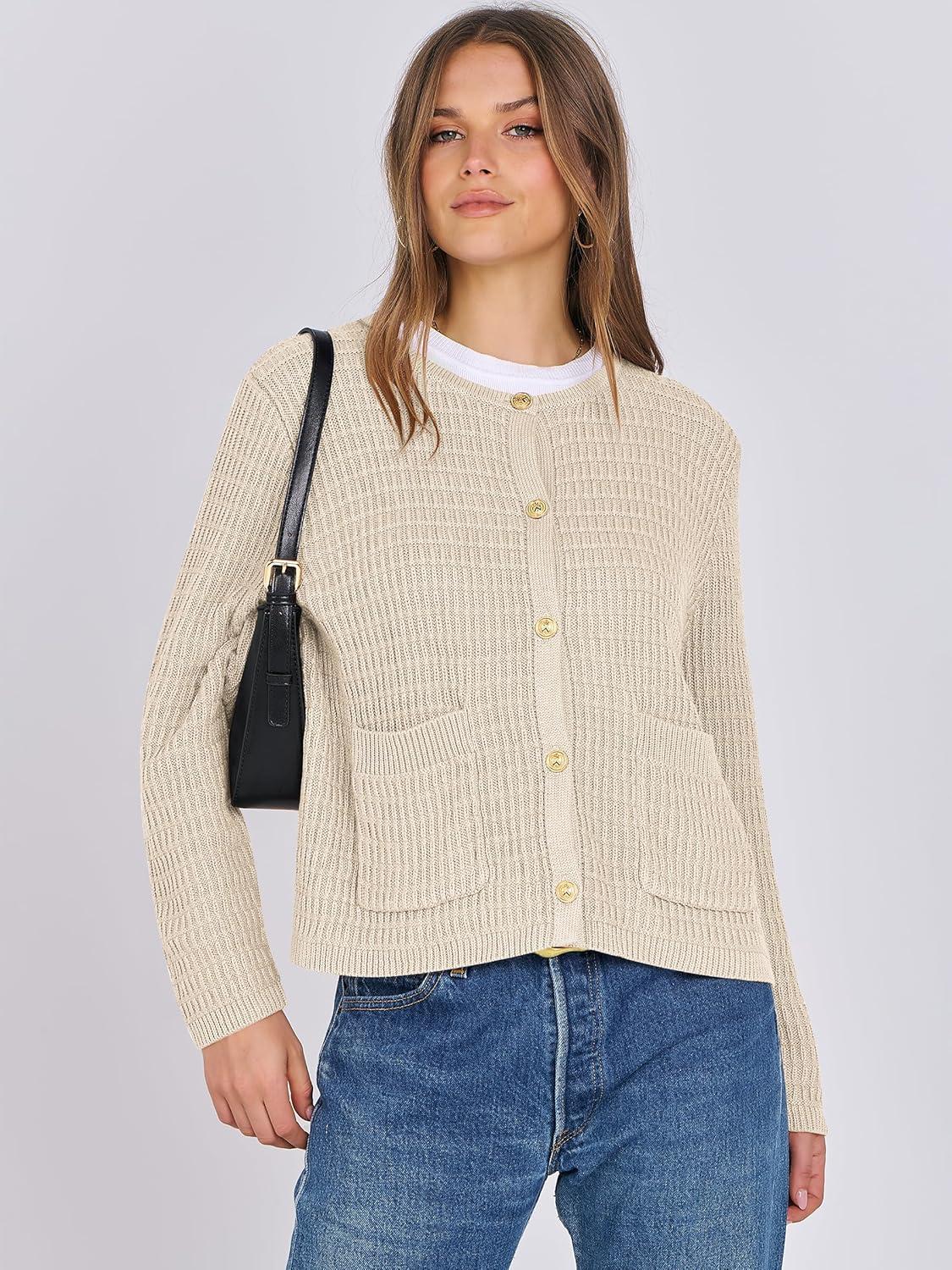 ANRABESS Women Cardigan Sweater Dressy Casual Classic Long Sleeve Crew Neck Button Down Tweed Knit Jacket 2026 Fall Outfits(Beige)