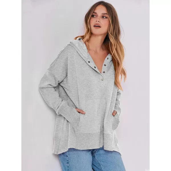 ANRABESS Women Casual Button V Neck Hoodies Oversized Pullover Sweatshirt Hooded Sweater Tops with Pockets(Light Gray)