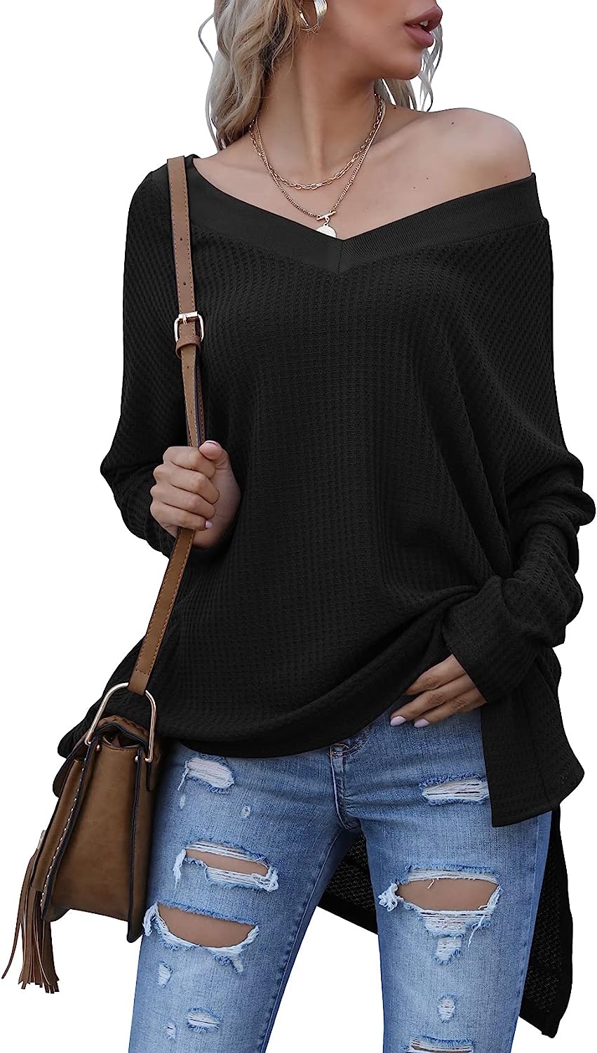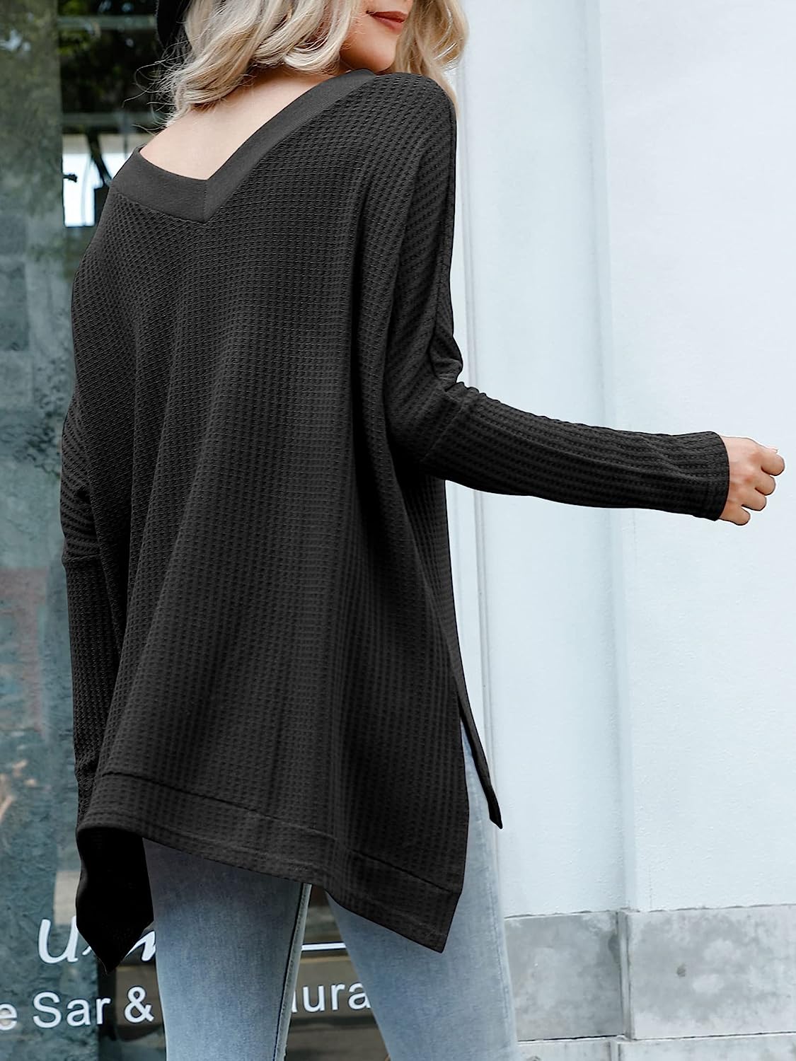 Features – This casual oversized pullover sweaters designed V neck, waffle knit, batwing sleeve, loose fit, high low hem, side slit, flattering tunic tops.