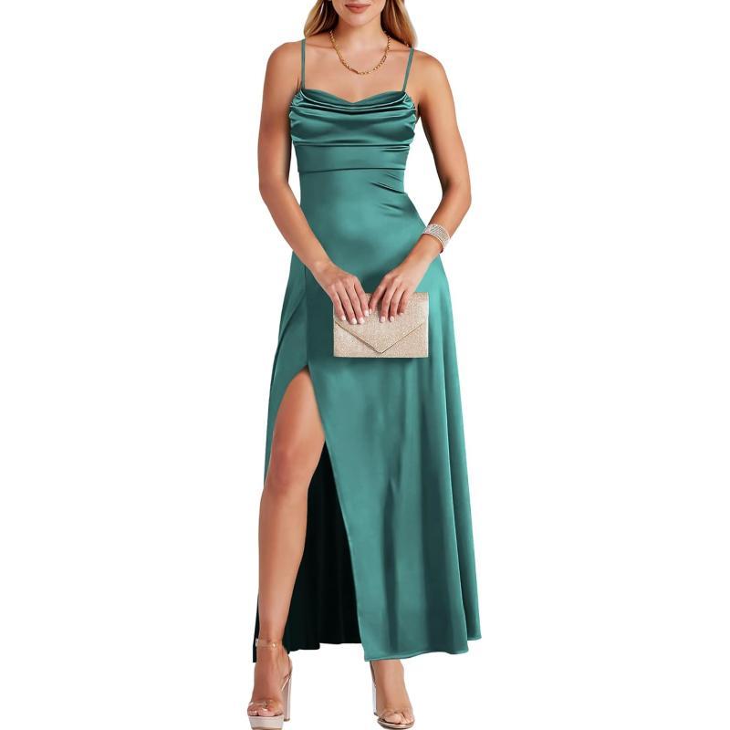 ANRABESS Women Formal Satin Spaghetti Strap Cowl Neck Bodycon Slit Prom Cocktail Maxi Dress Evening Party(Lake Green)