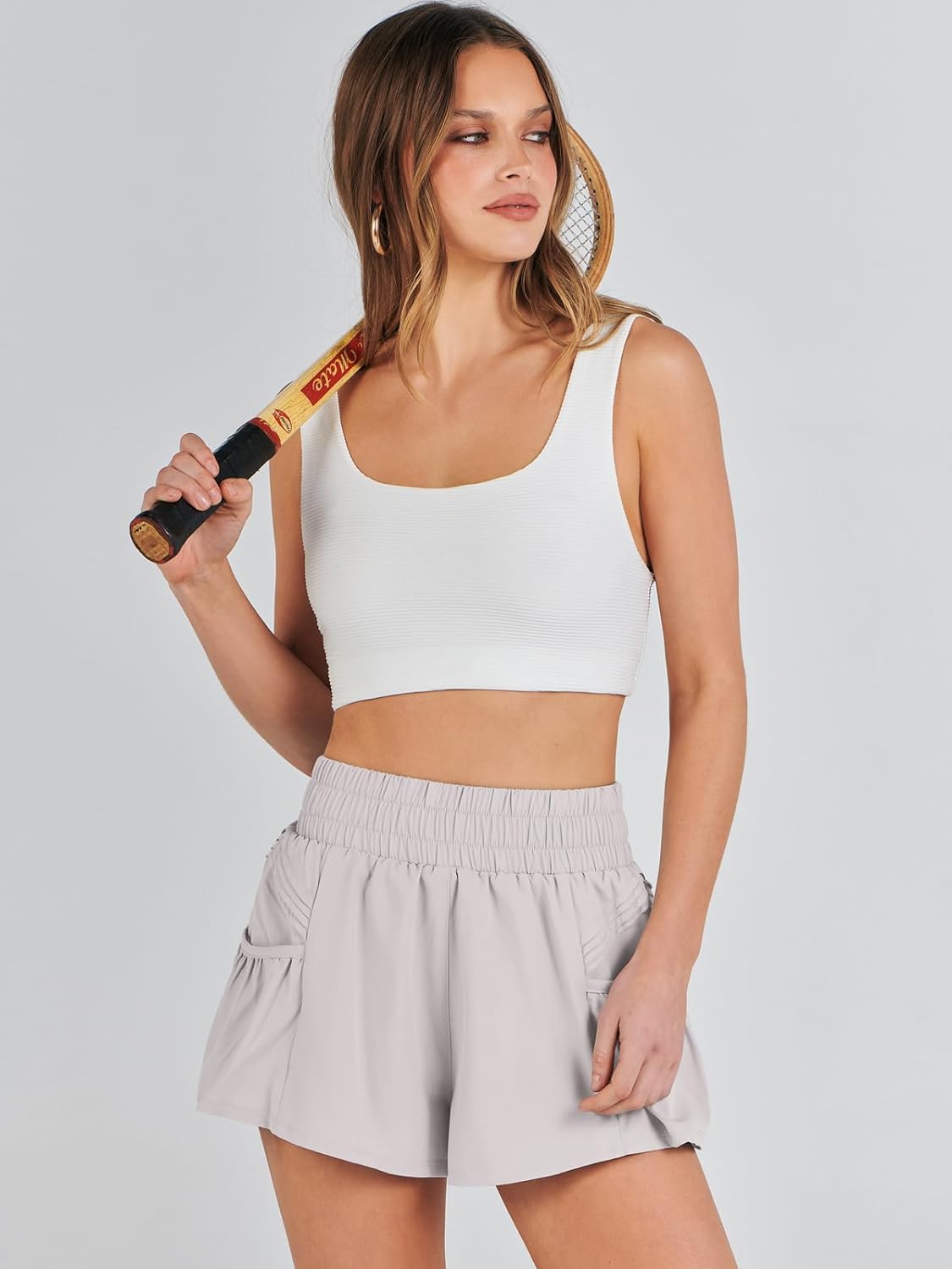 imageANRABESS Women High Waisted Quick Dry Flowy Shorts Gym Workout Running Athletic Short with PocketsGrey