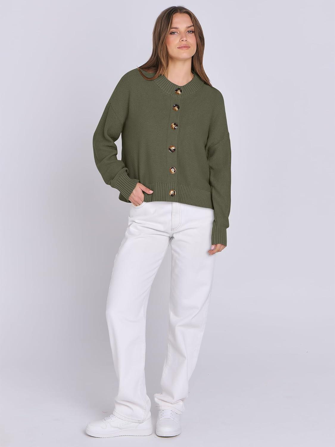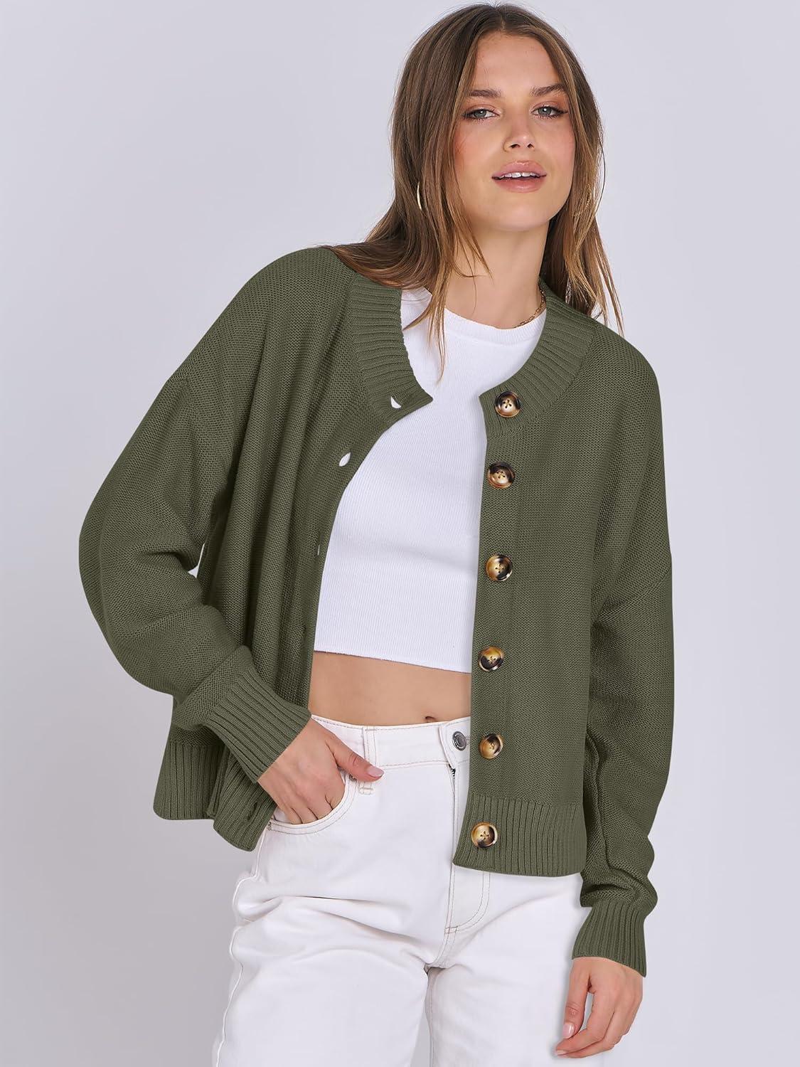ANRABESS Women Knit Cardigans Sweater Open Front Button Down Long Sleeve Cropped Lady Jacket Outwear 2025 Fall Outfits(Army Green)