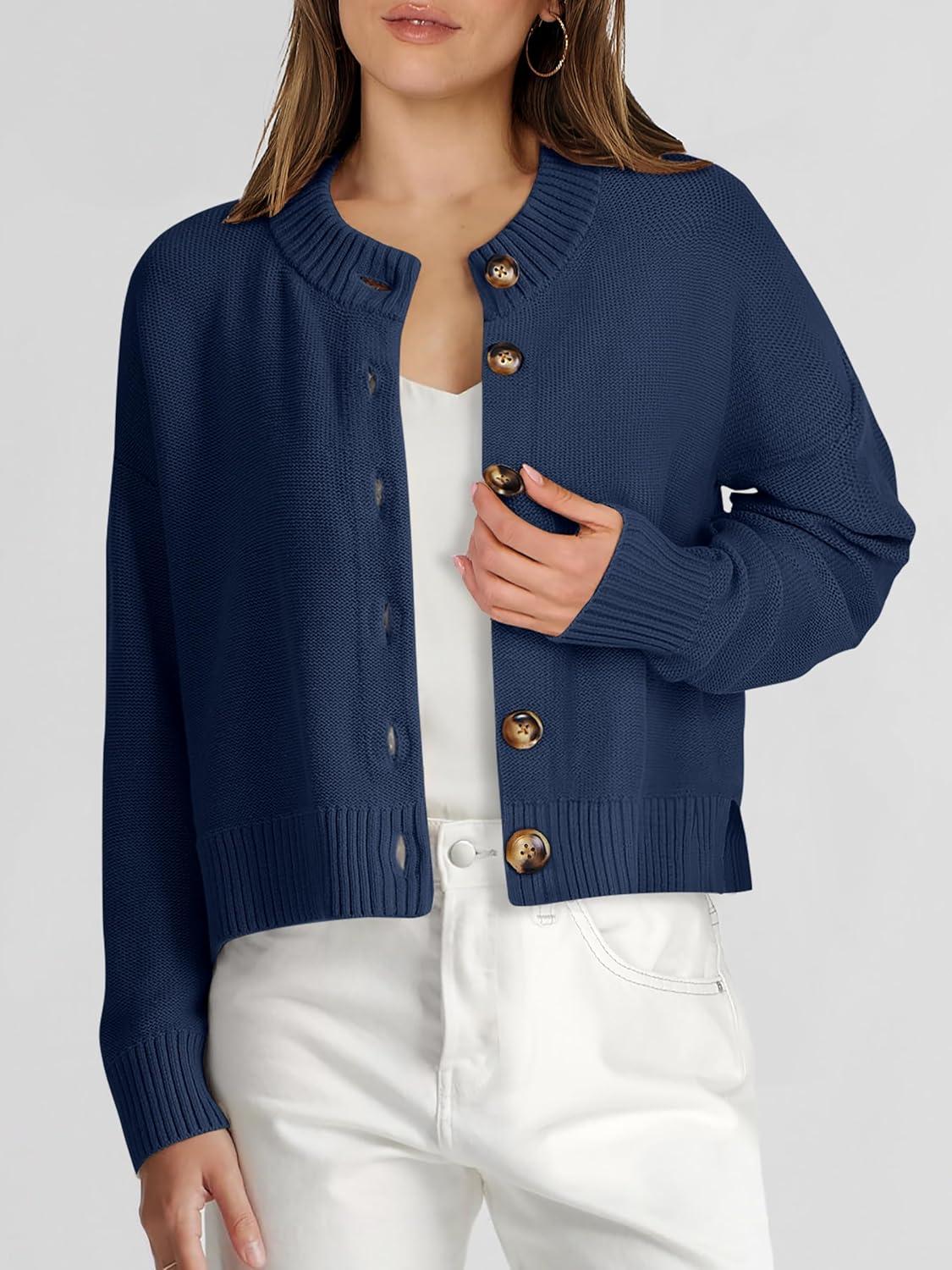 ANRABESS Women Knit Cardigans Sweater Open Front Button Down Long Sleeve Cropped Lady Jacket Outwear 2025 Spring Outfits(Deep Blue)