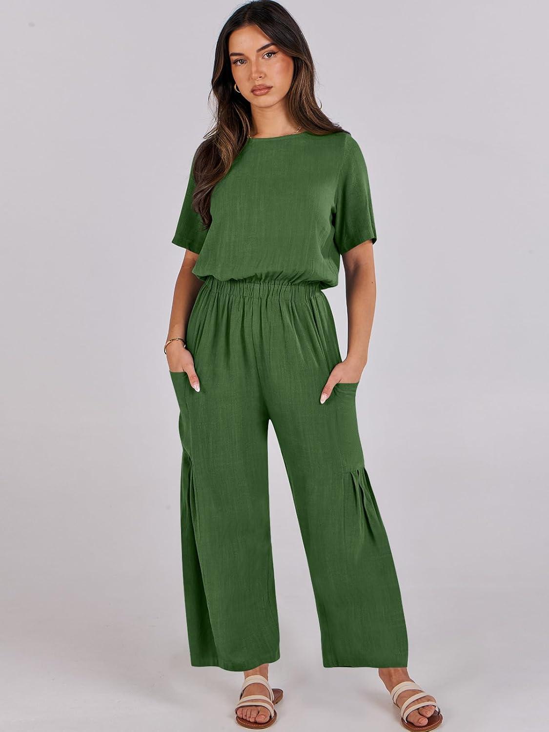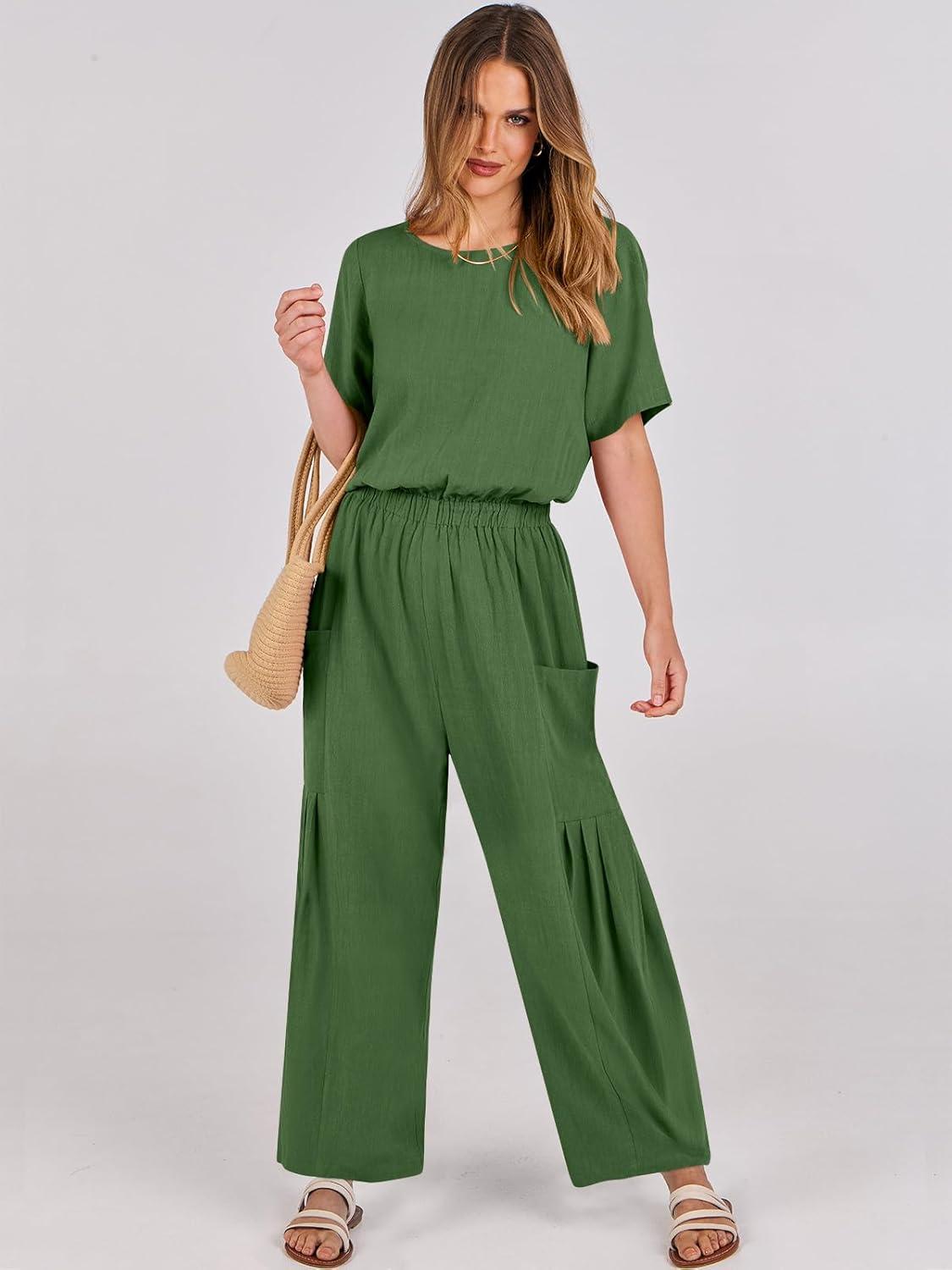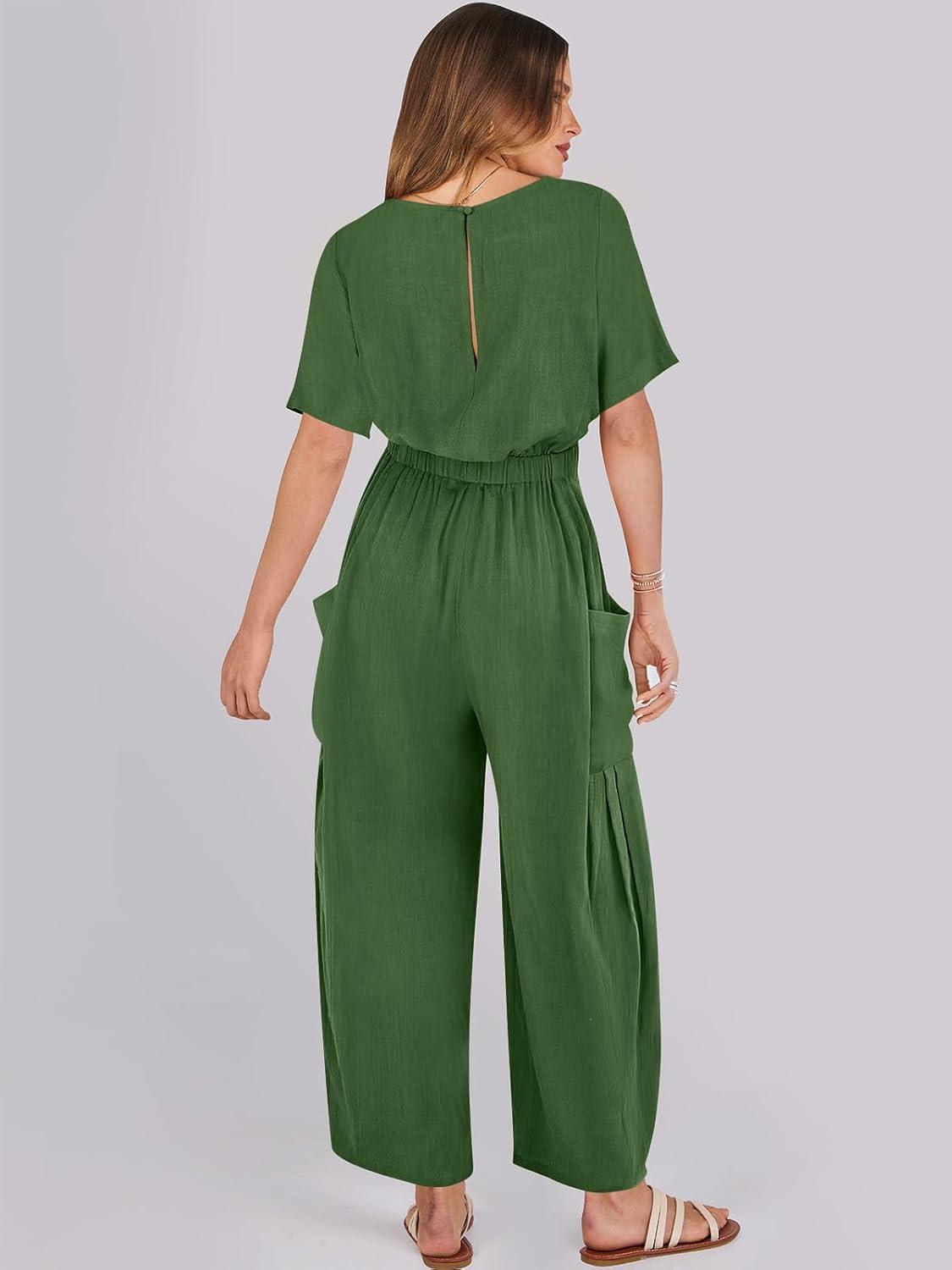 ANRABESS Women Linen Jumpsuits 2025 Summer Casual Loose Short Sleeve Wide Leg One Piece Jumper Romper Outfits Trendy Clothes(Green)