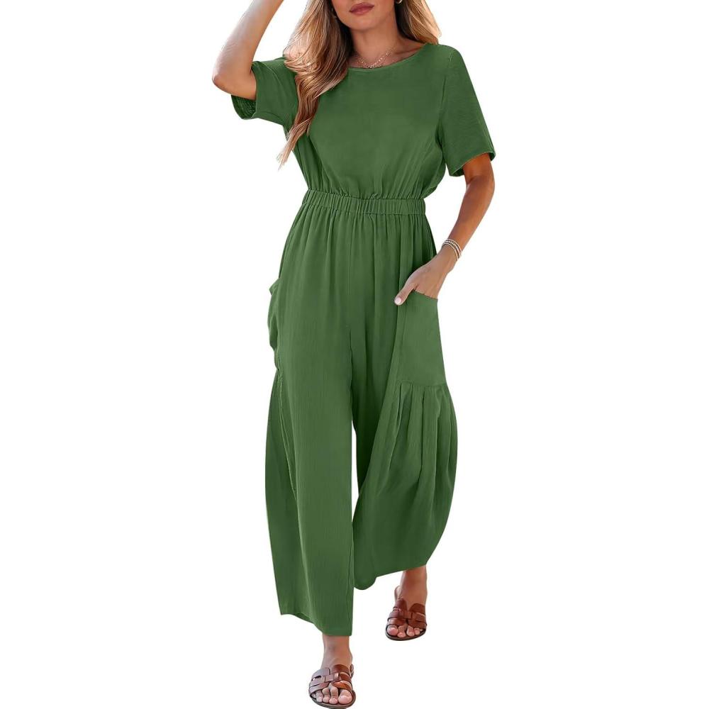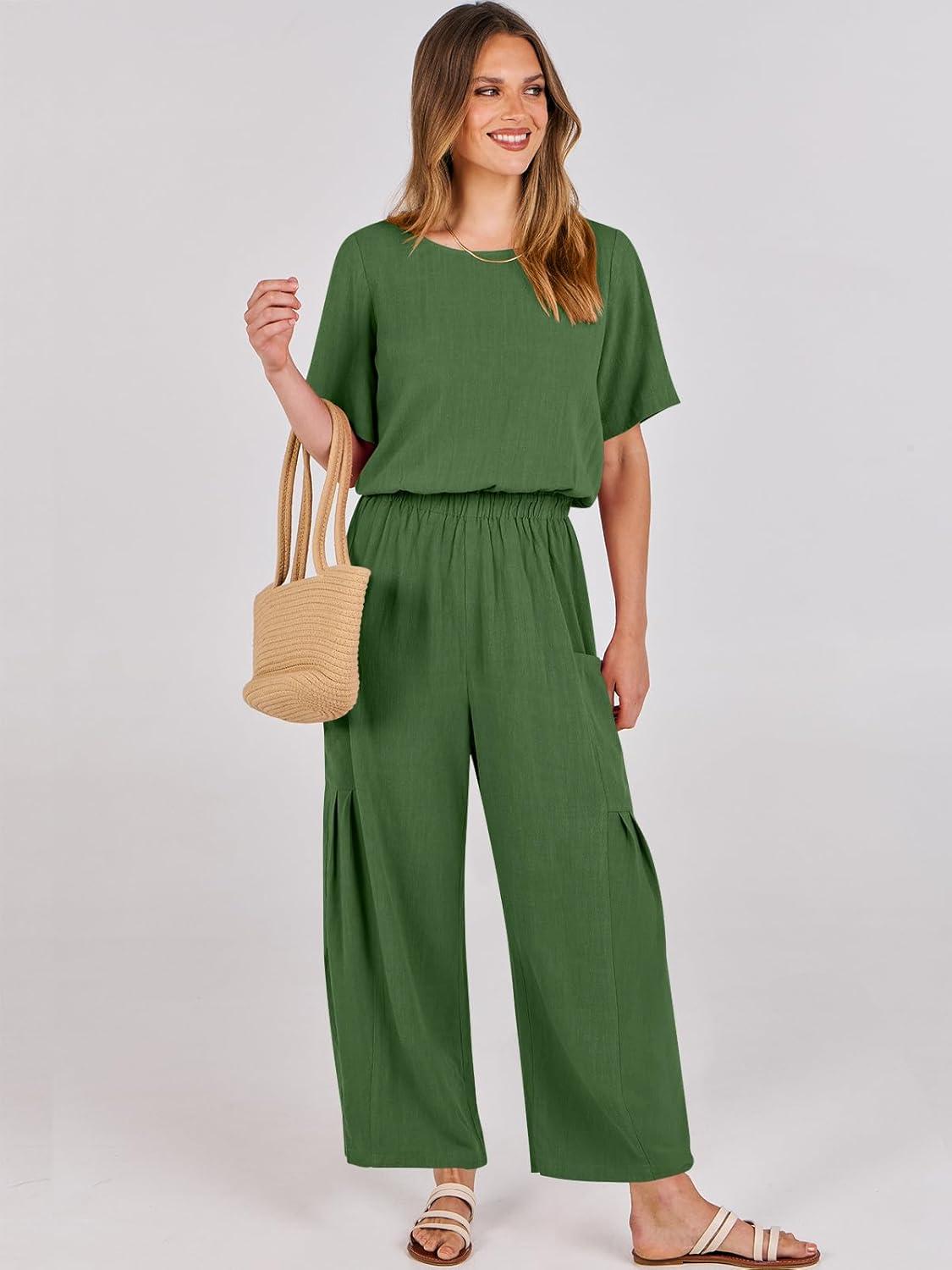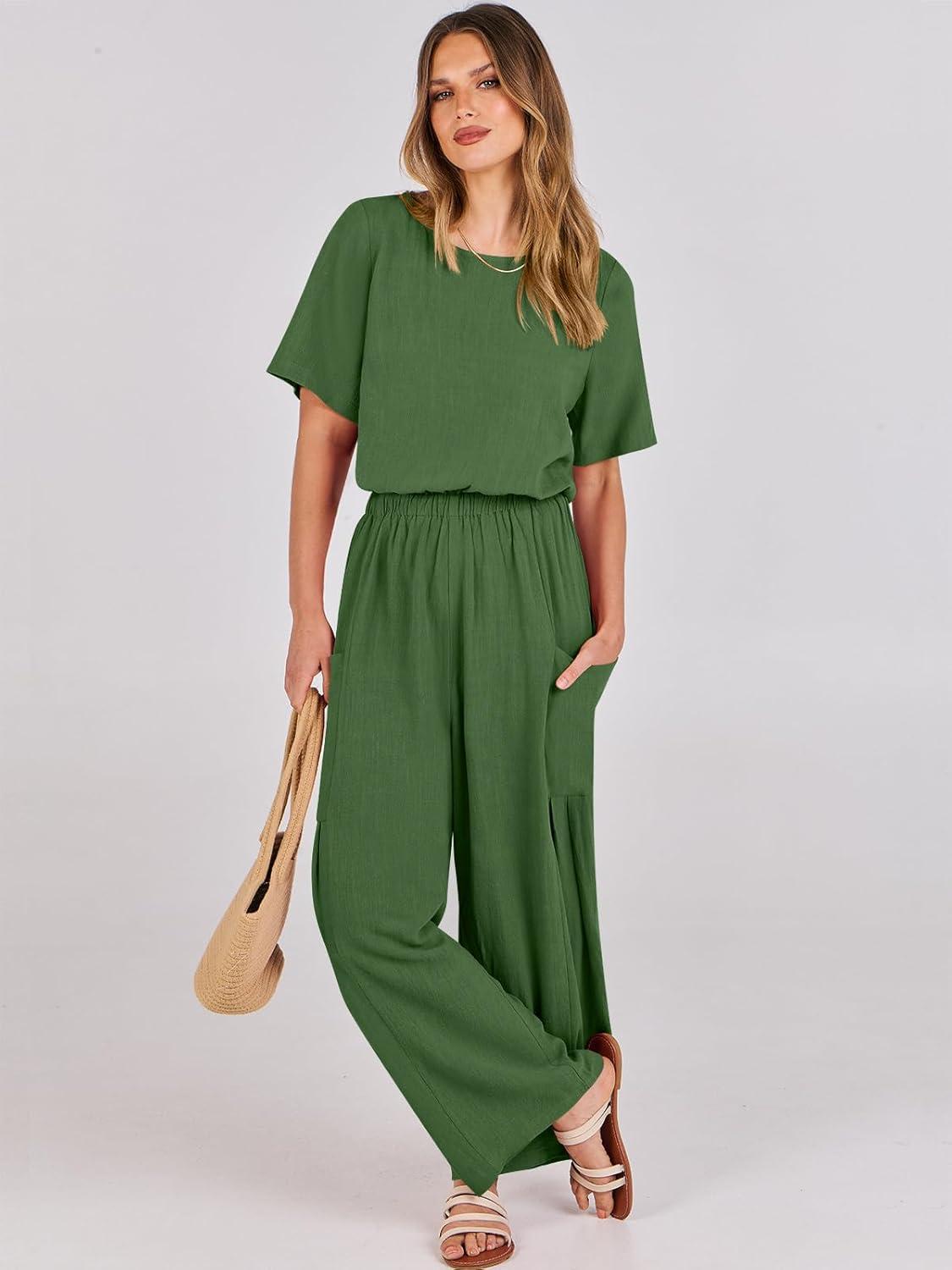 ANRABESS Women Linen Jumpsuits 2025 Summer Casual Loose Short Sleeve Wide Leg One Piece Jumper Romper Outfits Trendy Clothes(Green)