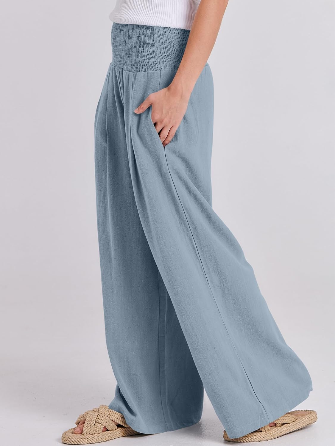 ANRABESS Women Linen Palazzo Pants Summer Boho Wide Leg High Waist Casual Lounge Pant Trousers with Pockets(Blue)