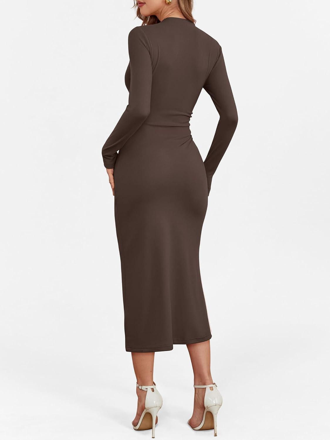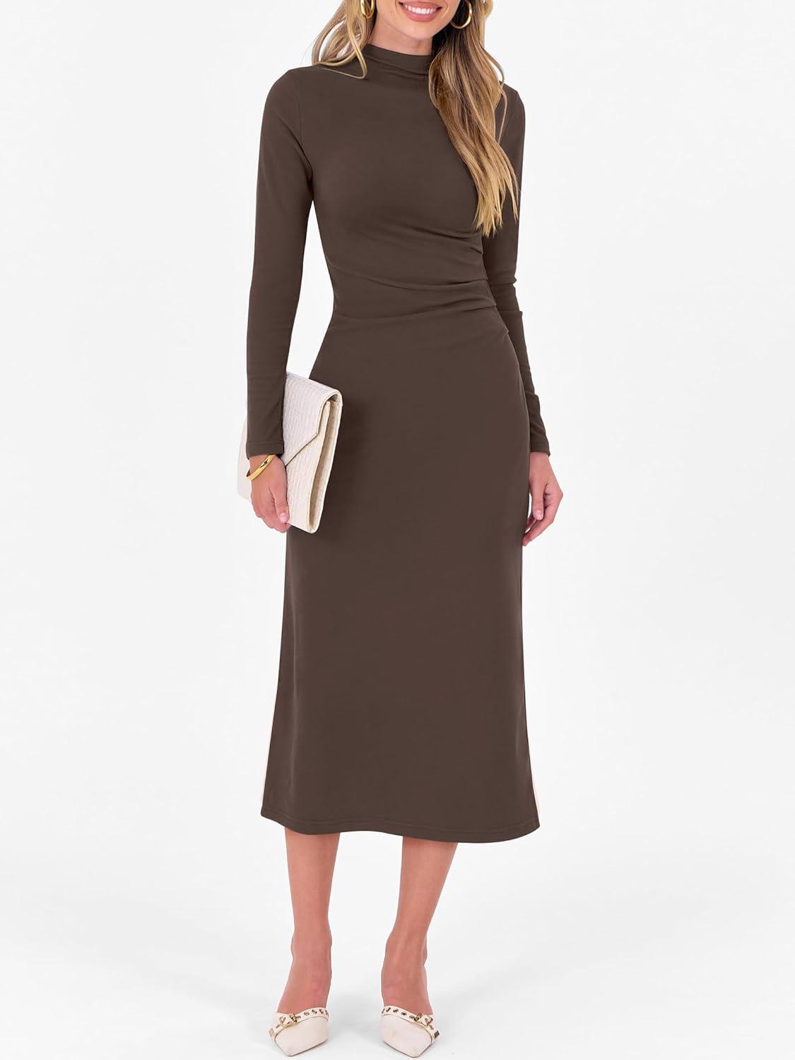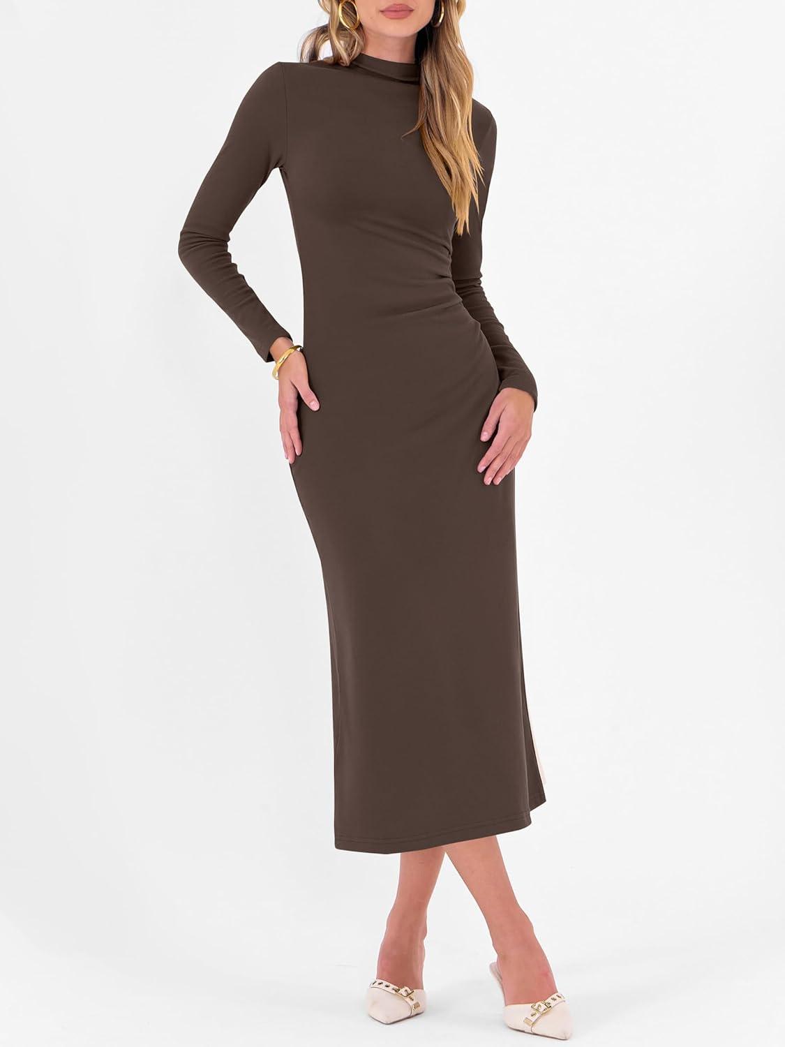 ANRABESS Women Long Sleeve Bodycon Dress Fall 2025 Mock Neck Formal Elegant Party Wedding Guest Cocktail Long Maxi Dresses(Coffee)