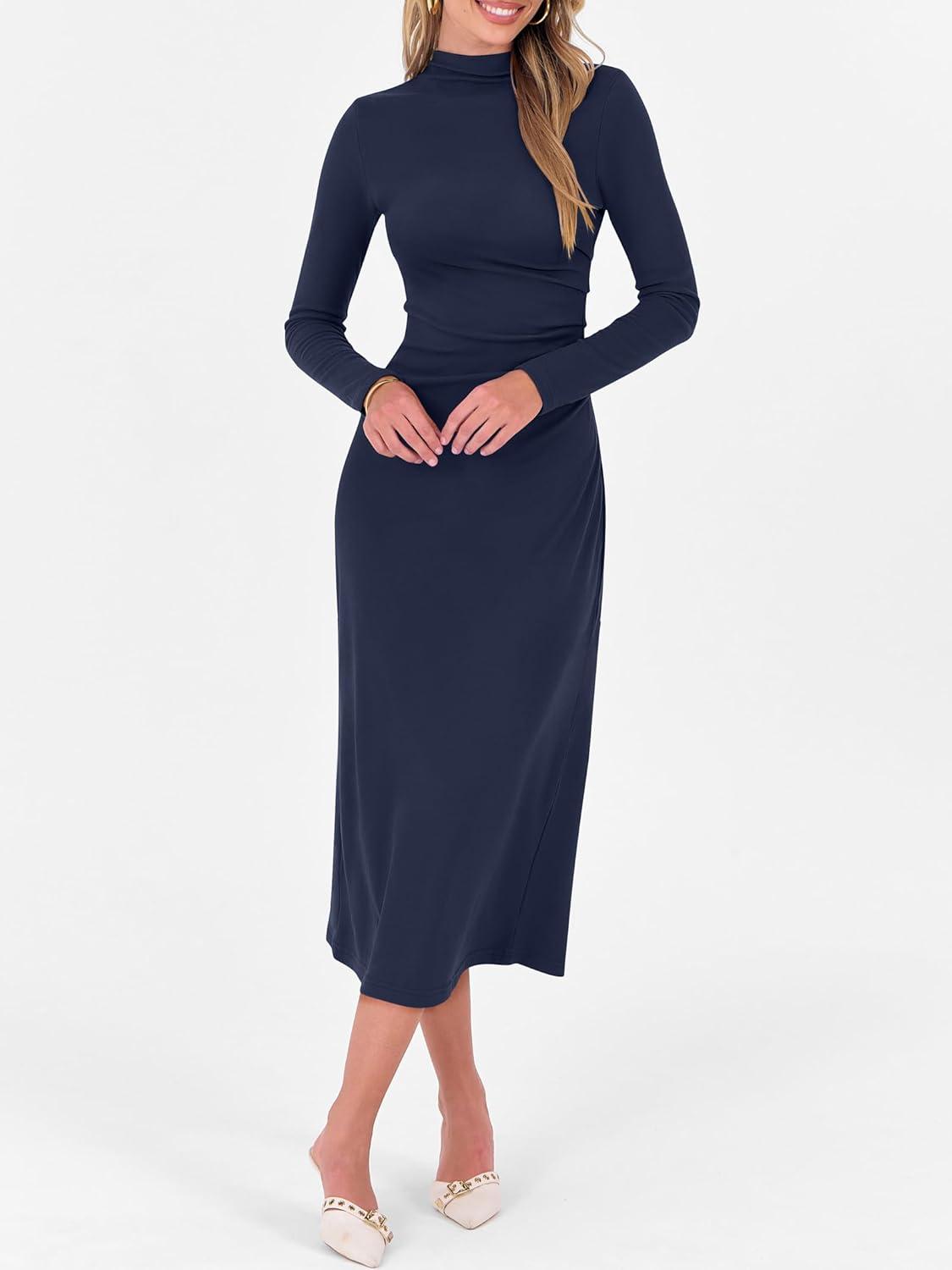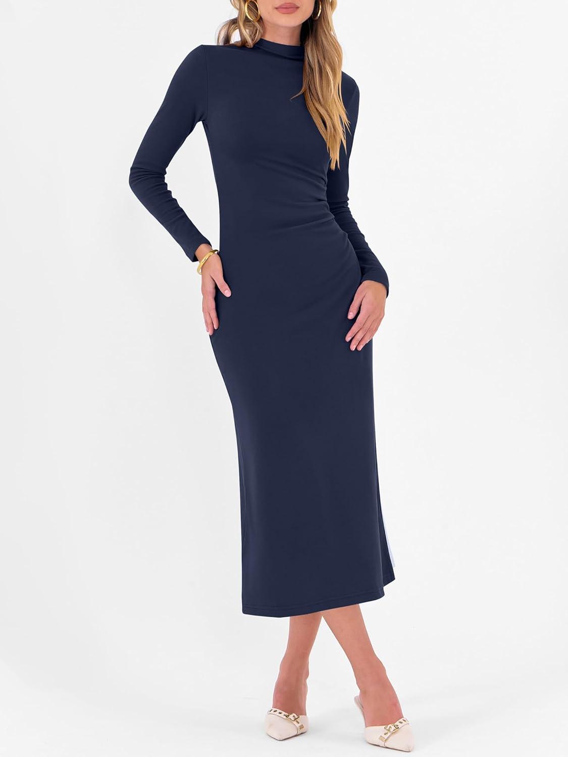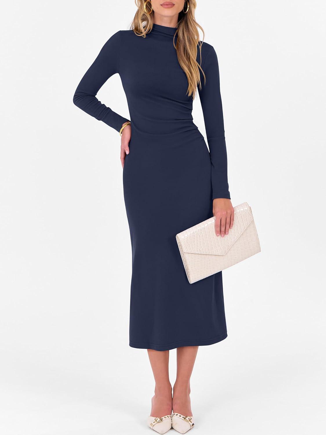 ANRABESS Women Long Sleeve Bodycon Dress Fall 2025 Mock Neck Formal Elegant Party Wedding Guest Cocktail Long Maxi Dresses(Navy Blue)