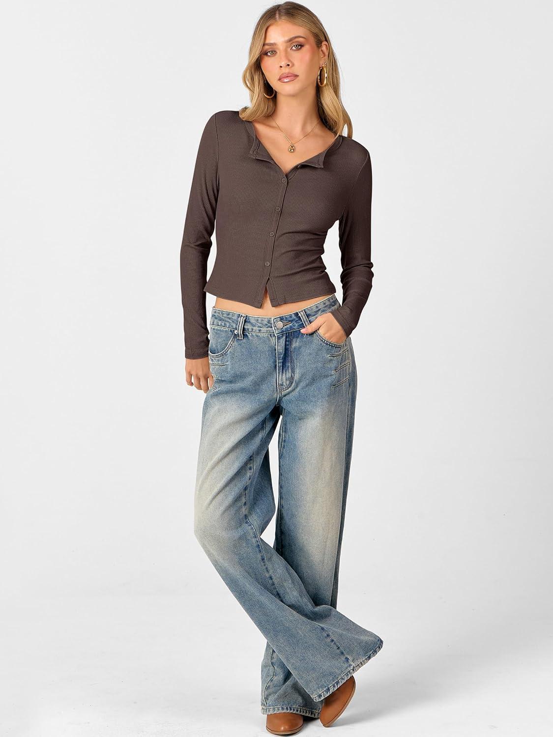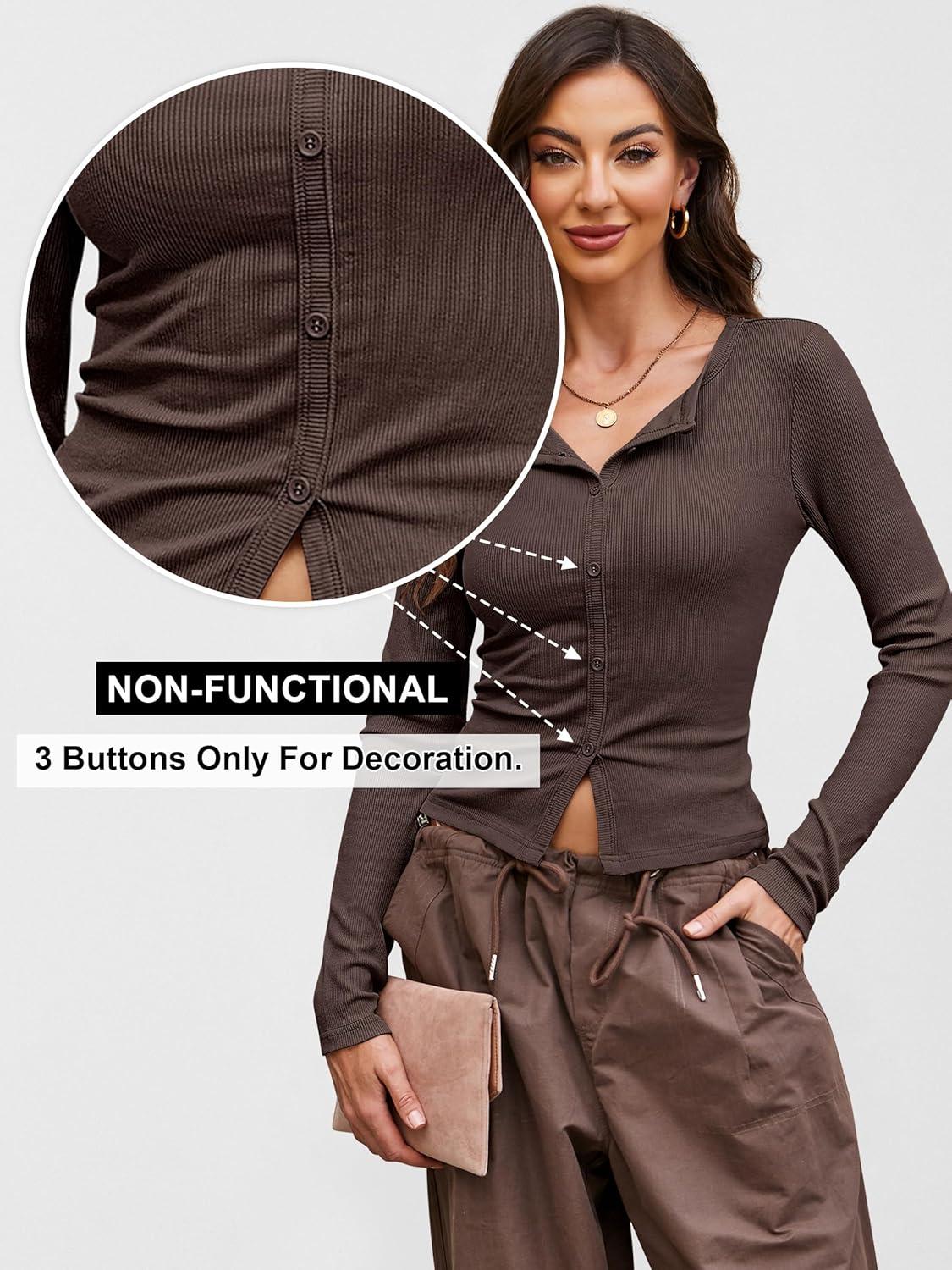 ANRABESS Women Long Sleeve Button Down Shirts Ribbed Knit Slim Fitted Crop Tops 2025 Fall Y2K Dressy Casual Trendy Outfits(Coffee)