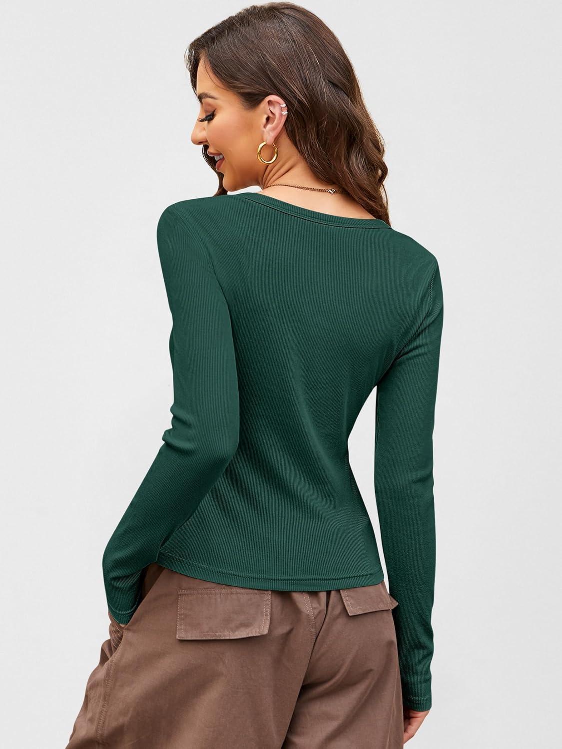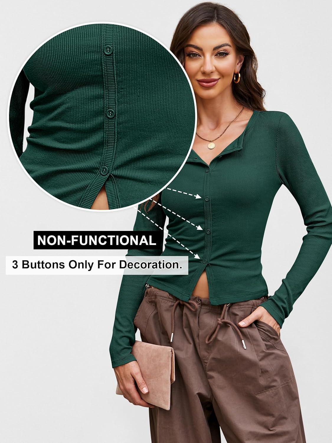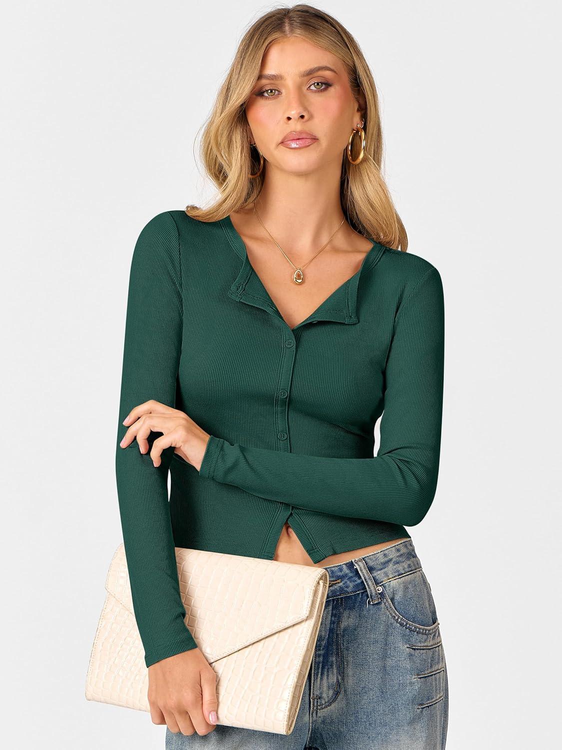ANRABESS Women Long Sleeve Button Down Shirts Ribbed Knit Slim Fitted Crop Tops 2025 Fall Y2K Dressy Casual Trendy Outfits(Deep Green)