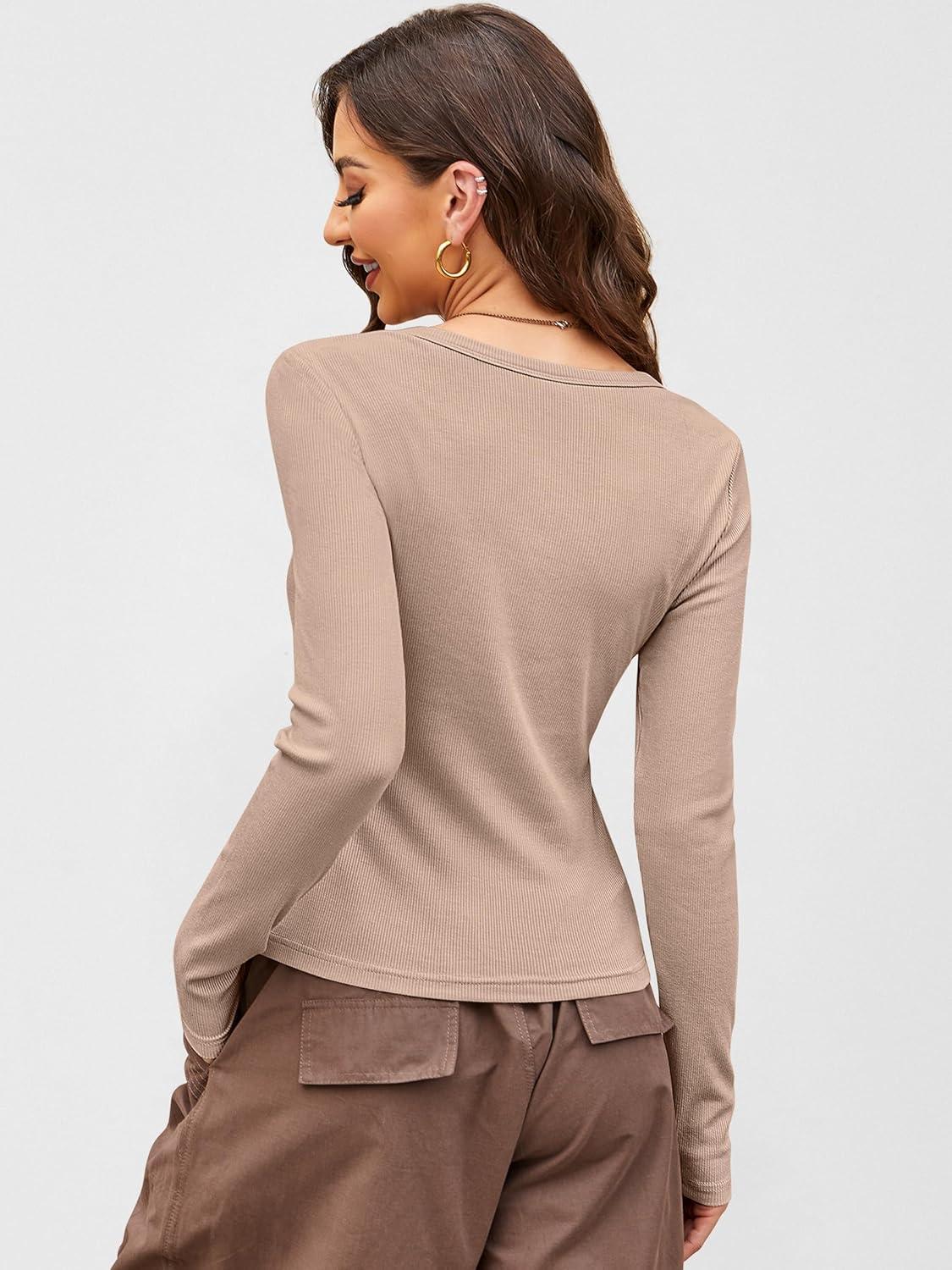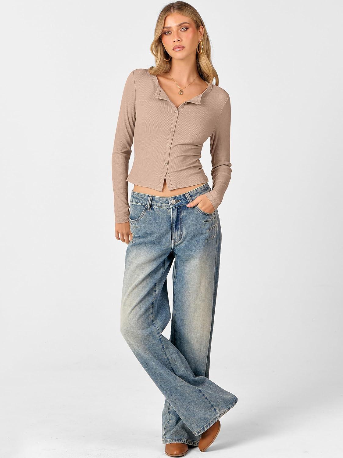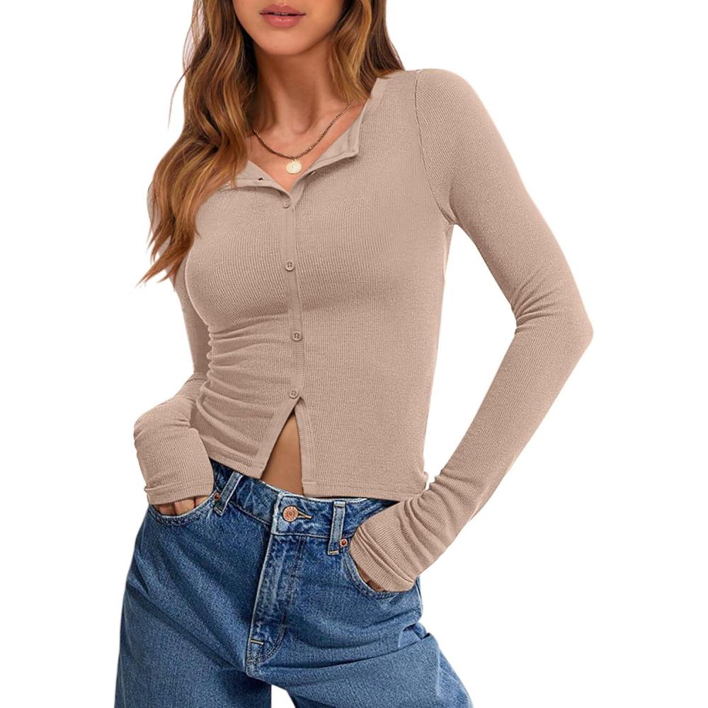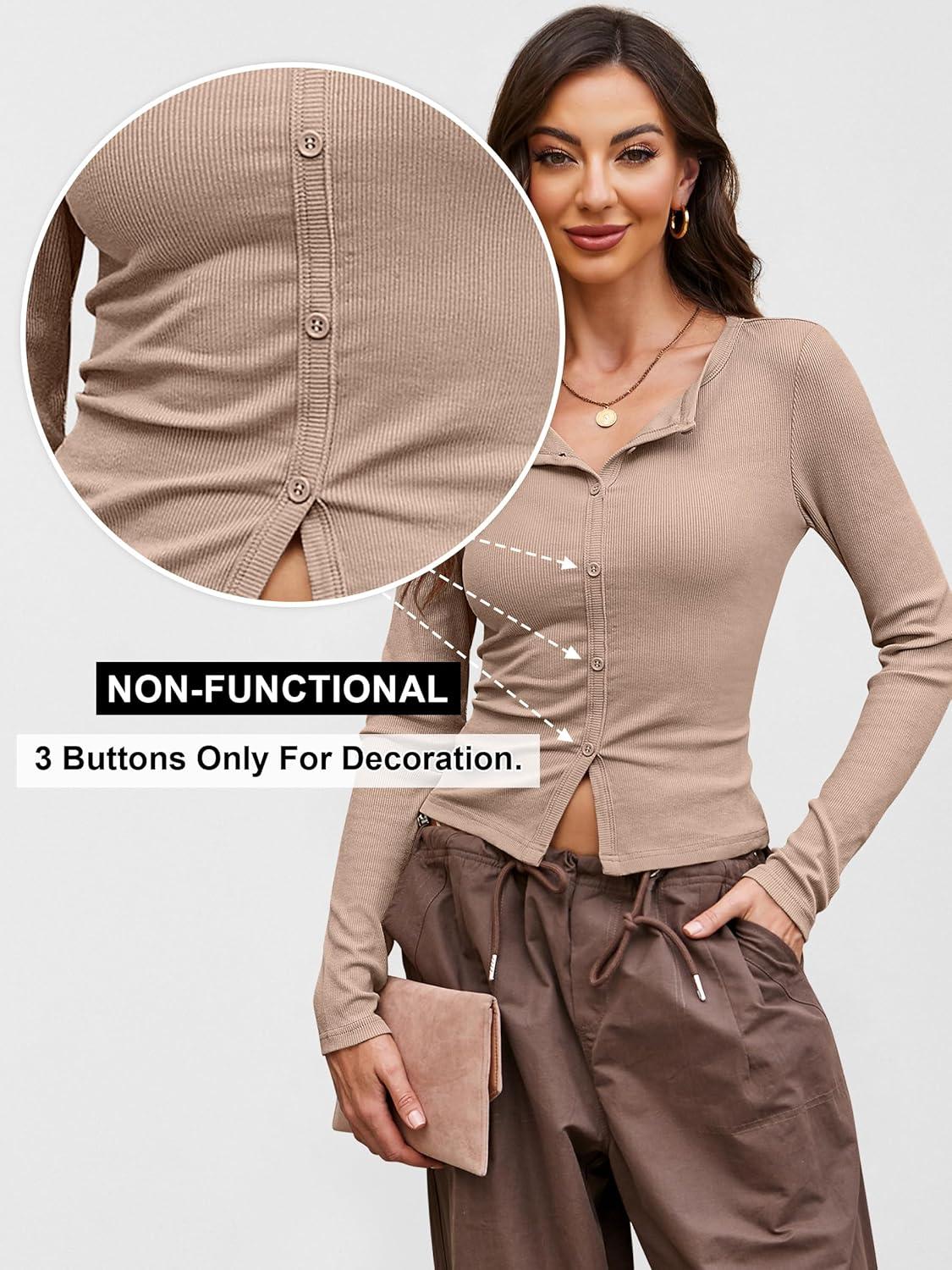ANRABESS Women Long Sleeve Button Down Shirts Ribbed Knit Slim Fitted Crop Tops 2025 Fall Y2K Dressy Casual Trendy Outfits(Light Camel)
