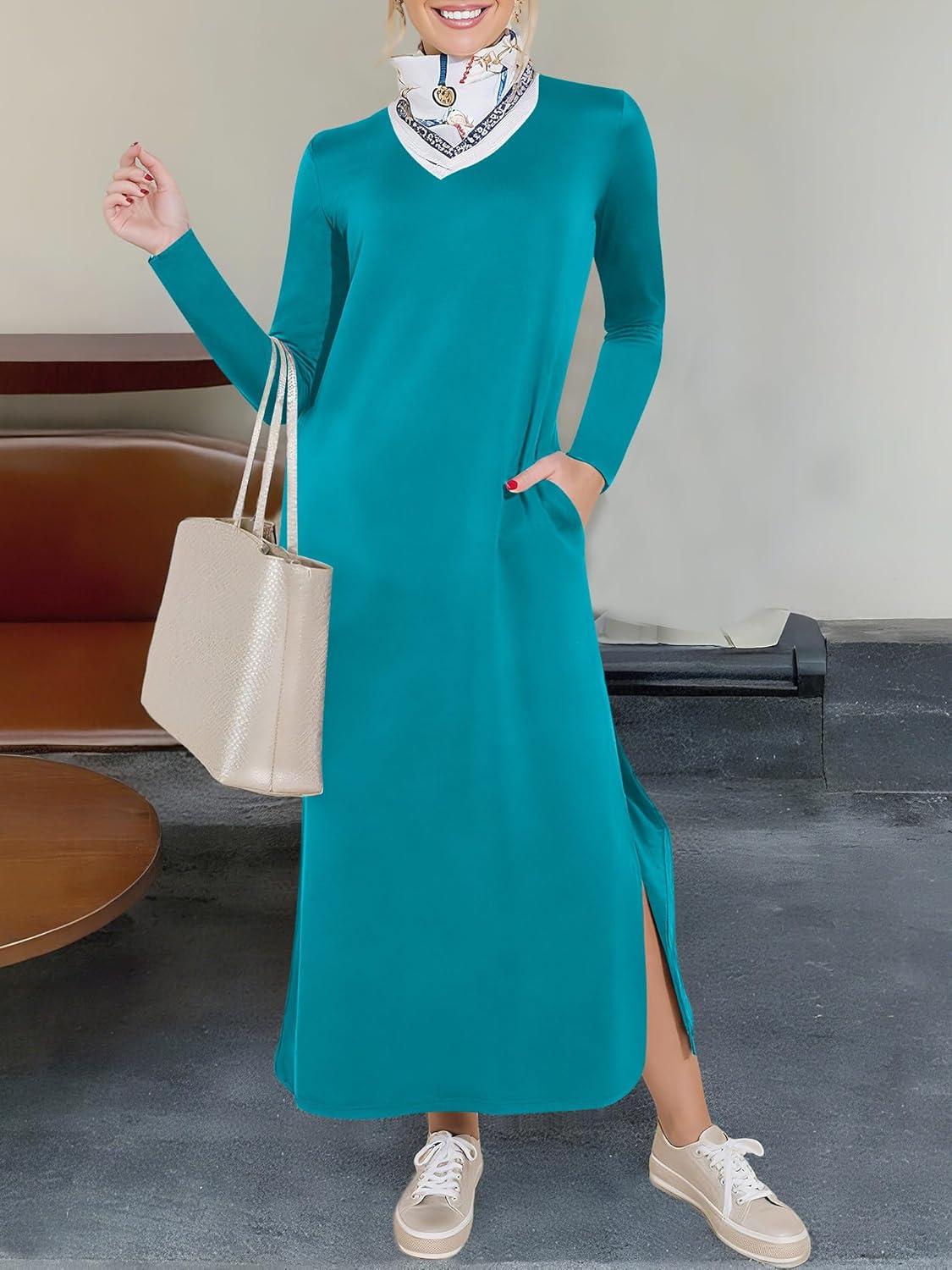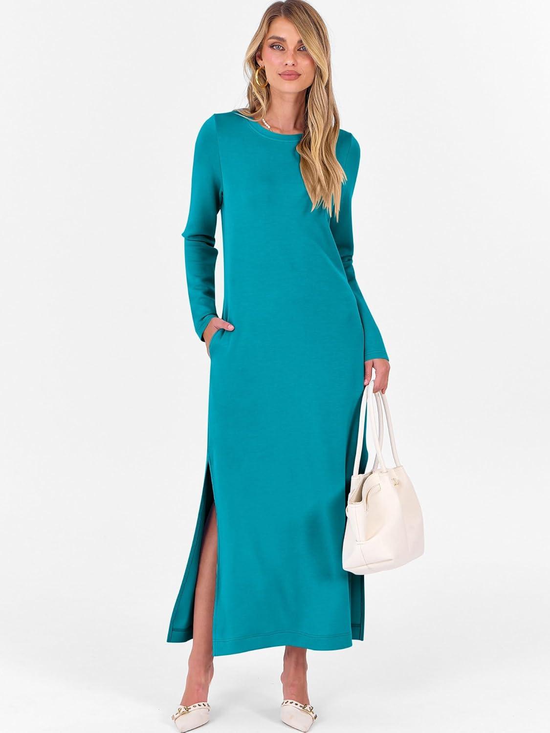 ANRABESS Women Long Sleeve Dresses 2025 Fall Casual Crewneck Loose Fit Split Flowy Wrinkle-Free Travel Vacation Maxi Dress(Lake Blue)