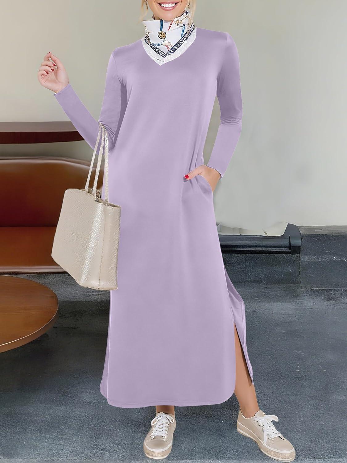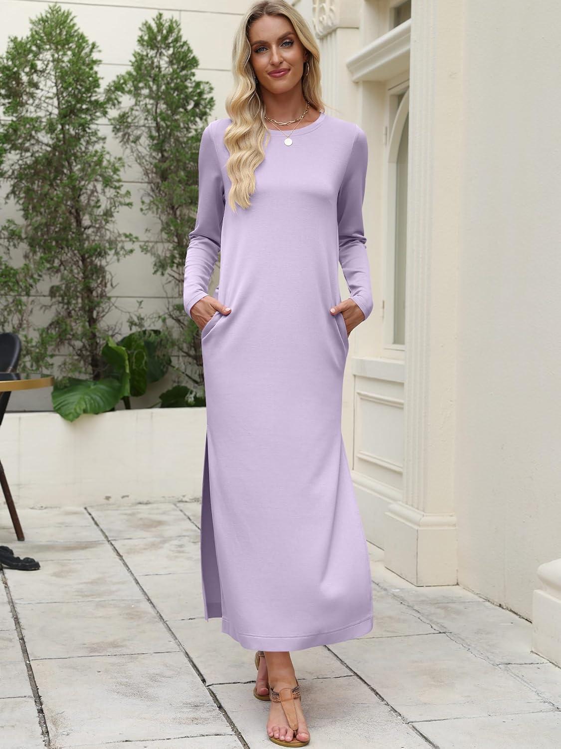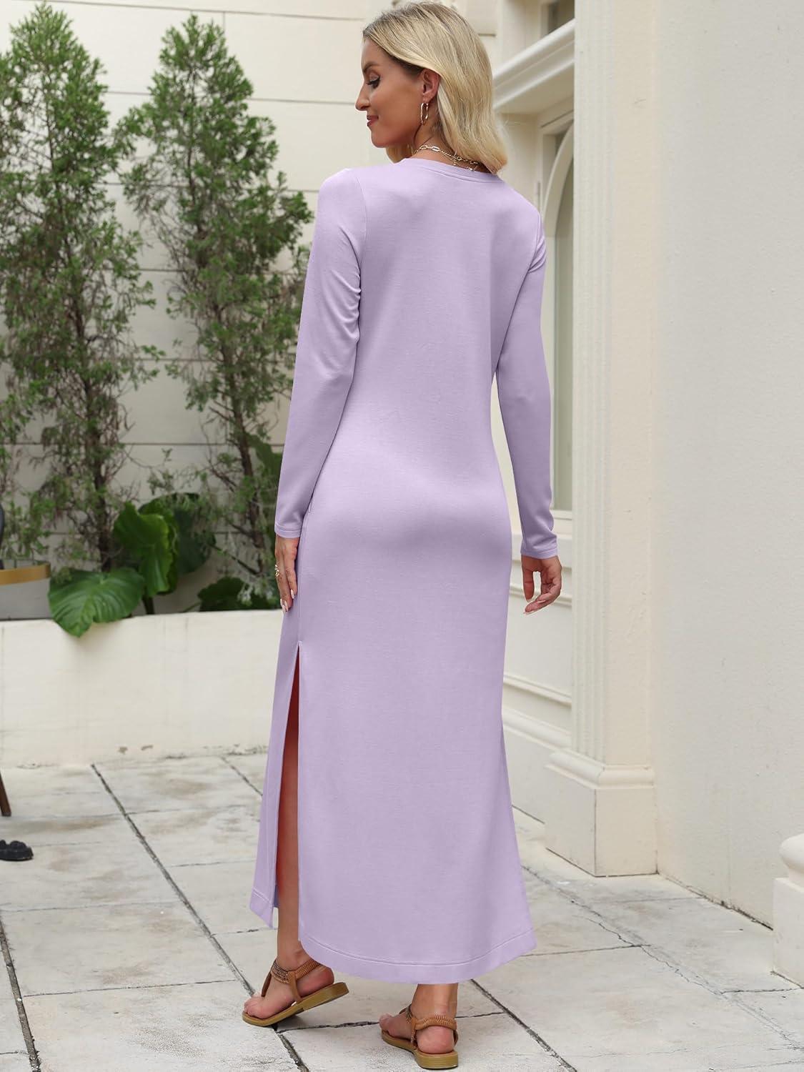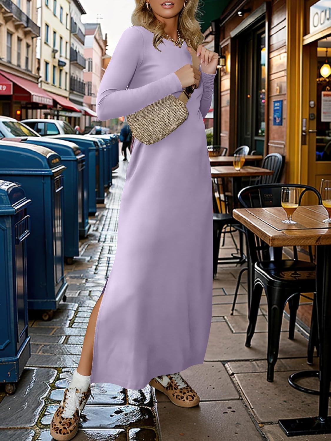 ANRABESS Women Long Sleeve Dresses 2025 Fall Casual Crewneck Loose Fit Split Flowy Wrinkle-Free Travel Vacation Maxi Dress(Light Purple)